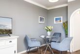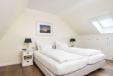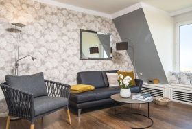 Ein Traumblick gleich über beide Meere bis zum Quermarkenfeuer und weiter hoch in den Norden über das Wattenmeer nach List bietet sich aus dem tiefen, von Sitzkissen gesäumten Panoramafenster des Wohnzimmers. Der große Vorzug des Appartementhauses Kampbarg ist seine Lage in der Kurhausstraße, im Herzen des renommierten Dorfes. Die Wohnung Nummer 36 liegt im ersten Stock und ist hochwertig, modern und originell eingerichtet. Neben dem Wohnzimmer befindet sich auf dieser Ebene zudem eine kleine separate Küche und ein Duschwannenbad unter der Schräge. Eine schmale Treppe führt hinauf in das behagliche und hochwertig eingerichtete Doppelschlafzimmer und hat einen traumhaften Blick durch das Dachfenster in den Sternenhimmel.
