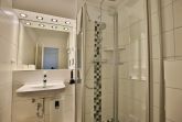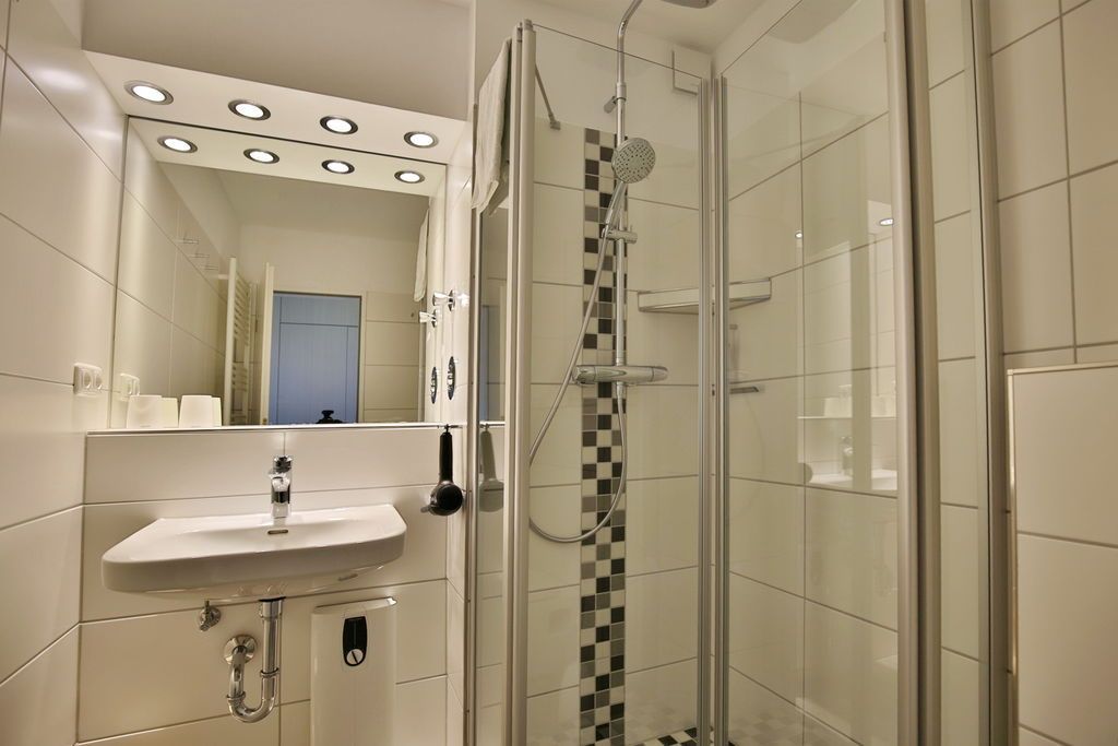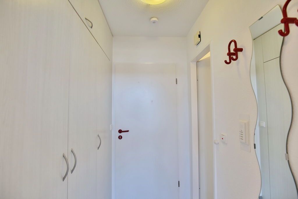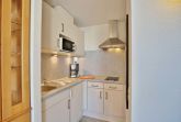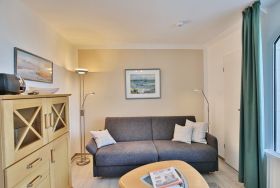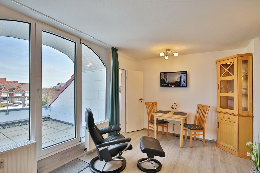 1-Raum-Appartement auf ca. 28m², 4. Etage, Nichtraucher, modern eingerichtet und komplett ausgestattet bis 2 Pers.,1 kombiniertes Wohn/Schlafzimmer mit Schlafsofa (Liegefläche 1,60m x 2,00m), SAT-TV, Stereoanlage mit Bluetooth, kostenloses W-Lan, neue Küchenzeile mit Mikrowelle, Senseo-Kaffeepadmaschine, Eierkocher; Dusche/WC, Flur, schöne Dachterrasse (ost) mit Sonnenschirm u. Seesicht, keine Haustiere, nummerierter Pkw-Stellplatz #411 auf dem Außengelände.