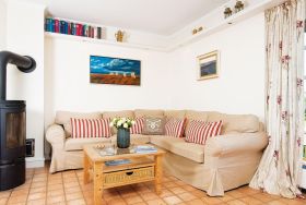 Gemütlichkeit trifft Landhauscharme: Zum WohlfühlStandard gehören eine große Terrasse mit Strandkorb, der Traumblick durch die große Fensterfront nach Nordwesten, ein Kaminofen für romantische Abende vor dem gemütlichen Sofa und die in den Wohnraum int...