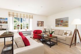 Diese Haushälfte mit Einzelhauscharakter liegt zentral an der Hauptstraße, erreichbar über einen romantisch eingewachsenen Stichweg. Landhausflair trifft Farbakzent, das ist hier Programm. Ein luftiges Entrée samt Gäste-WC begrüßt Sie auf dem Weg in den offenen WohnEssbereich mit Kamin, bequemen Sofas und gleich zwei Terrassentüren. Eine geht nach Osten, wo man den ersten Kaffee auf der Bank in der Morgensonne genießen kann und die zweite gen Süden mit hübsch angelegter Terrasse und Essplatz. Im Obergeschoss erwartet Sie ein kleiner Arbeitsplatz auf der Galerie, sowie ein verwunschen winkeliges Doppelschlafzimmer mit großem Einbauschrank und Wannenbad en suite. Ebenso auf dieser Ebene, ein weiteres Einzelschlafzimmer mit Duschbad en suite. Im Untergeschoss gibt es gleich zwei hübsche Doppelschlafzimmer, viel Stauraum in den Einbauschränken und ein geräumiges Duschbad. Der Clou auf dieser Etage ist die Dampfsauna, entspanntes Syltfeeling ist also bei jedem Wetter garantiert. Das ganze Haus ist in hellen Farbt