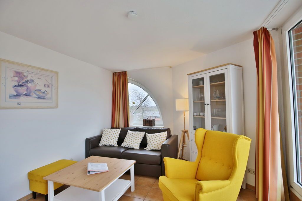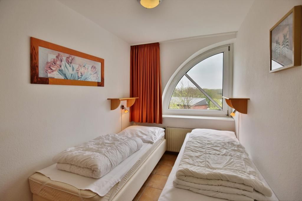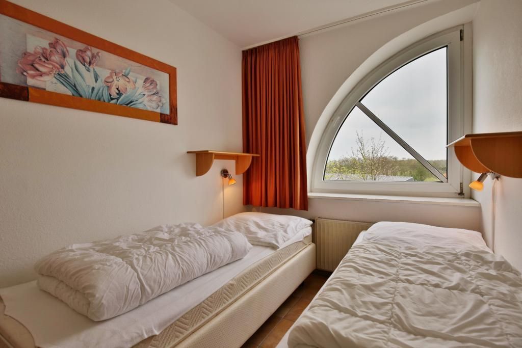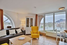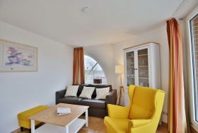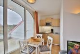 2-Raum-Eckwohnung auf ca. 35m², 4. Etage, komplett ausgestattet bis 3 Pers., 1 Schlafzimmer mit 2 Einzelbetten), 1 kombiniertes Wohn/Schlafzimmer mit Eckschlafcouch, alles gefliest, SAT-TV, kostenloses W-Lan, Küchenzeile mit Mikrowelle, Dusche/WC, Flur, Dachterrasse (west), reservierter Pkw-Stellplatz #412 auf dem Außengelände, keine Haustiere gestattet und natürlich Nichtraucher.