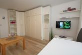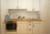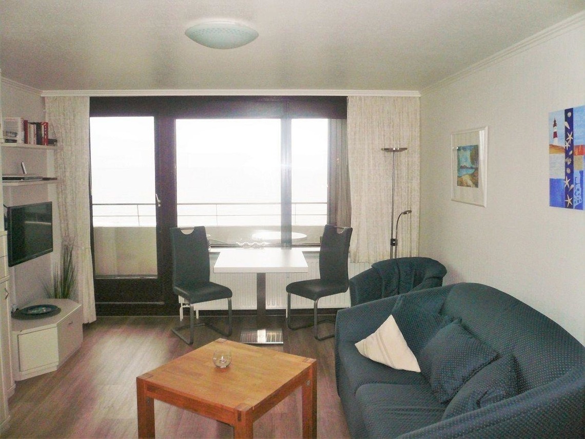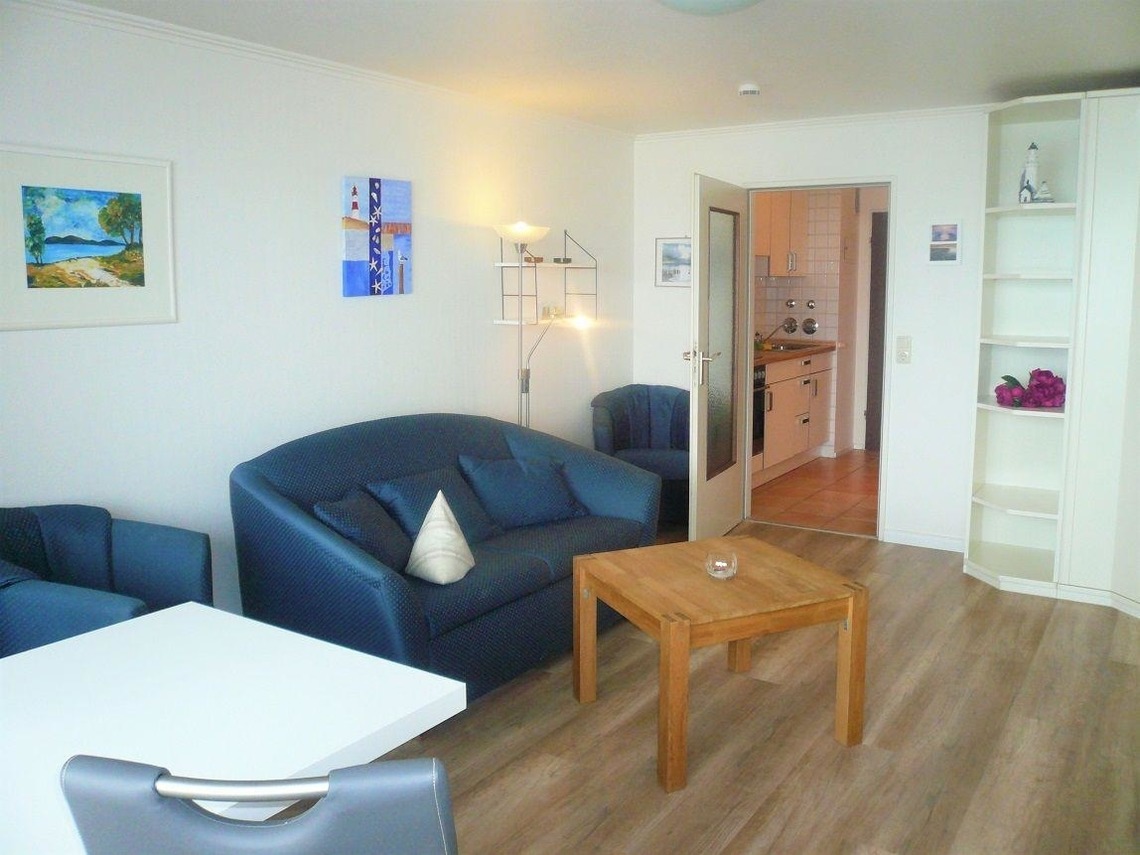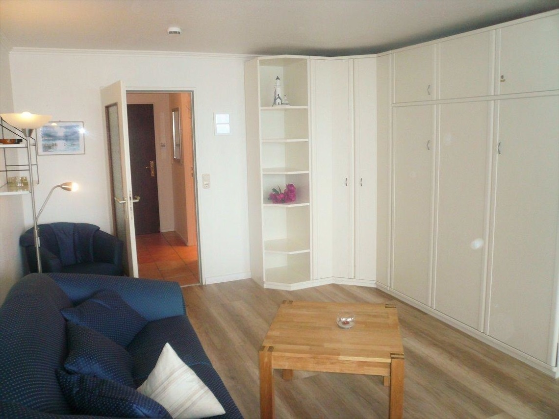Im Wohnzimmer stehen eine Couchgarnitur und der Essplatz. In der weißen Schrankwand ist ein Doppelschrankbett untergebracht. Vom Balkon hat man einen freien Blick auf das Meer. Die Küche, die sich im Flur des Appartements befindet, hat einen Backofen. Das Bad ist mit einer Dusche versehen.