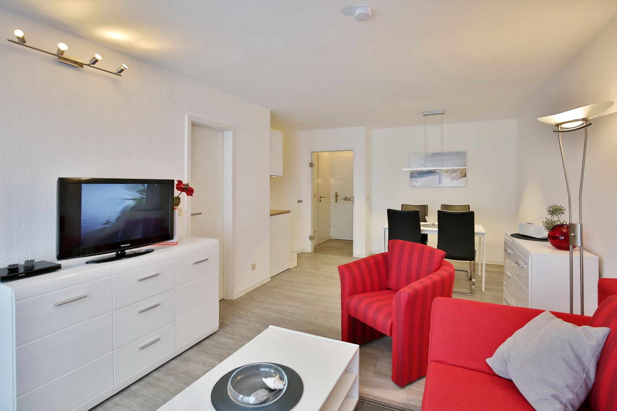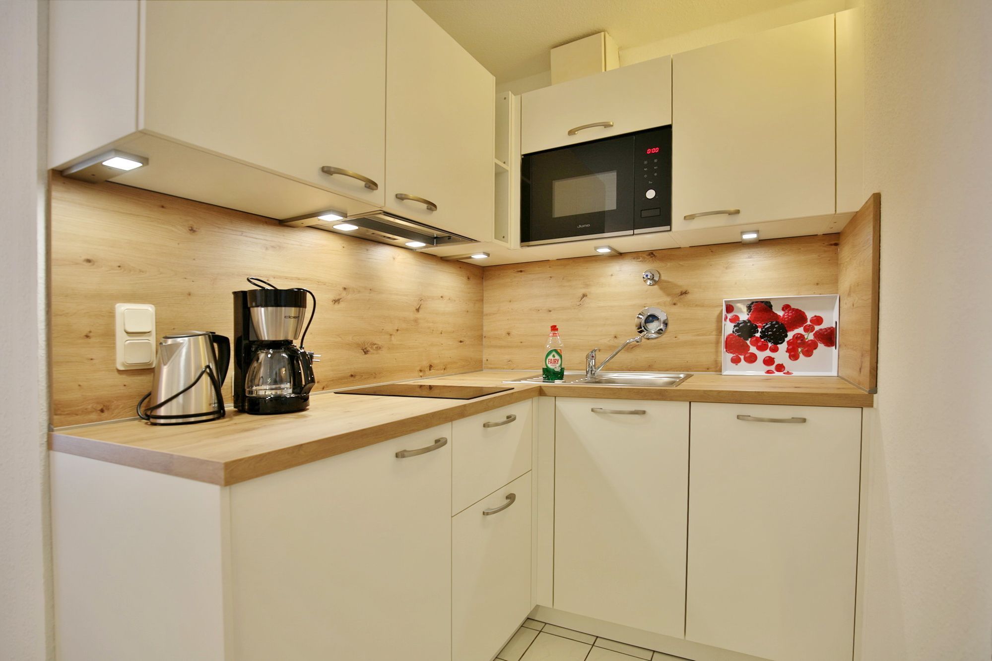 Renovierte 2-Raum-Wohnung auf ca. 45m², parterre, komplett ausgestattet bis 3 Pers., 1 Schlafzimmer mit Doppelbett, 1 kombiniertes Wohn/Schlafzimmer mit Doppelbettcouch, Sat-TV, DVD-Player, Stereo-Anlage, kostenloses W-Lan, neue Küchenzeile & neue Du/WC in 2021. Natürlich Nichtraucher & keine Haustiere erlaubt. Parkplatz #6 direkt vor dem Appartement, dadurch fällt die Terrasse sehr klein aus.