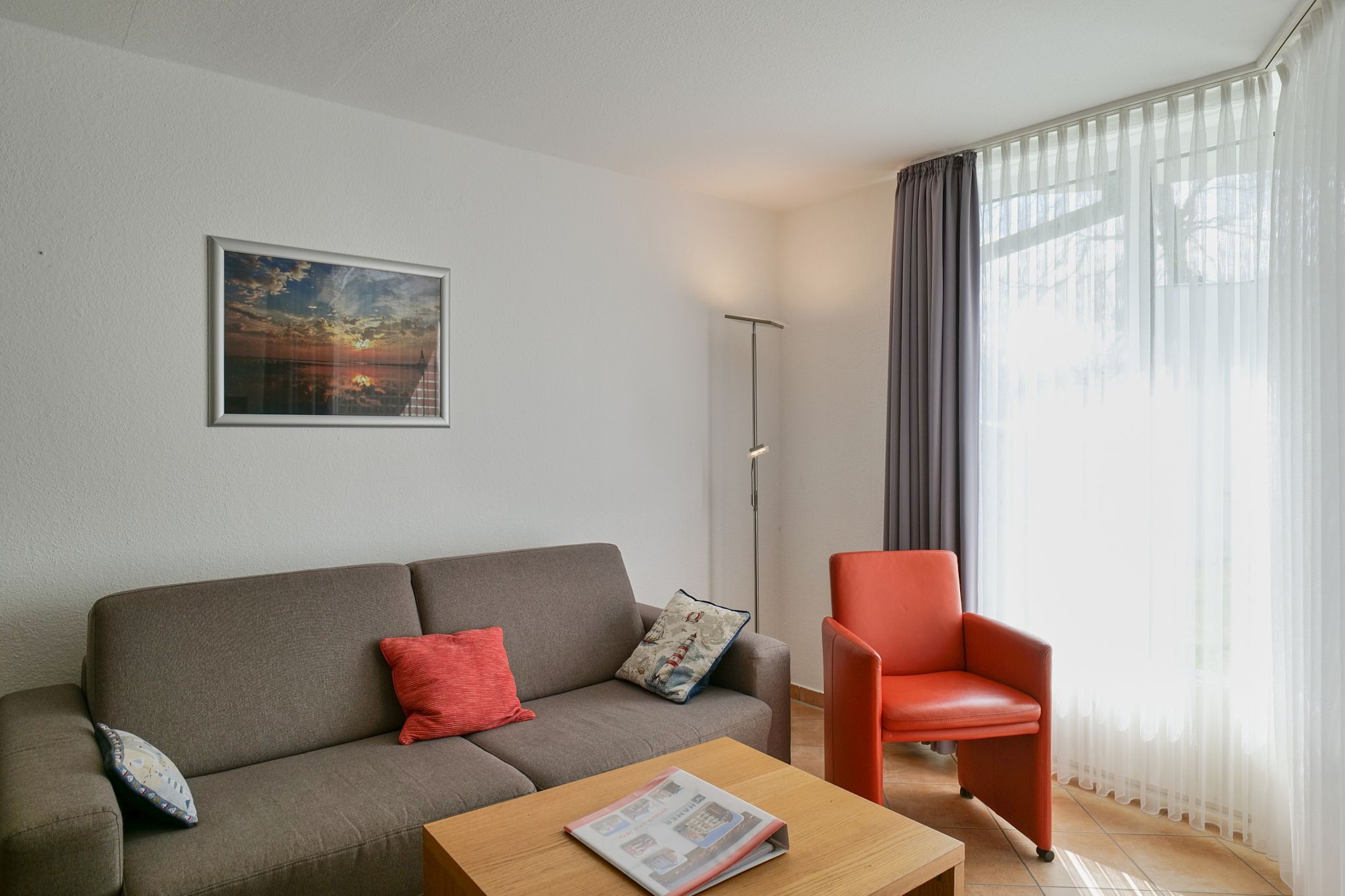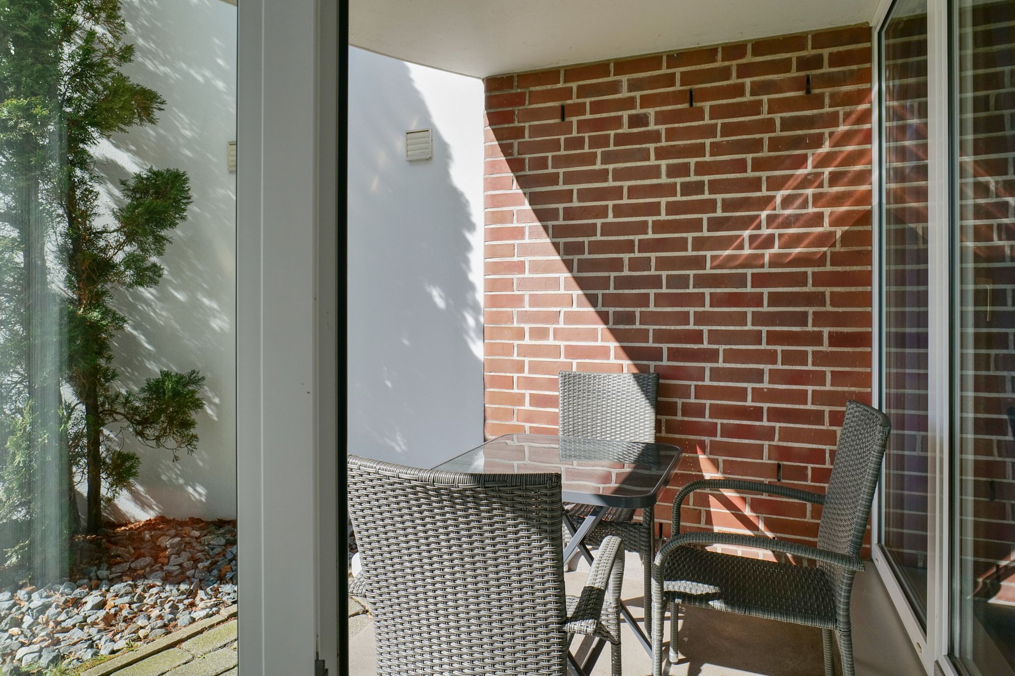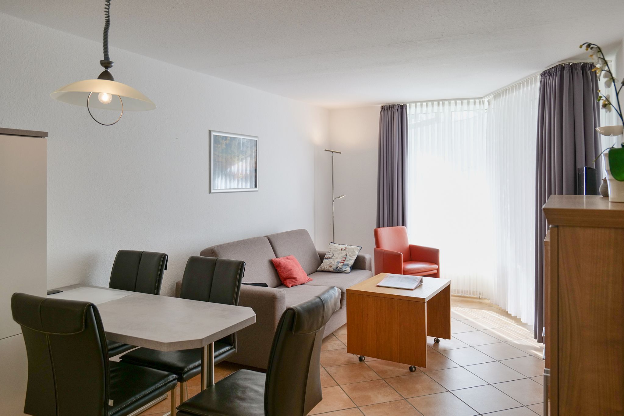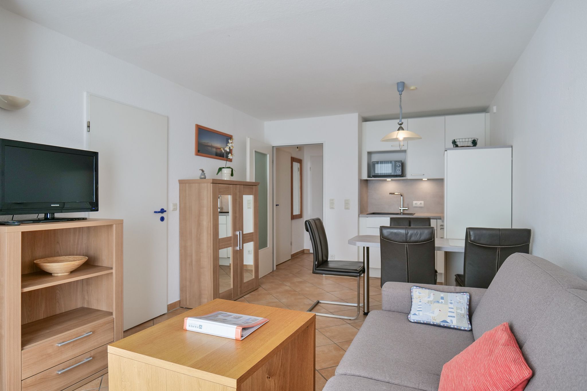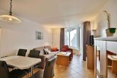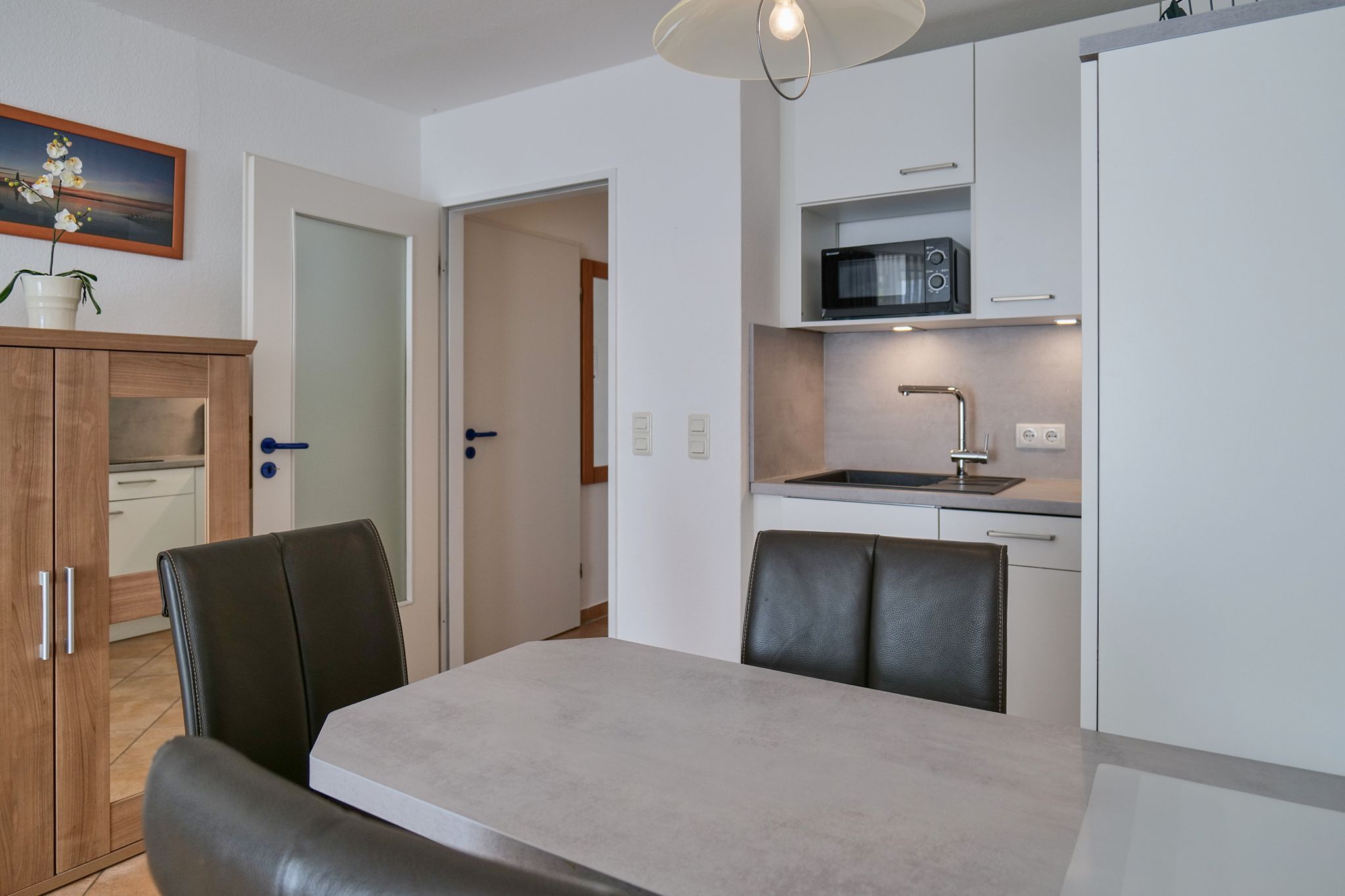 2 Raum-Appartement,ca. 40m², parterre, 1 Schlafzimmer (Betten: 2,00m x 1m u. 1,90m x 1m) und ein Wohnschlafzimmer, Dusche/WC, Fön. Die neue Küchenzeile mit Mikrowelle ist vollständig ausgestattet. SAT-TV, kostenloses W-Lan, Westterrasse mit Balkonmöbeln und Sonnenschirm (saisonabhängig), Nichtraucher, keine Haustiere, nummerierter Pkw-Stellplatz #8 auf dem Außengelände.