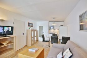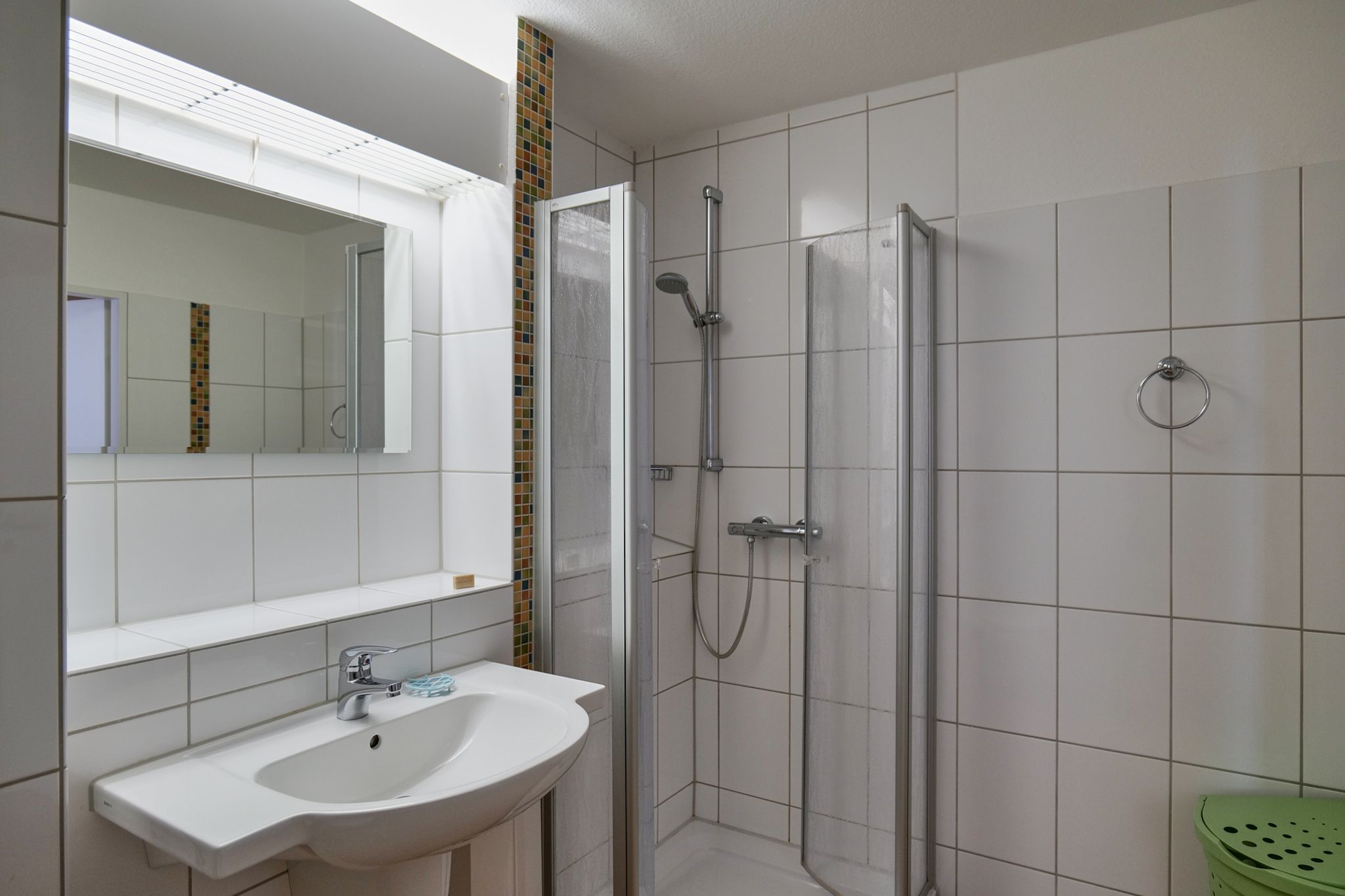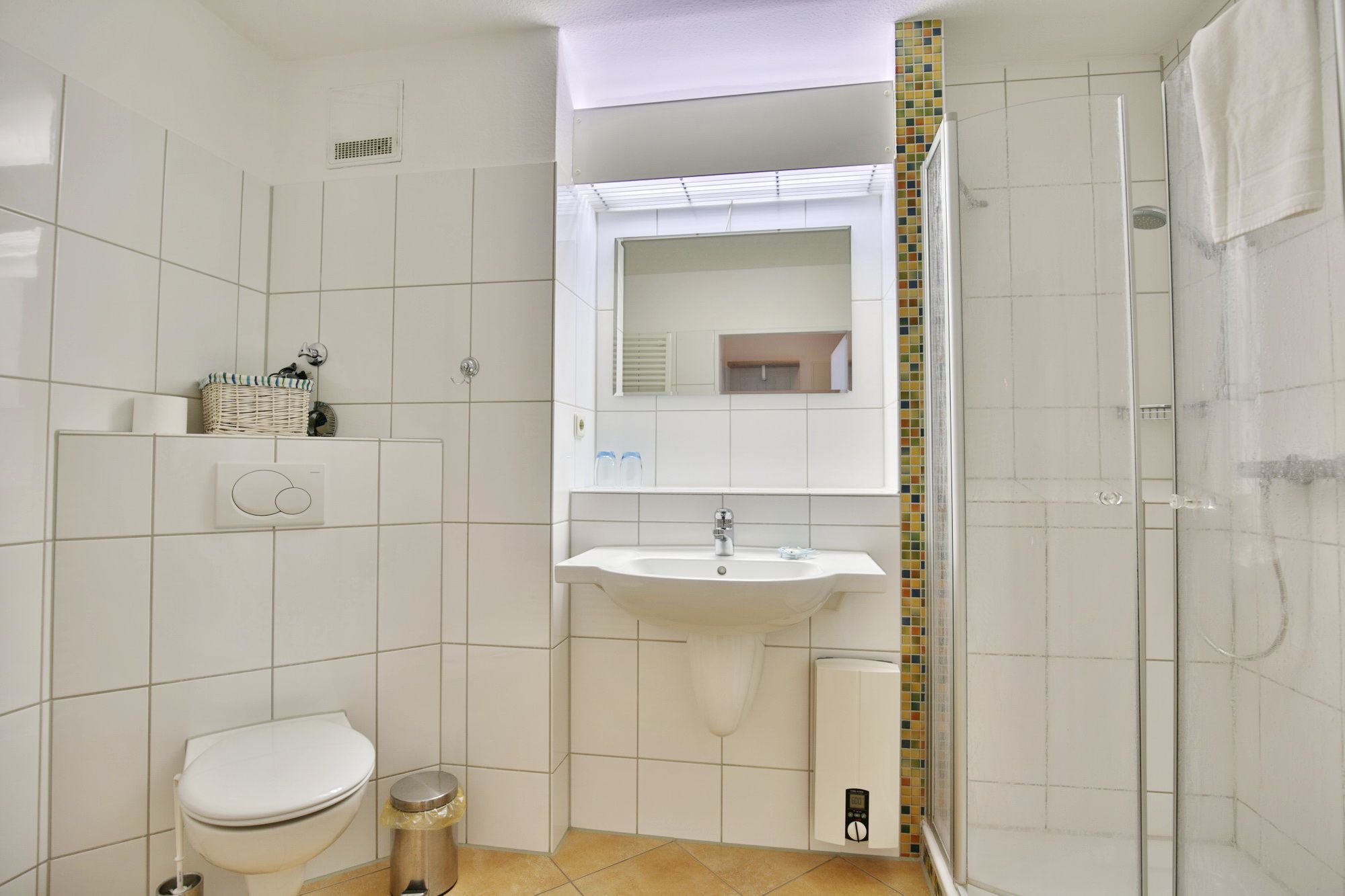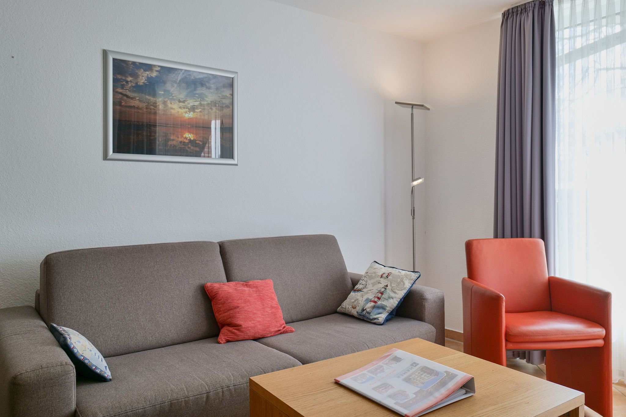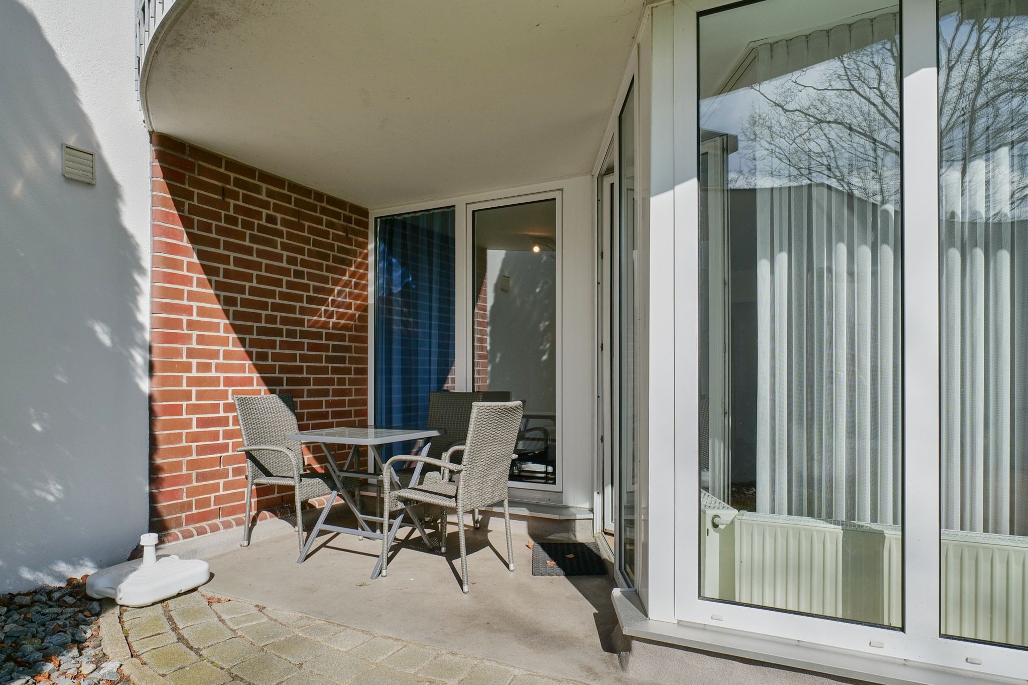2 Raum-Appartement,ca. 40m², parterre, 1 Schlafzimmer (Betten: 2,00m x 1m u. 1,90m x 1m) und ein Wohnschlafzimmer, Dusche/WC, Fön. Die neue Küchenzeile mit Mikrowelle ist vollständig ausgestattet. SAT-TV, kostenloses W-Lan, Westterrasse mit Balkonmöbeln und Sonnenschirm (saisonabhängig), Nichtraucher, keine Haustiere, nummerierter Pkw-Stellplatz #8 auf dem Außengelände.