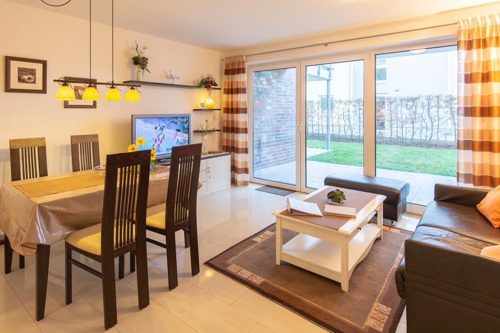 Schön ausgestattete, barrierefreie Wohnung auf ca. 49m² bis 3 Pers., parterre mit großer Terrasse und Rasenanteil (süd), 1 Schlafzimmer mit Boxspringbetten (2 Härtegrade), Wohn-/Schlafzimmer mit Schlafcouch, SAT-TV, W-LAN kostenfrei., vollständige Küchenzeile mit Geschirrspüler, Mikrowelle, Backofen, Gefrierfach, ebenerdige Dusche mit Sitz u. Haltegriffen (seniorengerecht), Wc, Föhn, alle Räume mit Rollladen, Nichtraucher, Pkw-Stellplatz #1, keine Haustiere gestattet