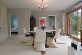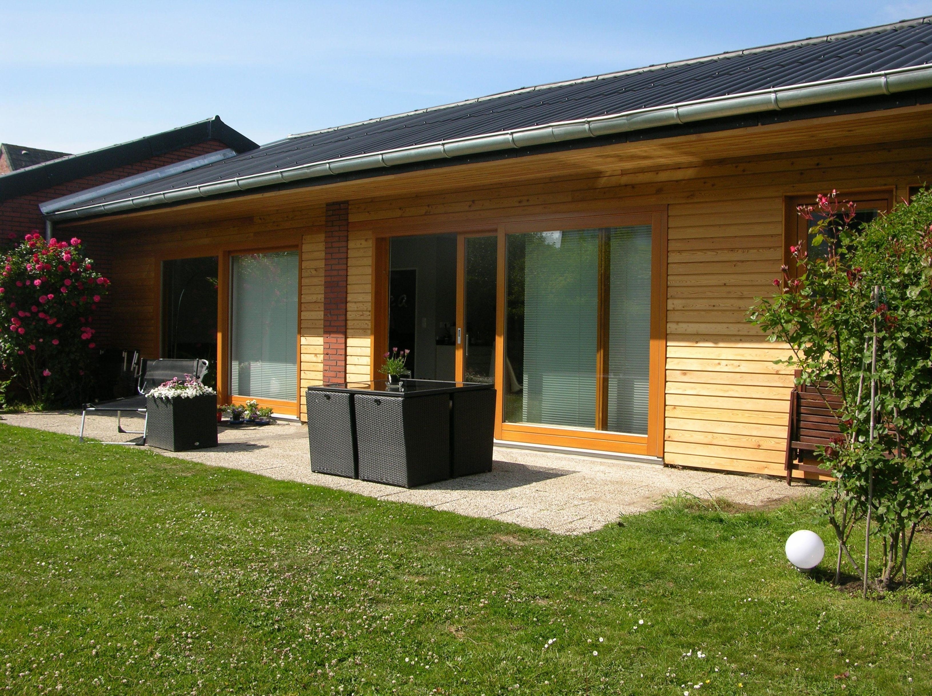 Der Bungalow befindet sich in einer verkehrsberuhigten Strasse auf einem sehr grosszügigen Grundstück. Sie haben eine wunderschöne Südterrasse mit sonnigem Garten und die Kinder haben zusätzlich eine grosse Wiese auf der anderen Seite zum Spielen. So hat jeder seinen ungestörten Bereich.