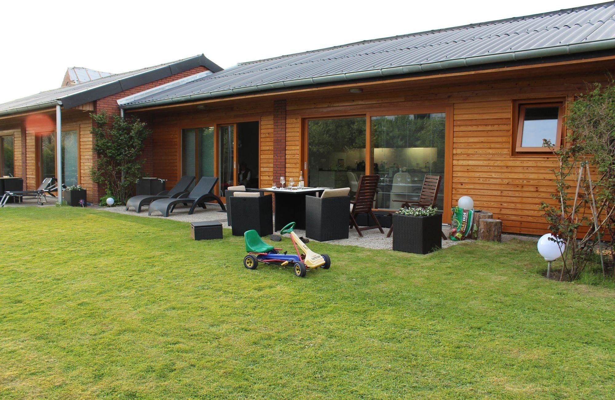 Der Bungalow XL hat 3 Schlafzimmer und 2 Bäder und bietet 6 Personen Platz. Die Räume sind lichtdurchflutet, modern und sehr gemütlich. Im grossen Wohnbereich haben sie eine moderne, offene Küche mit Geschirrspüler, Backofen, Induktionsherdplatte und Mikrowelle. Vom Wohnzimmer aus betritt man durch grosse Schiebetüren die nach Süden ausgerichtete Terrasse und den Garten. Hier können Sie die Sonne geniessen und es sich im Windschatten gemütlich machen. Für Kinder können auf der grossen Spielwiese auf der Rückseite des Bungalows spielen.