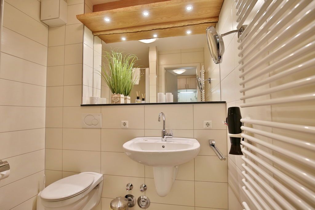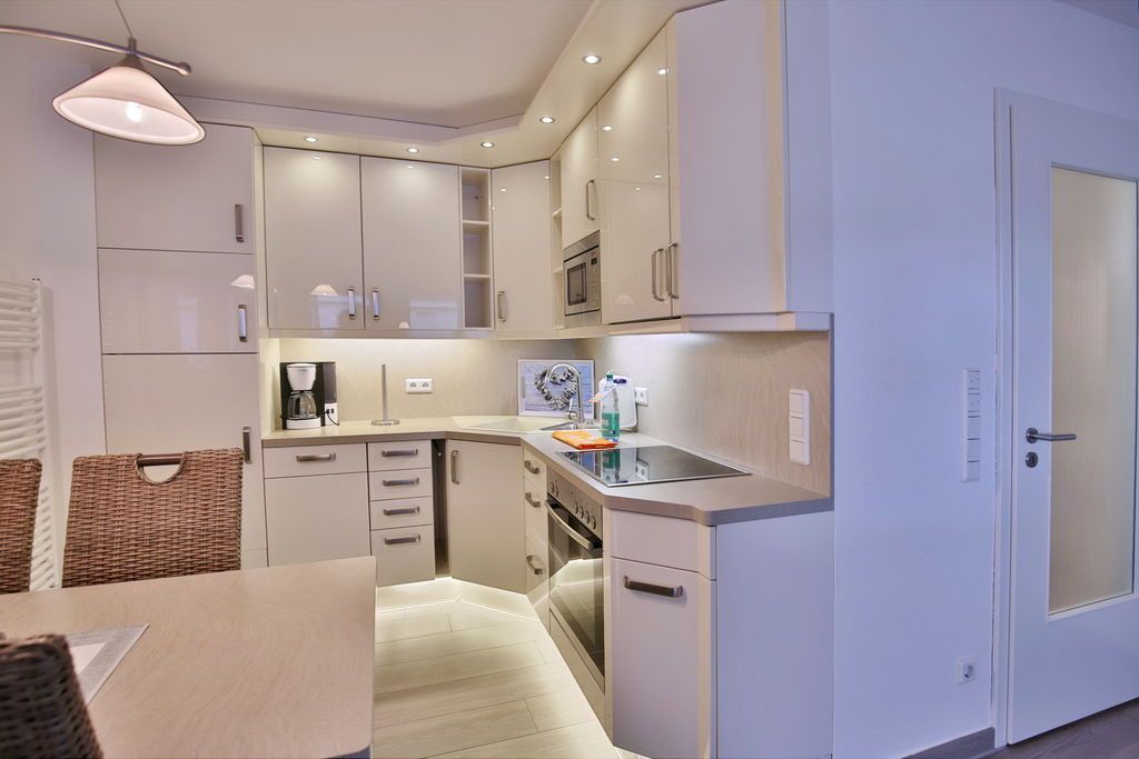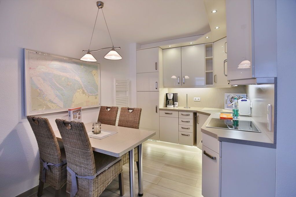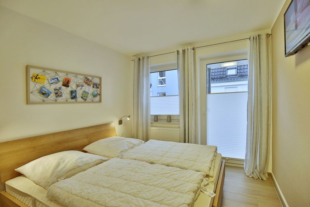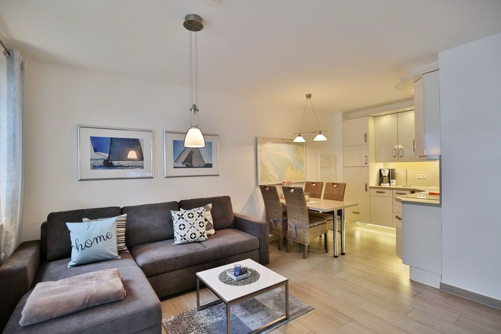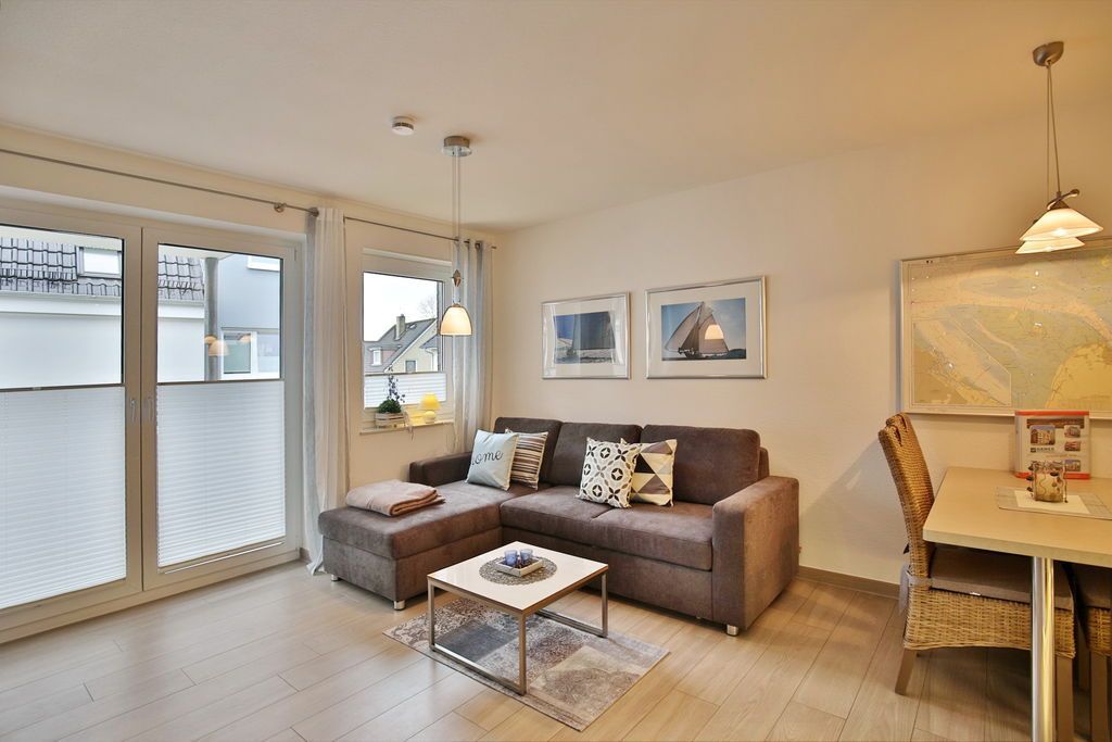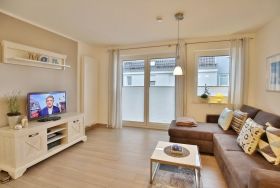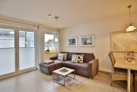 Schöne, vollständig ausgestattete Wohnung für 3 Pers., komplett mit hellen Bodenfliesen in Parkett-Optik, 1. Etage auf ca. 46 m², großer Süd-Balkon mit Balkonmöbeln und Sonnenschirm (saisonabhängig), 1 Schlafzi. mit Doppelbett, Wohn-/Schlafzi. mit Schlafcouch, 2x Sat-TV, W-LAN kostenlos., große Komfort-Küchenzeile (Geschirrspüler, Backofen, Mikrowelle, sep. Gefrierfach), Dusche mit bequemer Sitzfläche, Föhn, Kosmetikspiegel, Rollläden, breiter Pkw-Stellplatz #5, Nichtraucher, keine Haustiere