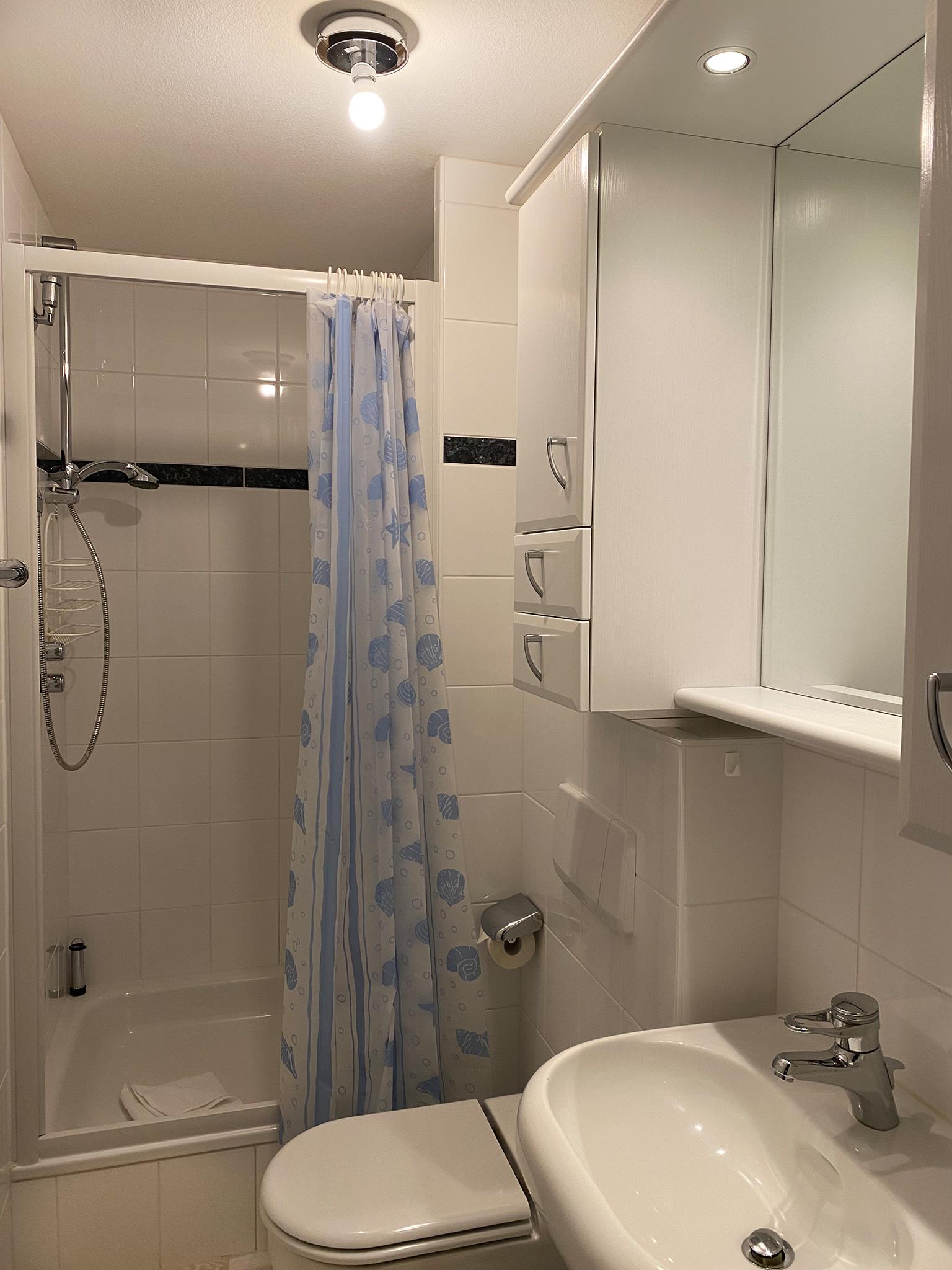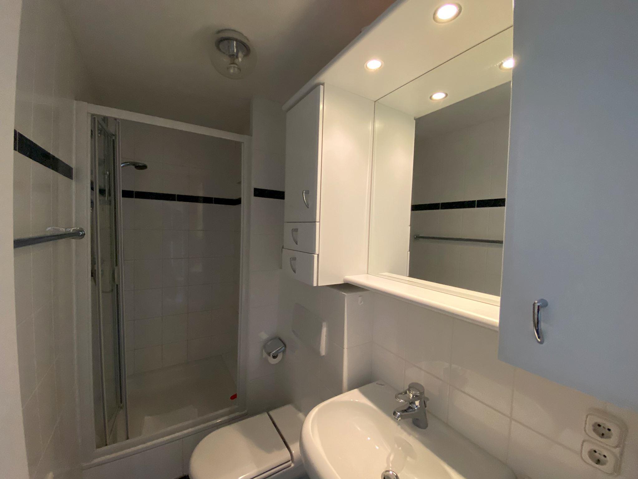 Bad: Dusche, Waschbecken, WC, Duschkabine, Spiegelschrank, Handtuchhalter, Schrank, E-Heizung