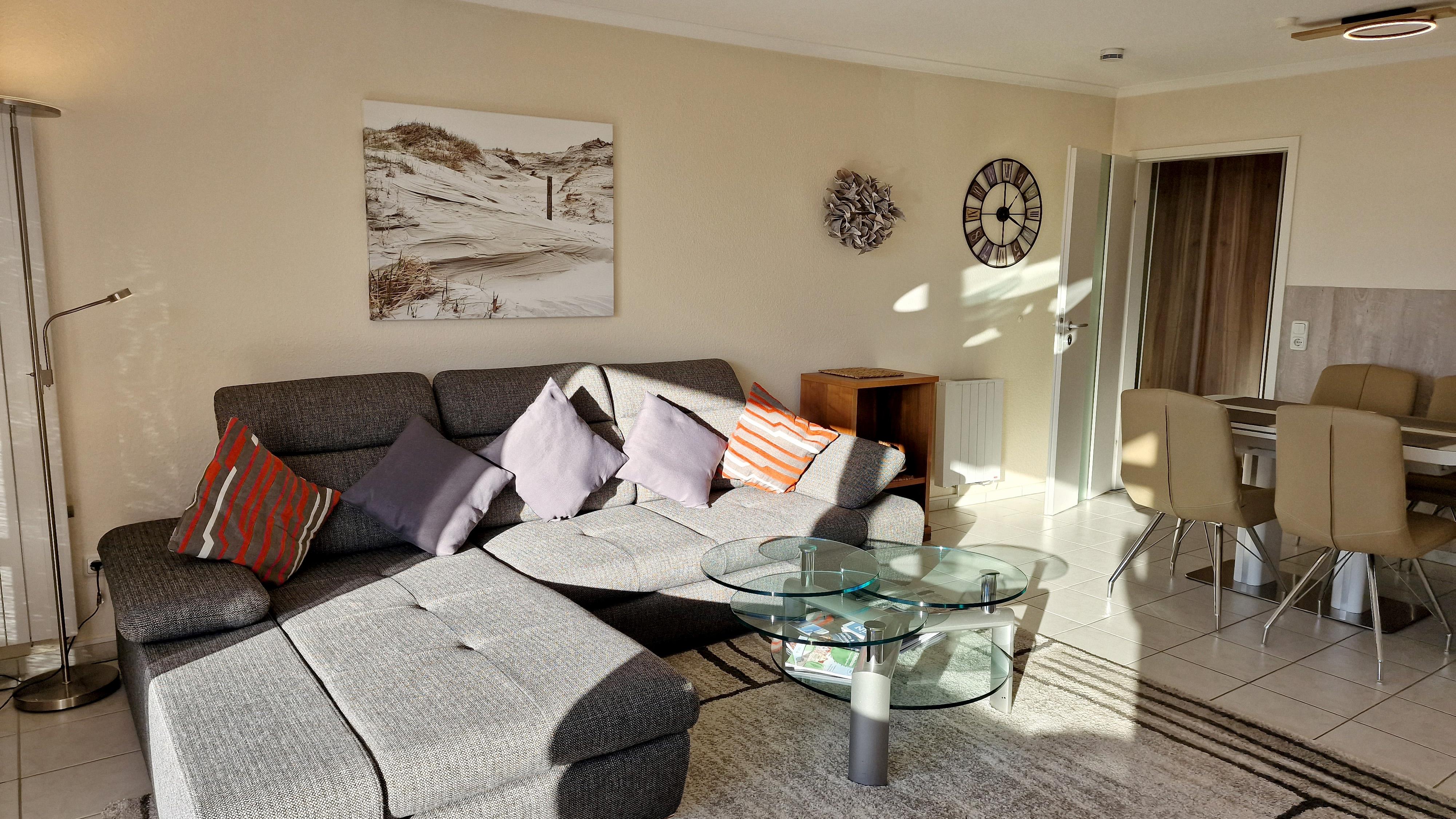 Wohnzimmer: Schlafcouch, Couchtisch, Hocker, 2 Stehlampen, E-Heizung, Regal, Kleiderschrank, Schrank, Anrichte, Tischlampe, TV-Schrank, Vitrine, Kabel-TV Flachbildschirm, Stereoanlage mit CD-Player, Ecksitzbank, Esstisch, 2 Stühle
