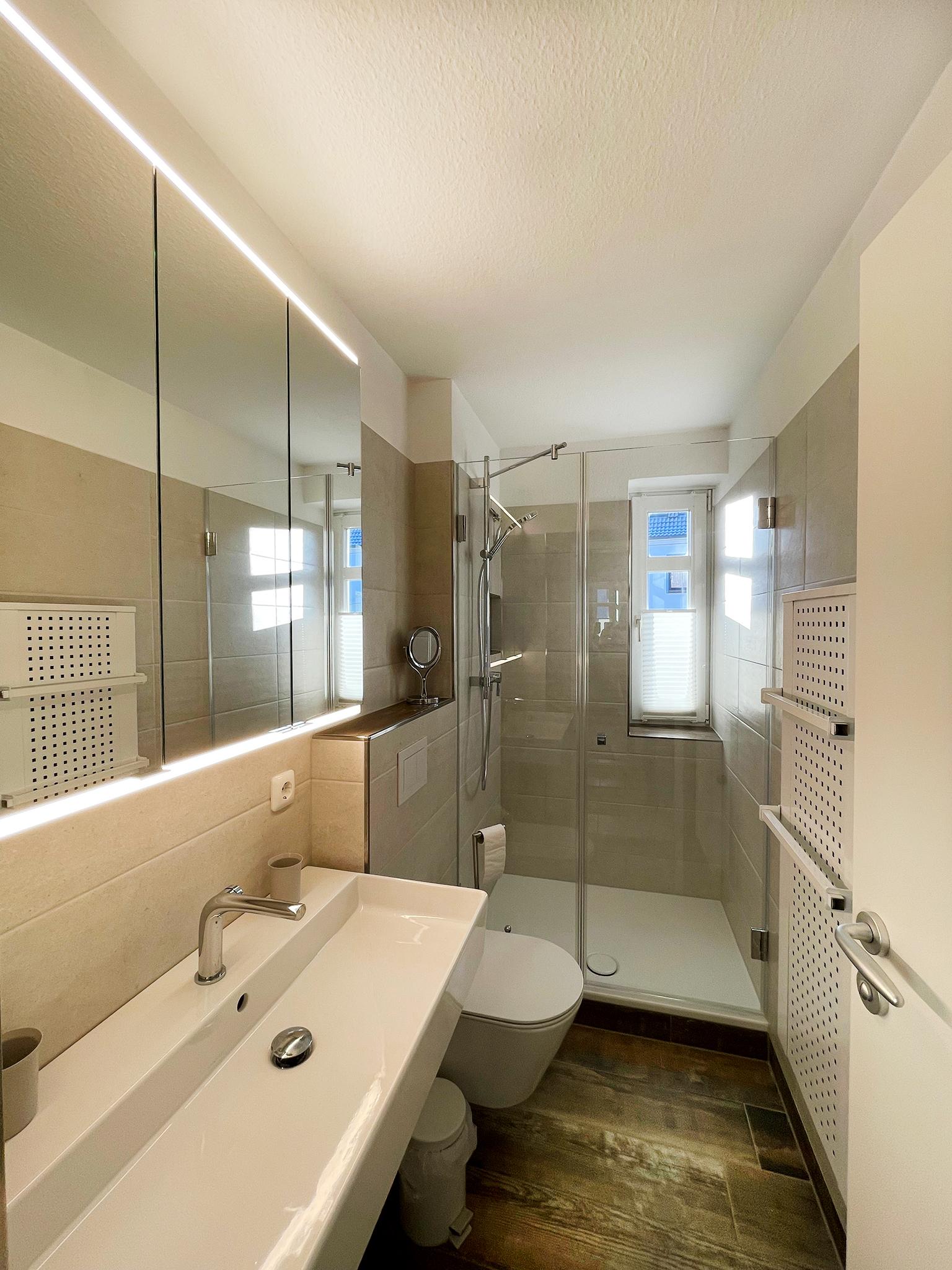 Bad: Dusche, Waschtisch, WC, Spiegelschrank, Duschkabine, Kosmetikspiegel, Schrank, Handtuchtrockner