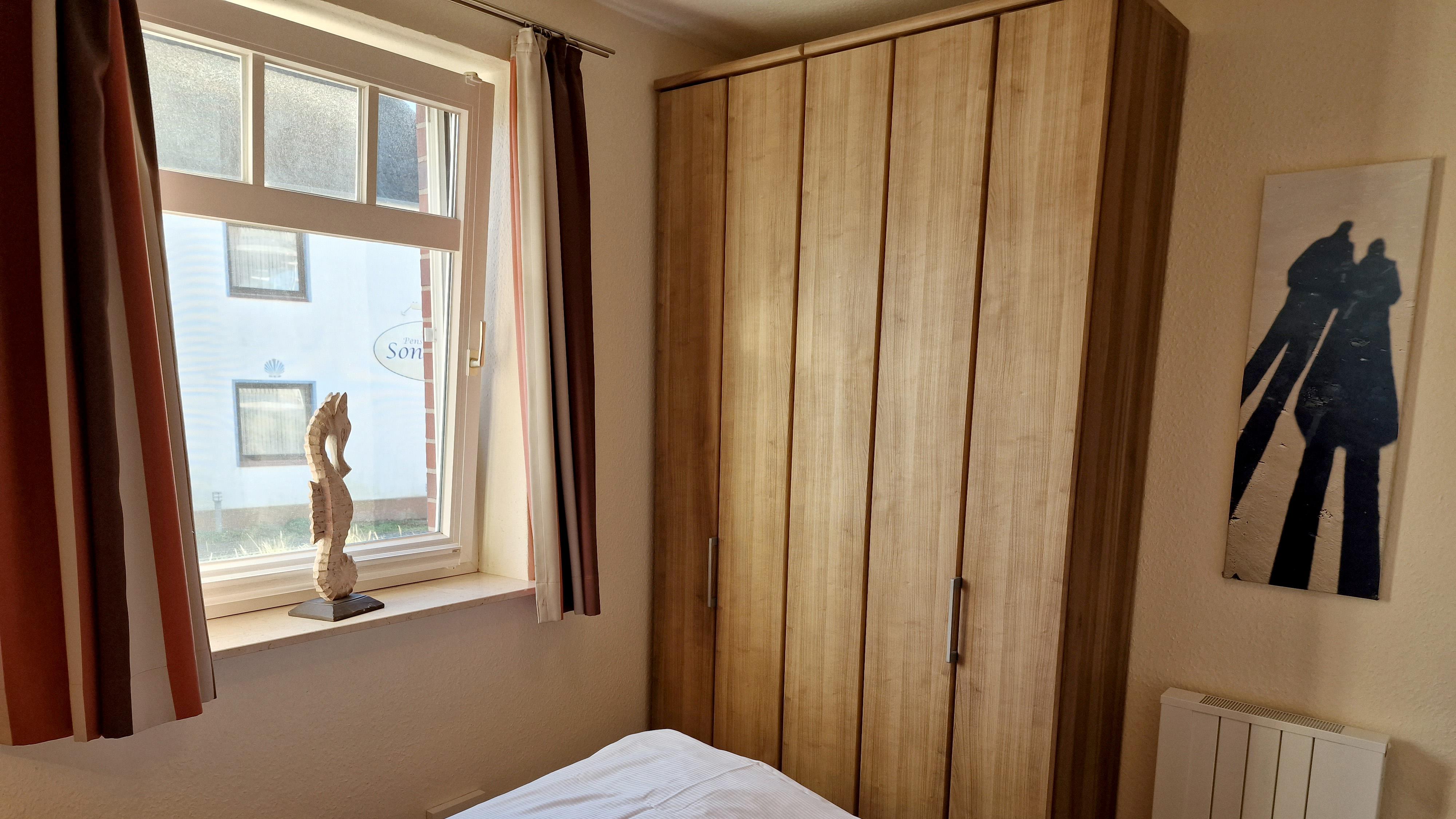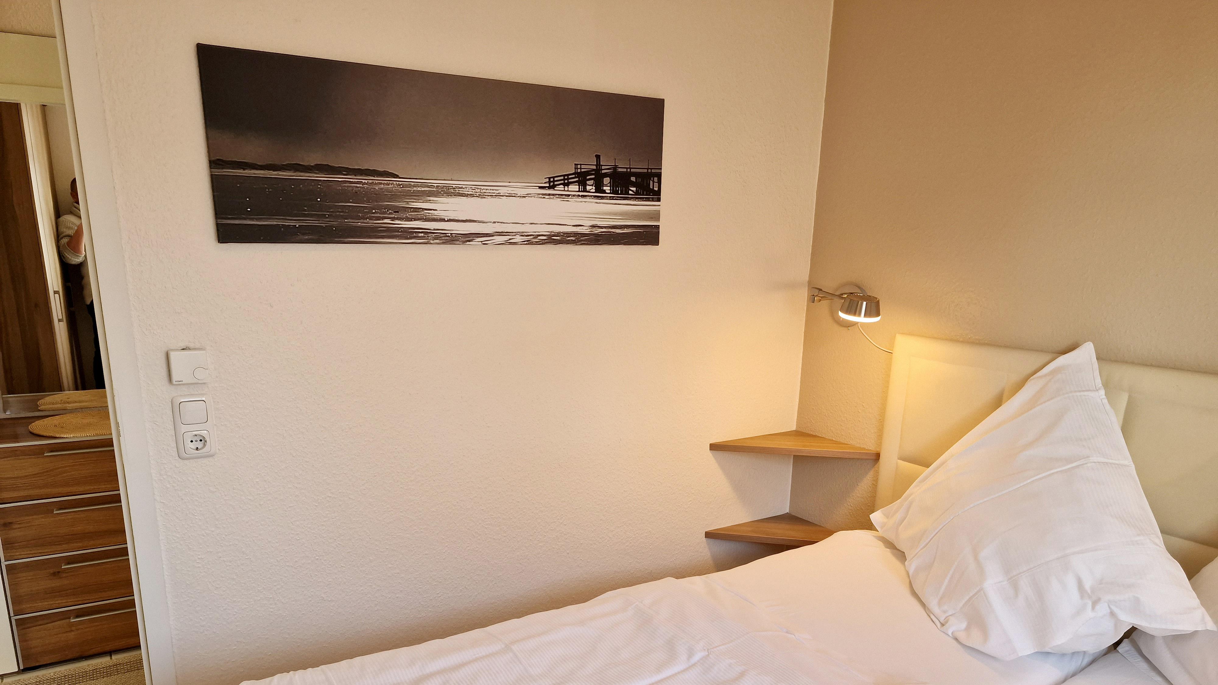 Schlafzimmer: Doppelbett 2,00 x 1,60 m, 2 Ablagen, Kleiderschrank, Radiowecker, E-Heizung