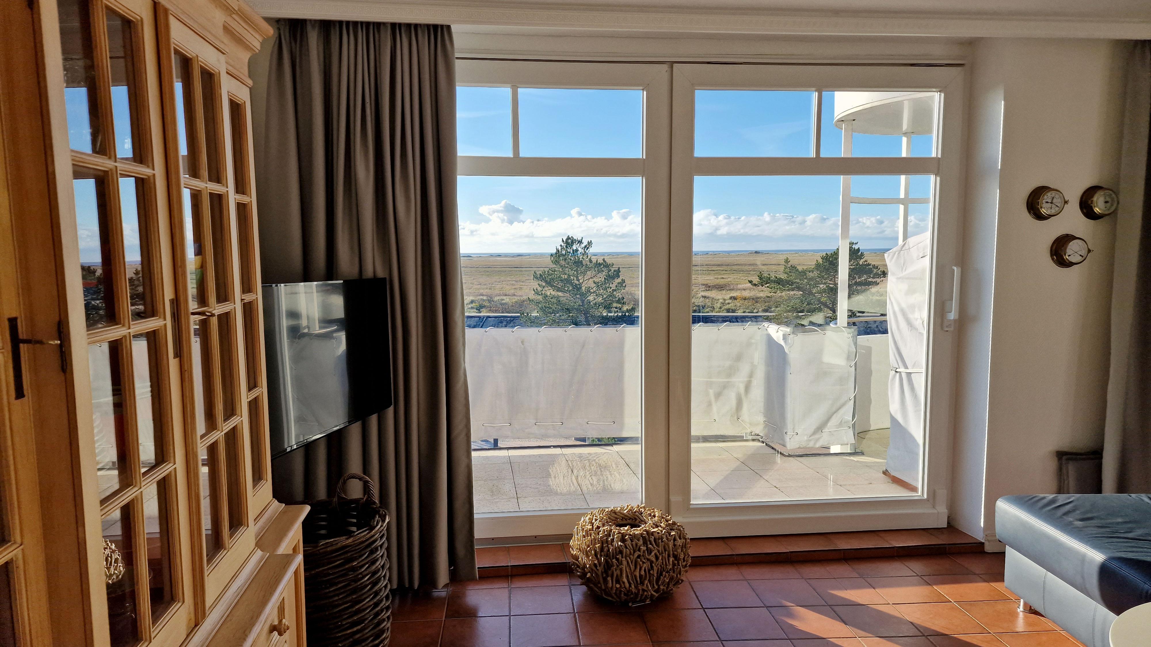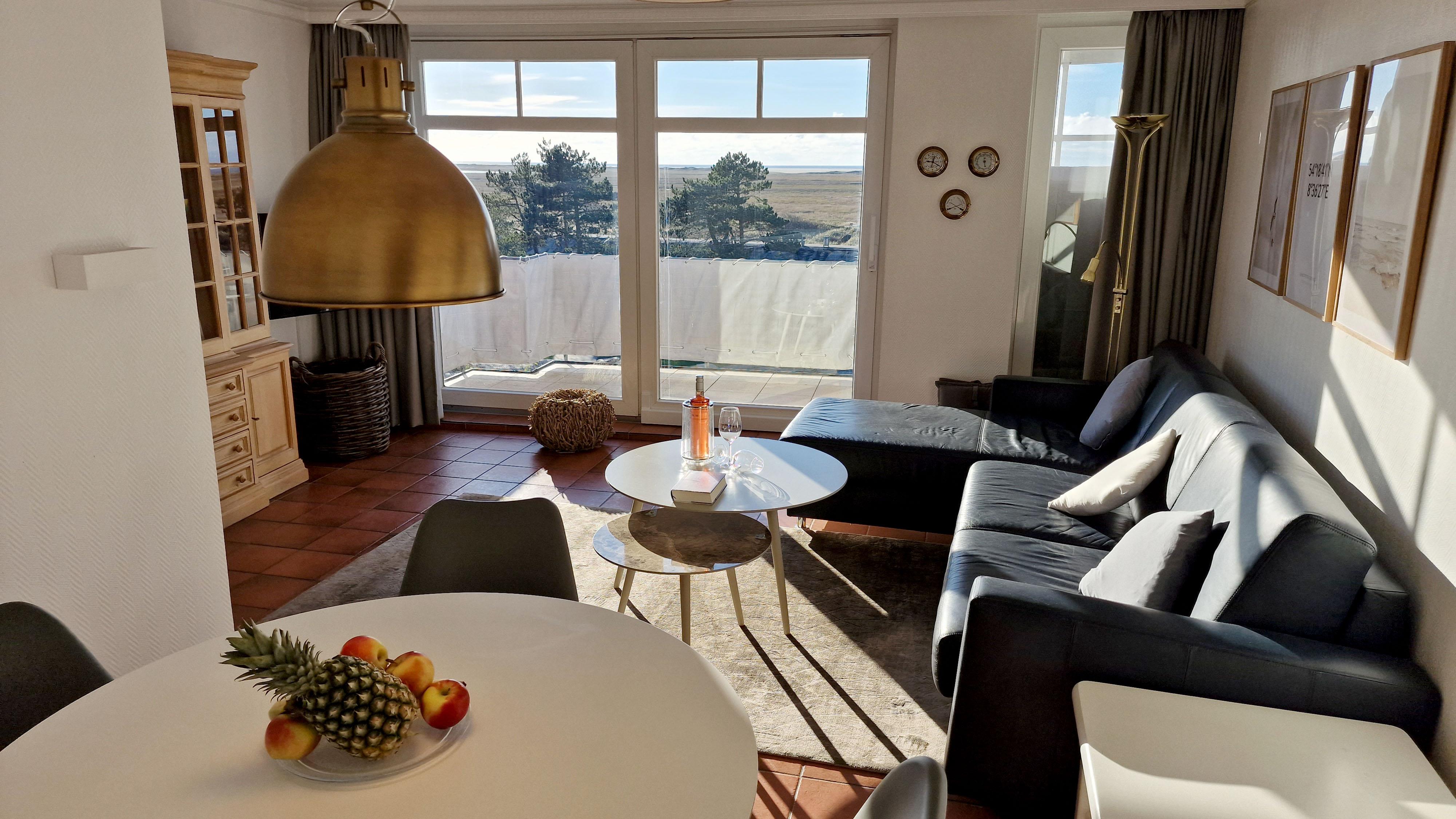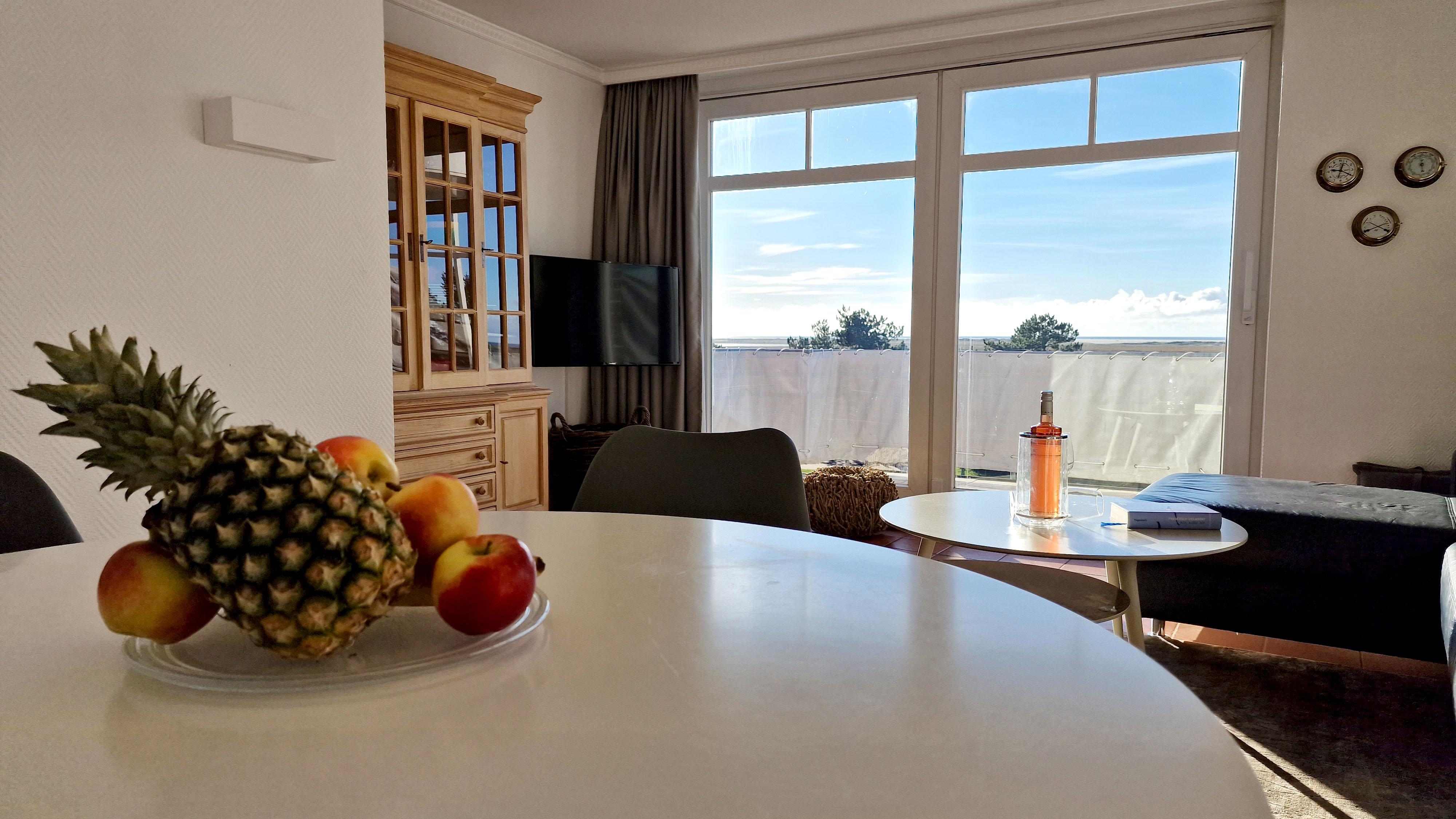 Wohnzimmer: Couch, Couchtisch, 2 Korbsessel, Beistelltisch, Stehlampe, Tischlampe, Vitrinenschrank, TV-Rollregal, Kabel-TV, Flachbildschirm, DVD-Player, Kofferradio mit CD-Player, Esstisch, 4 Stühle, Geschirr, Meerblick