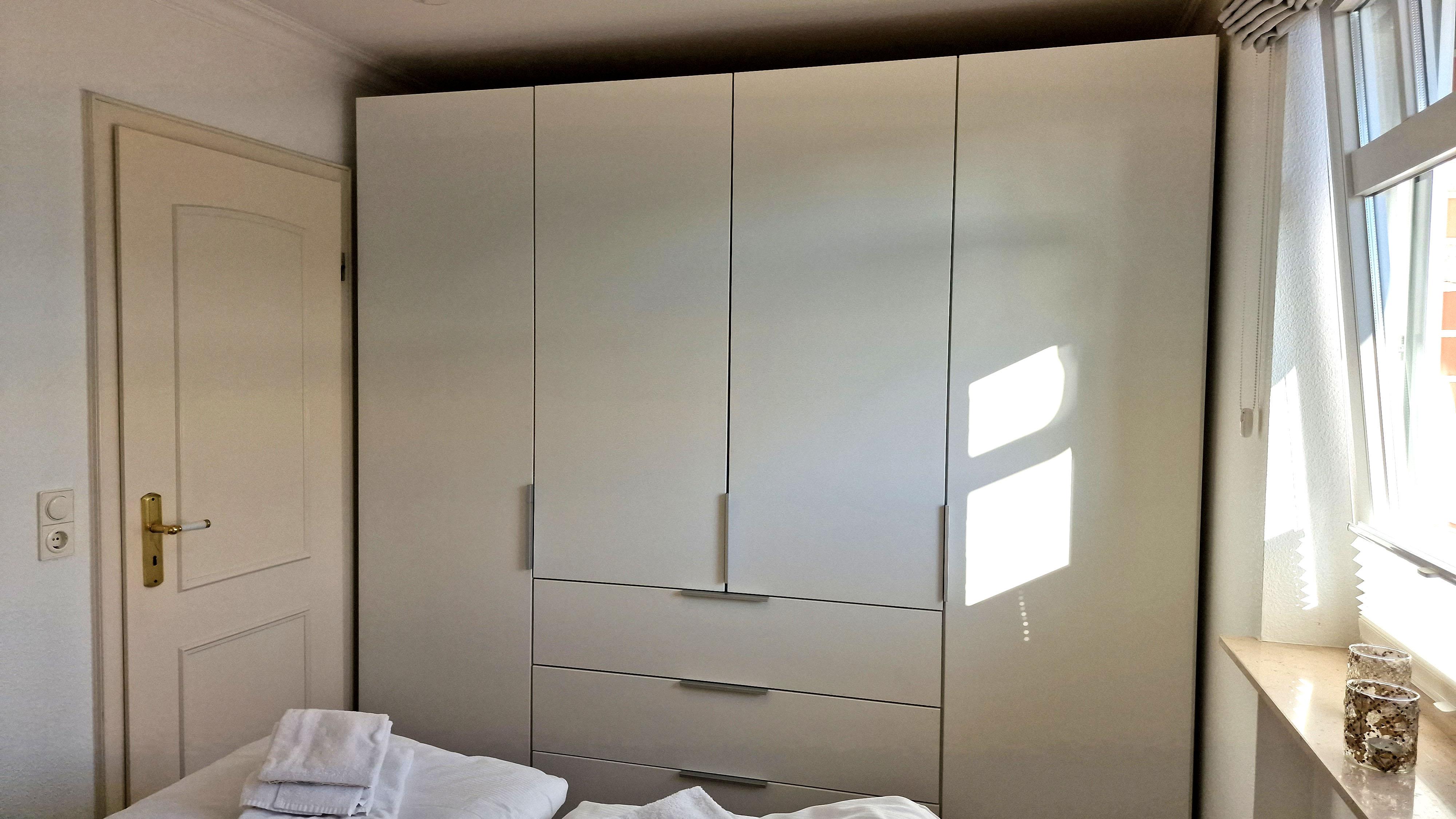 Schlafzimmer: Doppelbett 2,00 x 1,80 m, 2 Nachttische, Radiowecker, Kleiderschrank, Spiegel, Wäscheständer, Herrendiener, Bügelbrett, Bügeleisen
