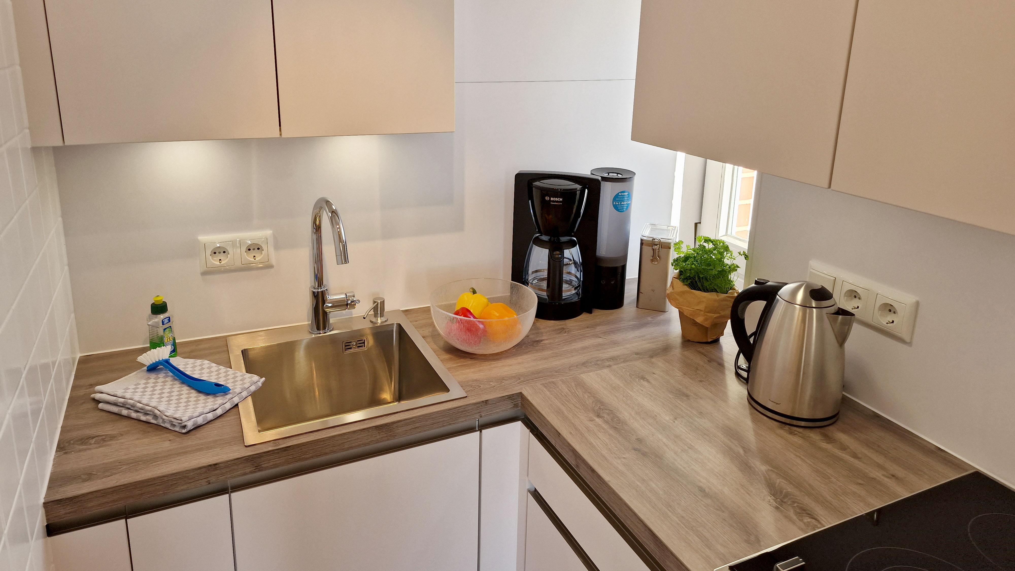 Küche: Einbauküche, 2 Plattenherd mit Ceranfeld, Kühlschrank mit 3* Gefrierfach, Spülmaschine, Mikrowelle, Wasserkocher, Toaster, Handmixer, Brotschneidemaschine, Kochtöpfe