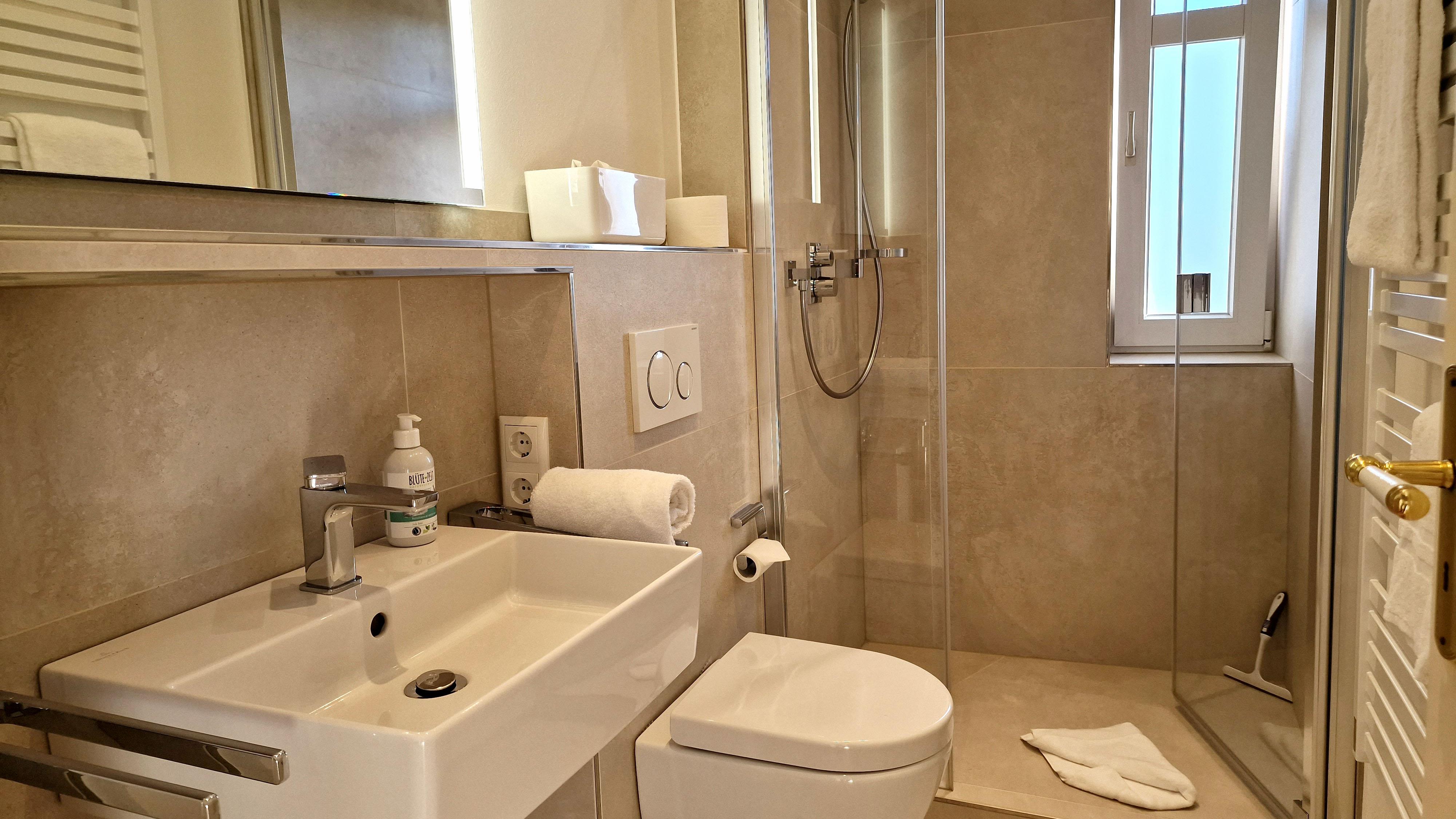 Bad: Dusche, Waschbecken, WC, Duschkabine, Spiegelschrank, Handtuchhalter, Schrank, E-Heizung