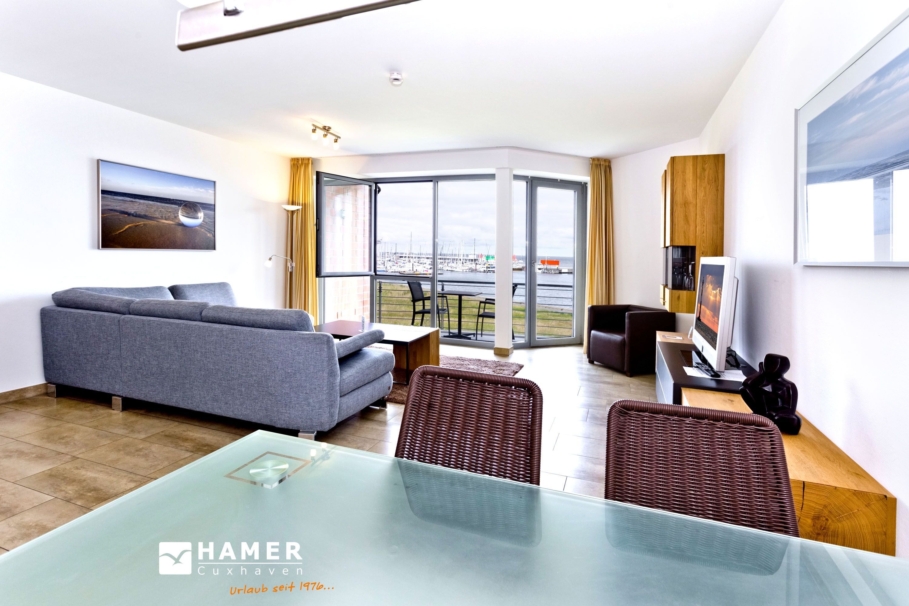 Geschmackvolle 102m² Wohnung in der 1.Etage. Hier haben Sie die Traumseesicht auf den Weltschifffahrtsweg und die Hafenanlagen. 1 Schlafzimmer mit Doppelbett, 1 Schlafzimmer mit 2 Einzelbetten, 1 Bad/Du/Wc und 1 Gäste Wc, Föhn, großes Wohnzimmer mit komplett ausgestatteter Küchenzeile (Kühlschrank ohne Gefrierfach), 2 große Balkone (nord+süd). Die Schlafzimmer verfügen über Rollläden. Zur Wohnung gehört der reservierter Pkw-Stellplatz #10 am Haus. Keine Haustiere. Nichtraucher. Fahrräder können auch bequem und sicher im ebenerdigen Fahrradraum des Nachbargebäudes abgestellt werden (separater Schlüssel).