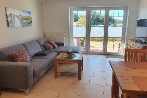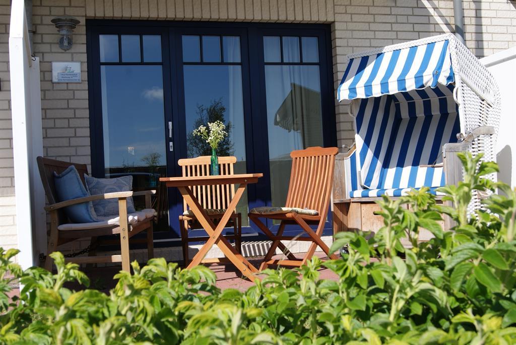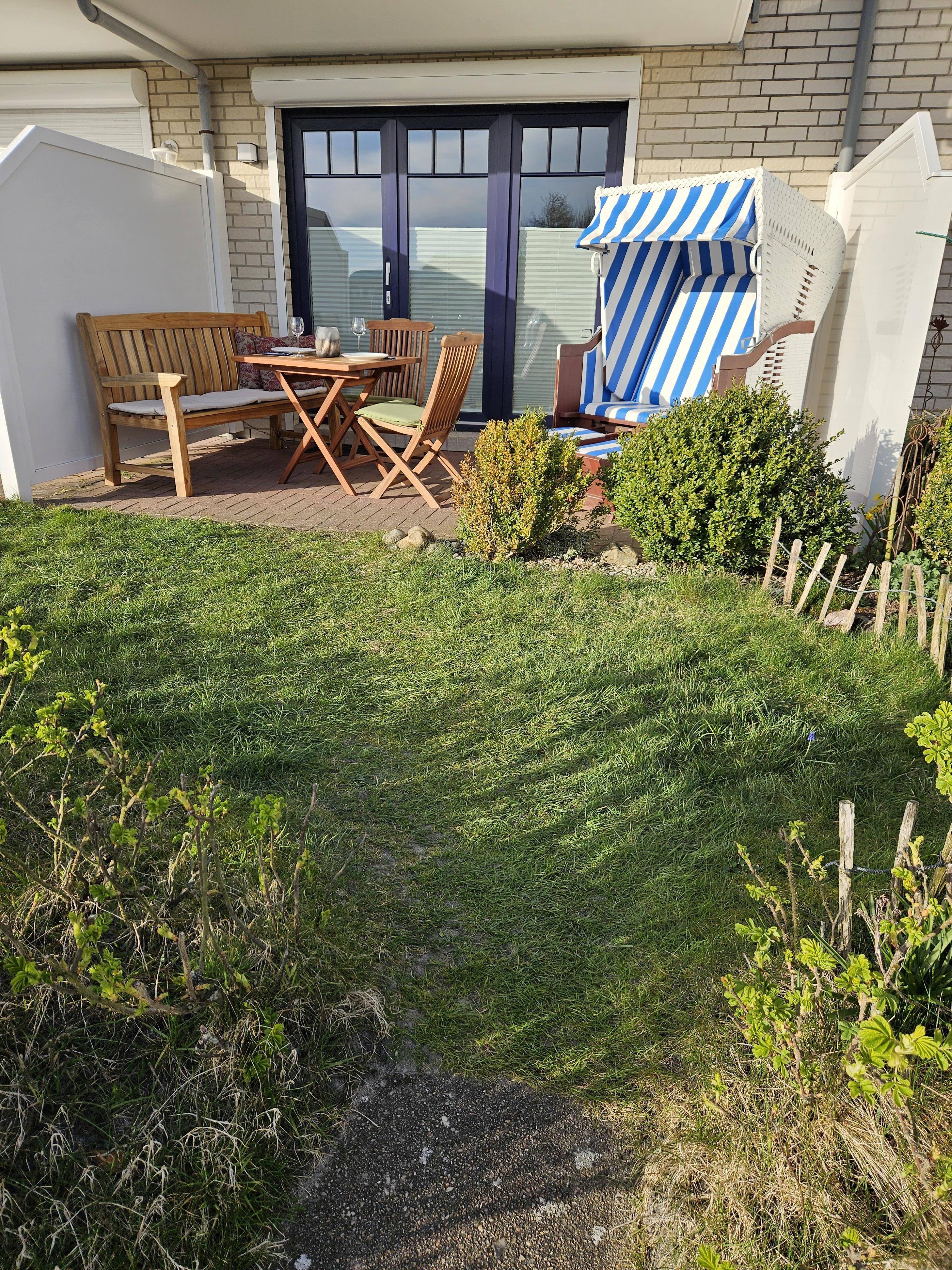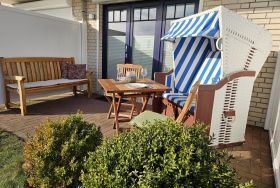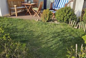 Die Ferienwohnung Bernsteinsucher liegt Parterre und hat eine Südterrasse mit Strandkorb, Gartenmöbel und angeschlossenem Garten zur privaten Nutzung.