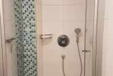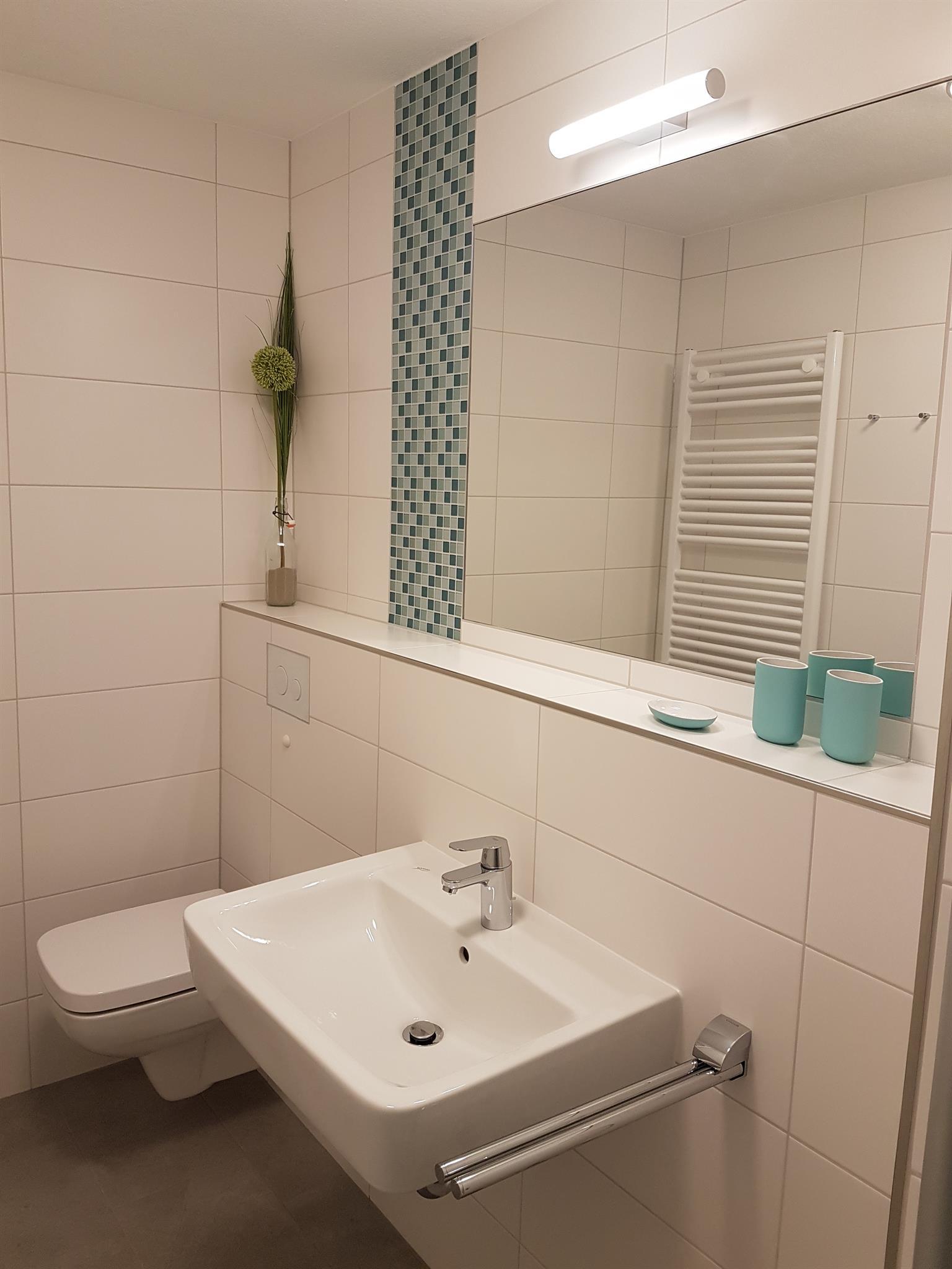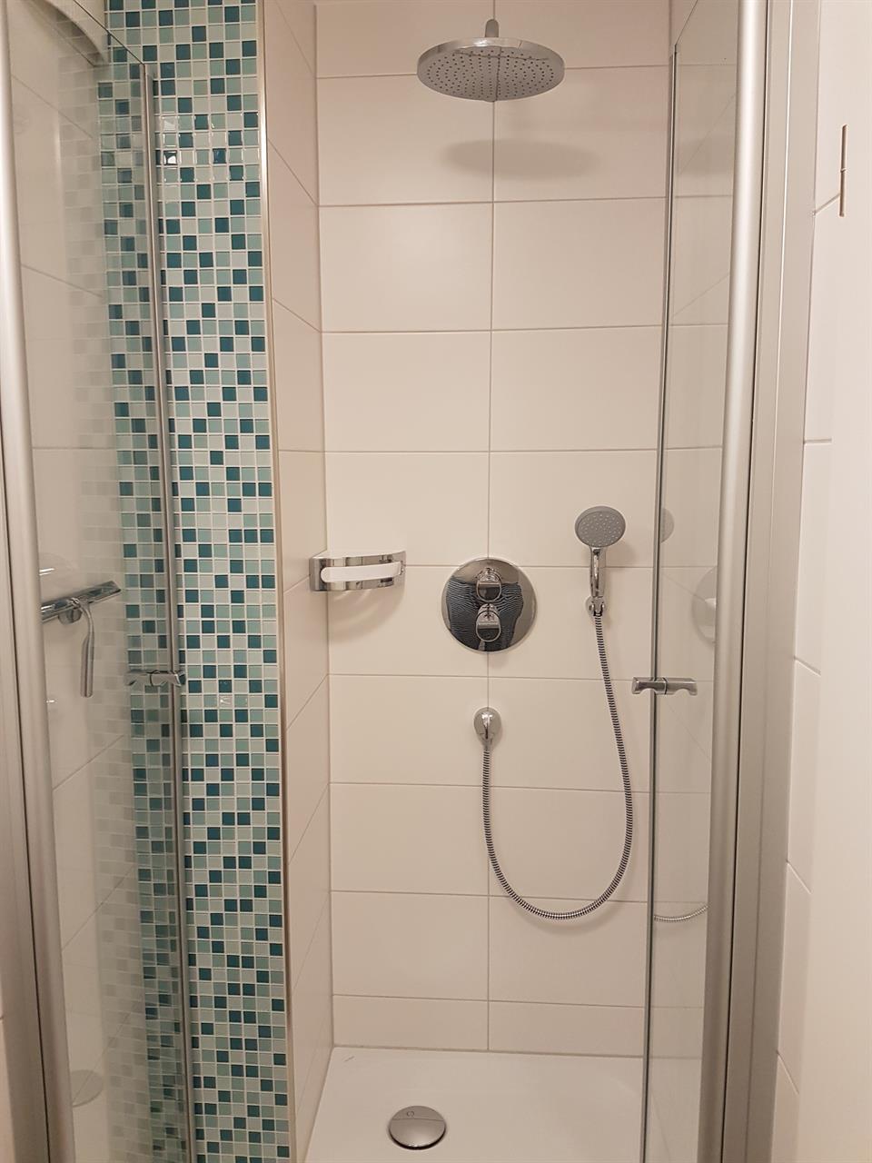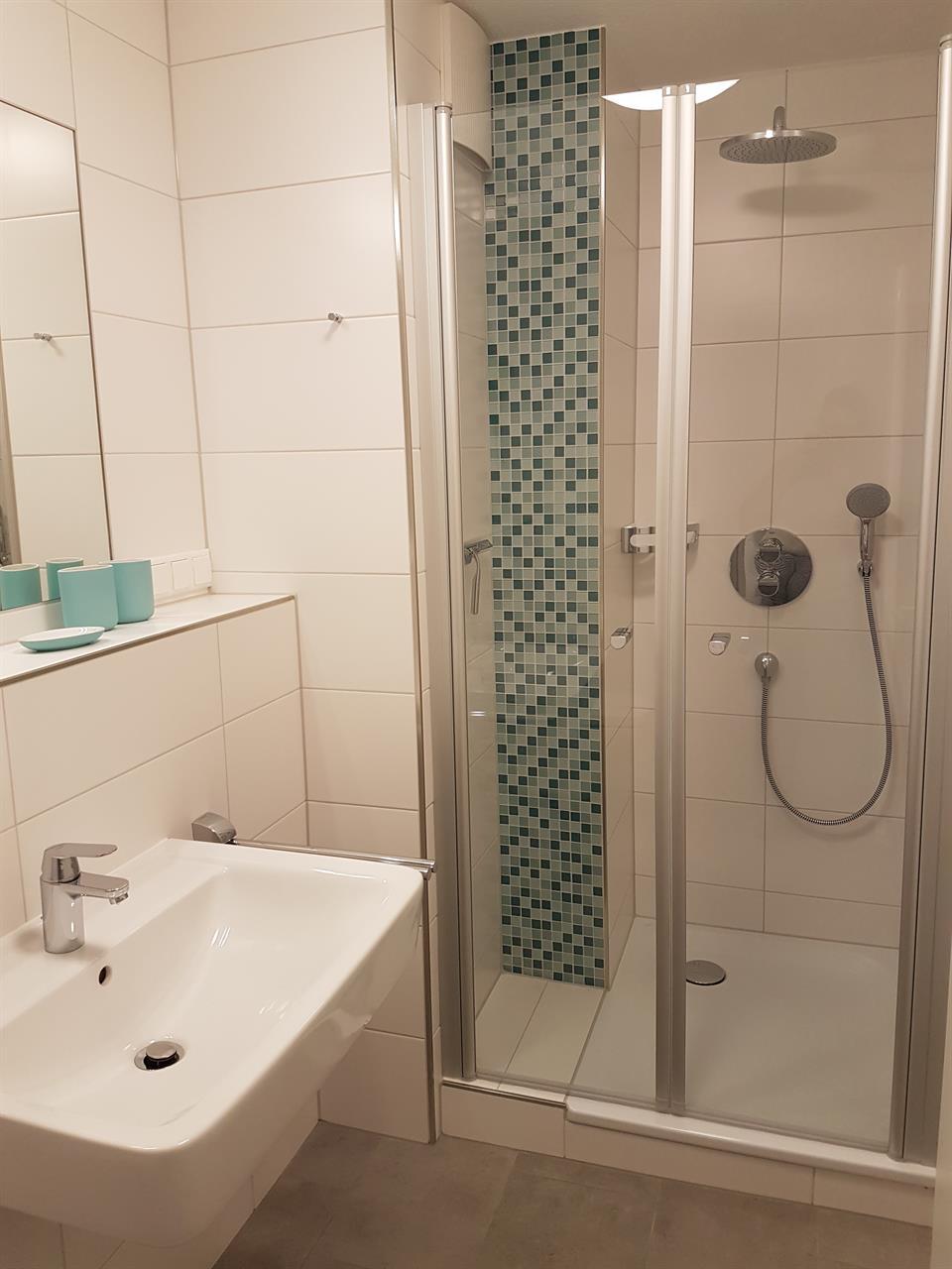 Das moderne Badezimmer ist mit einer großen Regendusche und Handtuchwärmer ausgestattet.