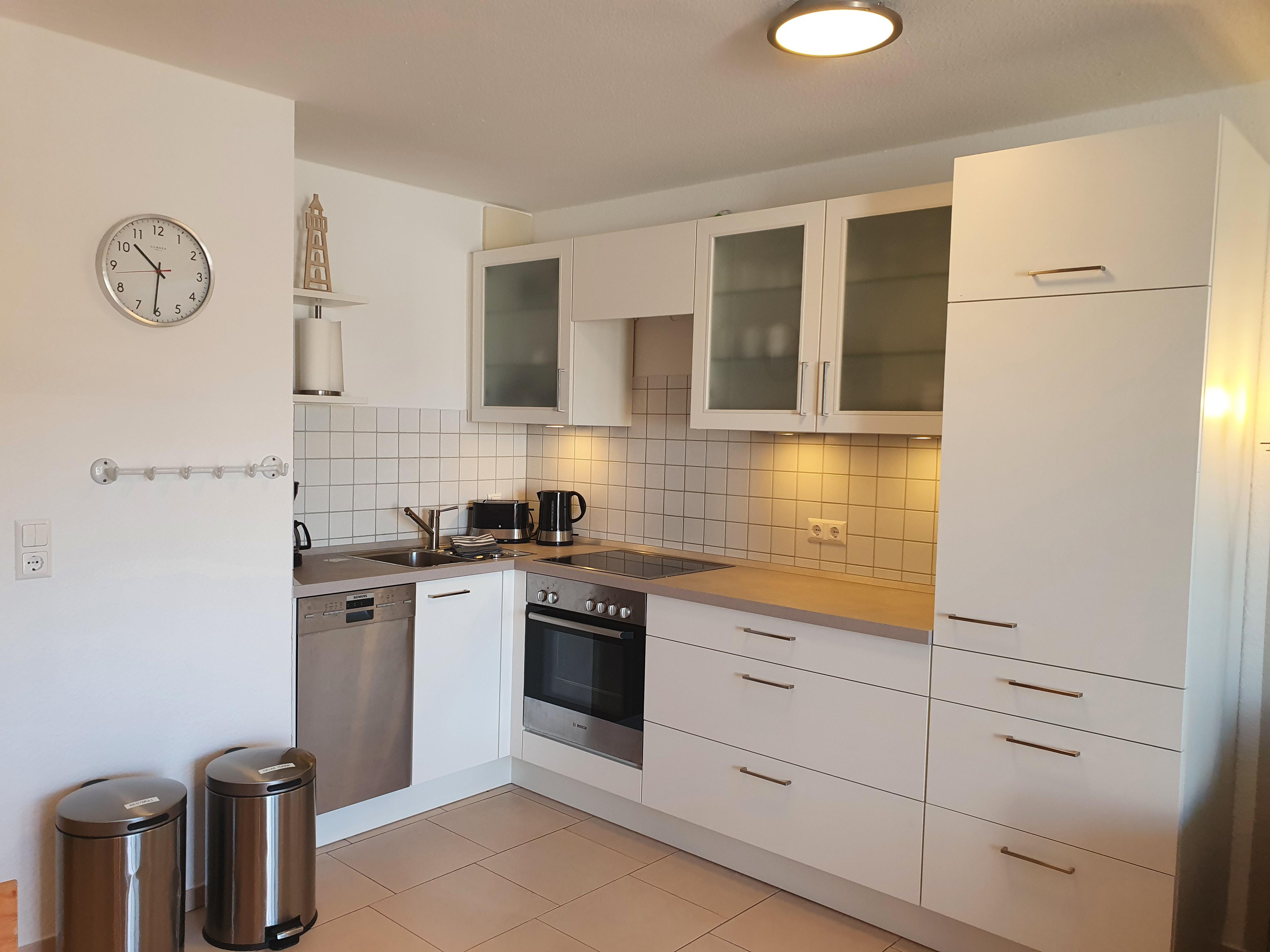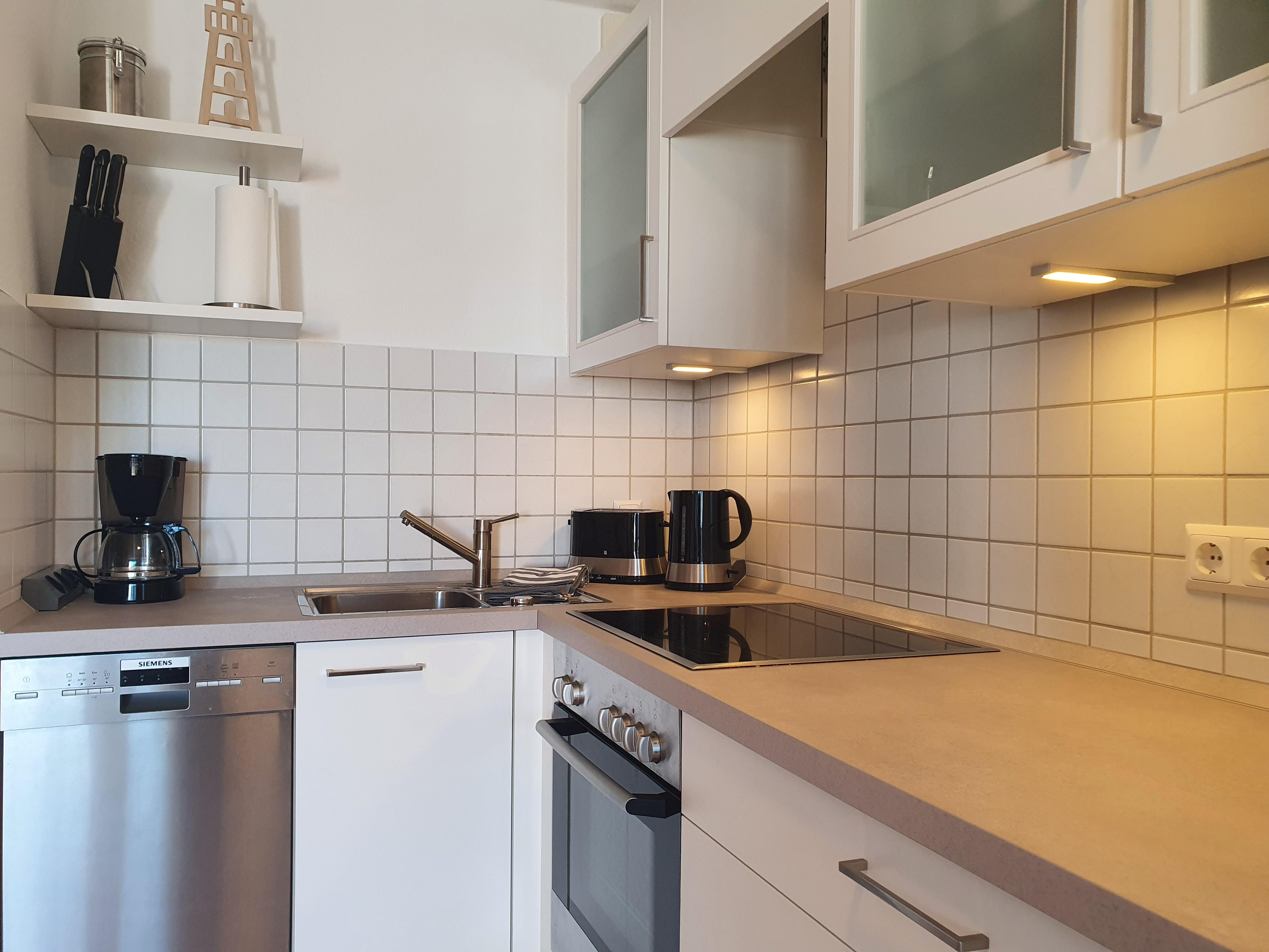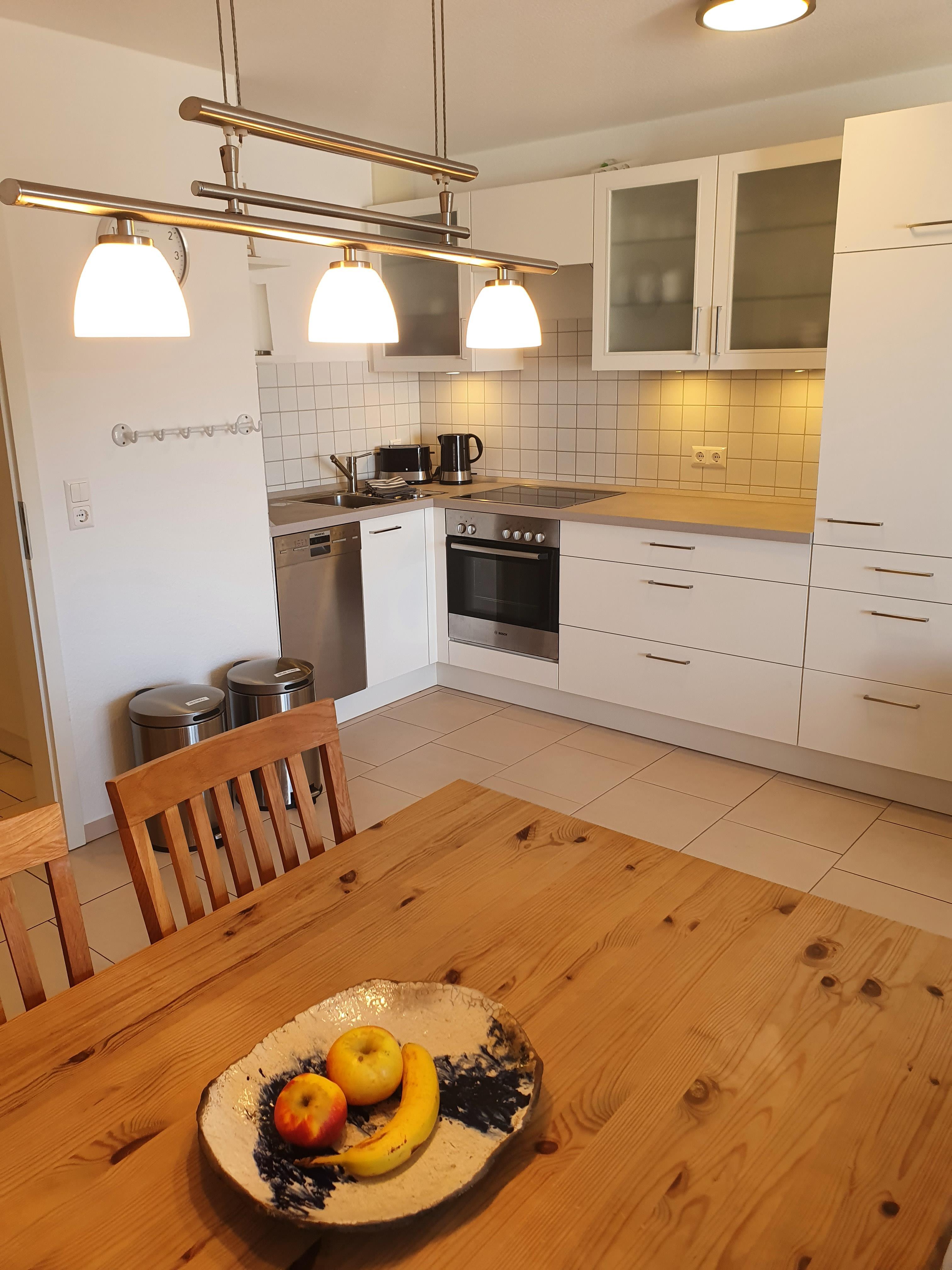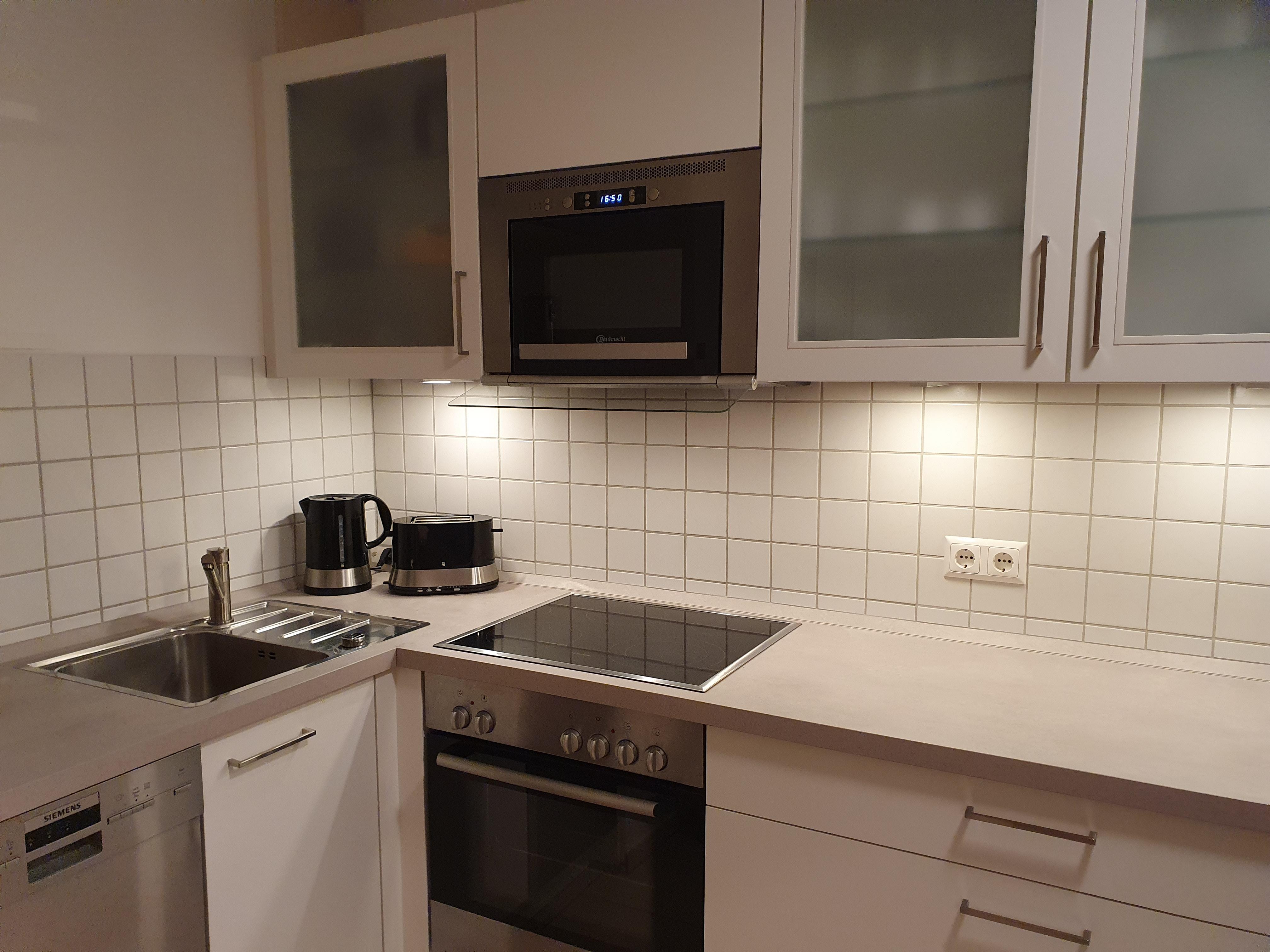 Eine neue vollausgestattete Einbauküche inkl. Geschirrspülmaschine, Backofen/ Ceranfeld, Mikrowelle, Kühlschrank mit Gefrierfach und Kleinküchengeräte lädt zum Kochen ein.