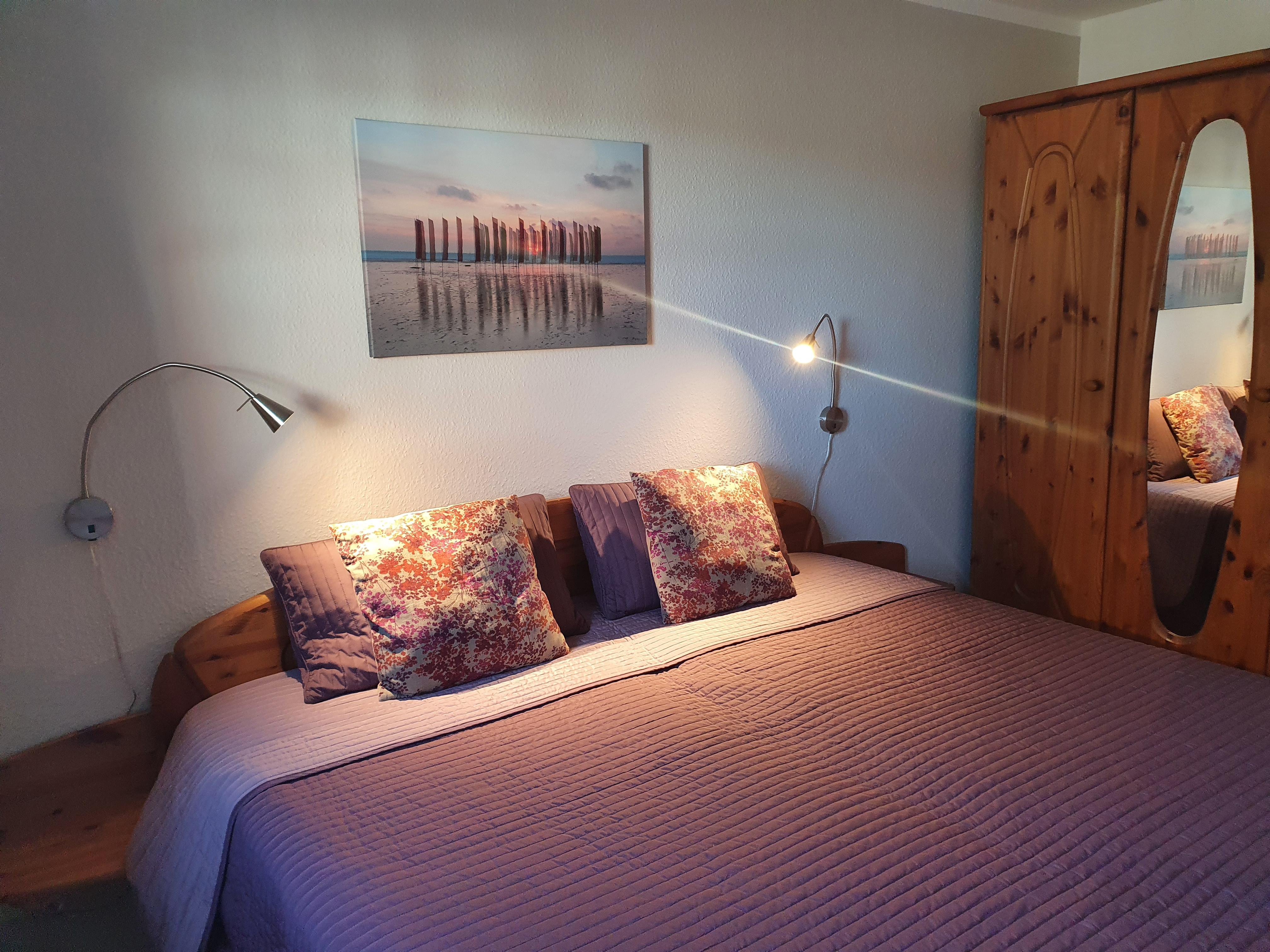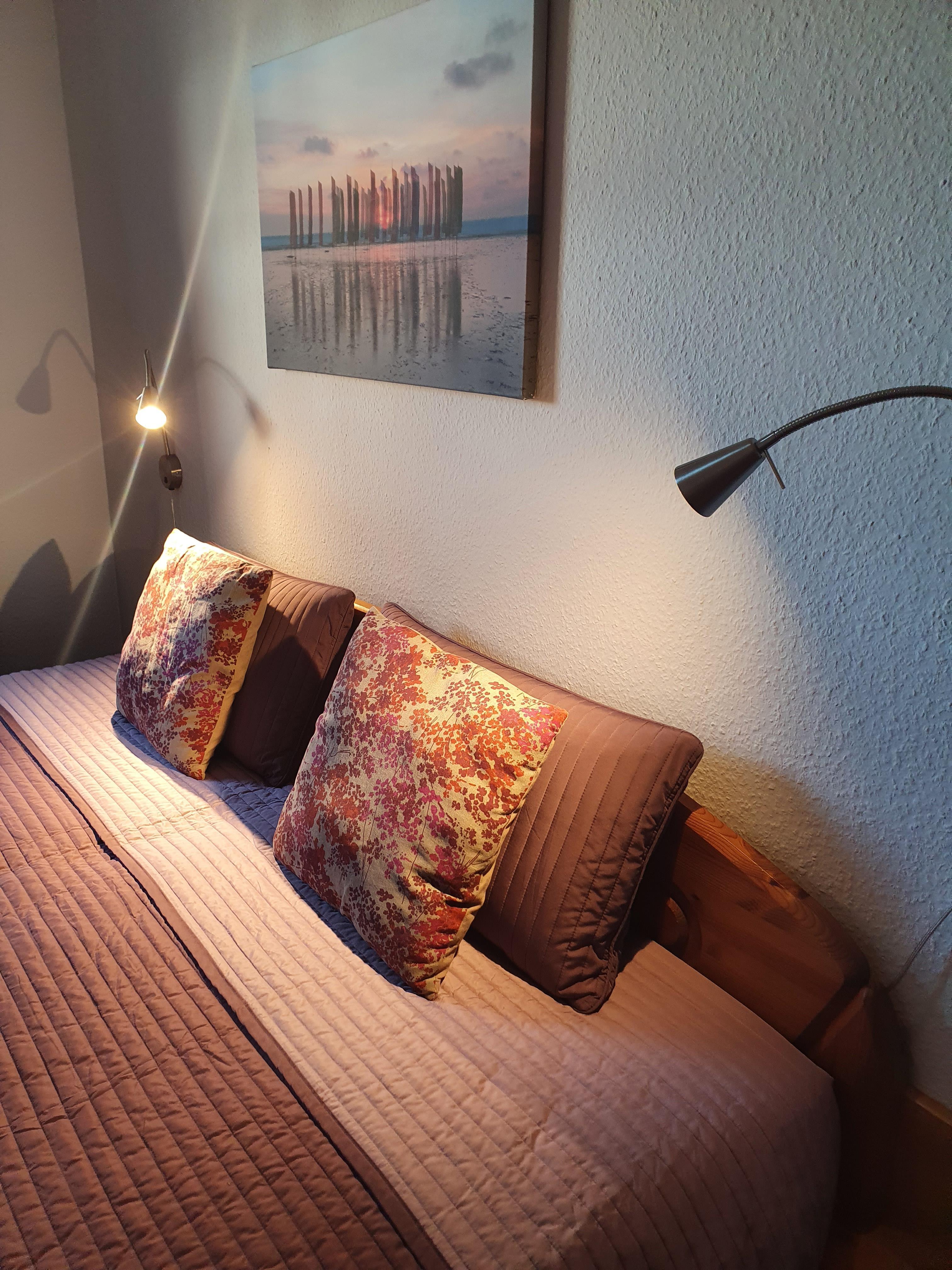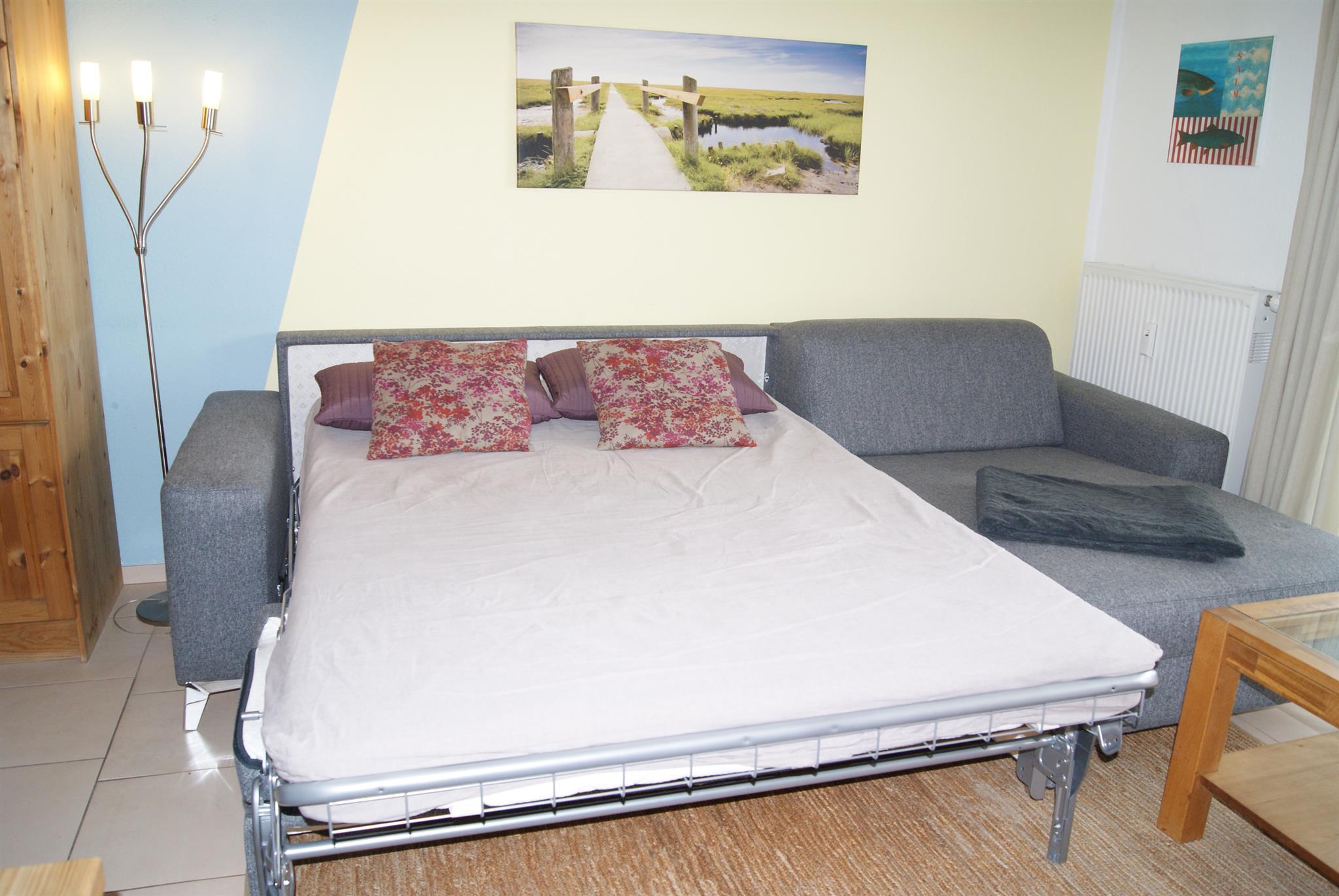 Die Wohnung verfügt über ein separates Schlafzimmer mit Doppelbett (zwei 7-Zonen Taschenfederkernmatratzen H3 1,80 m x 2,00 m) und einer Schlafcouch mit Matratze (1,40 m x 1,90 m) im Wohnzimmer für die 3. Person.