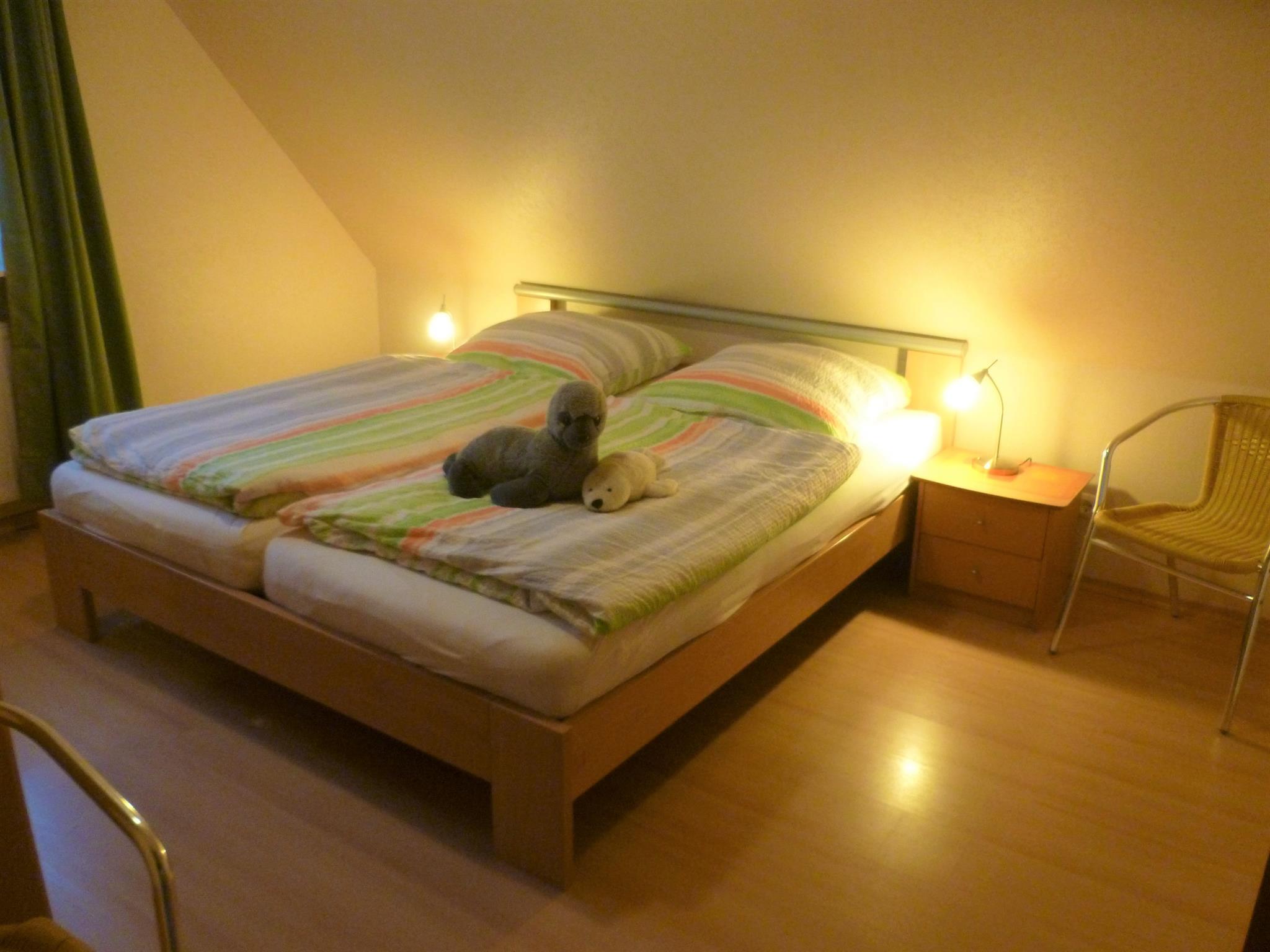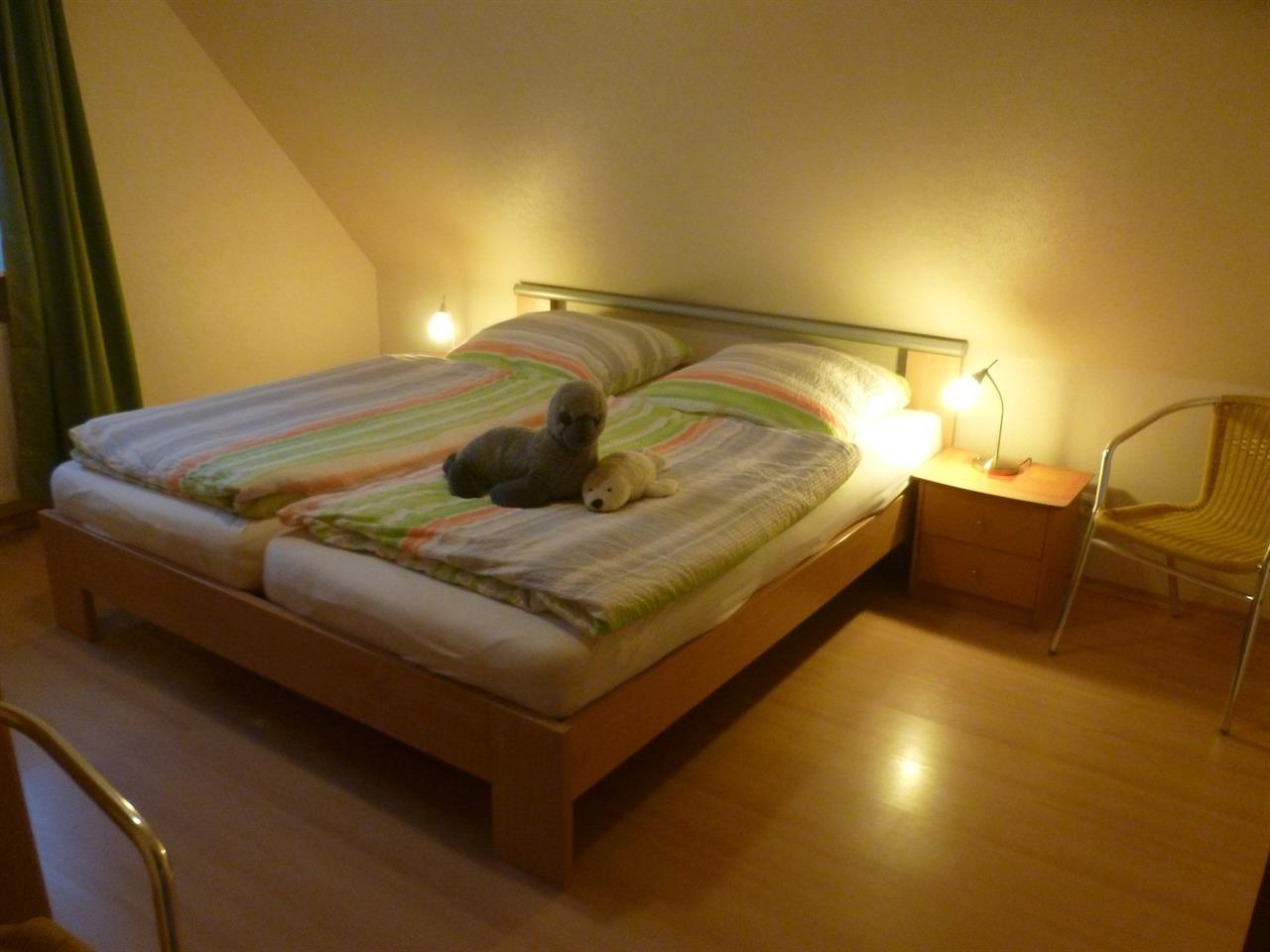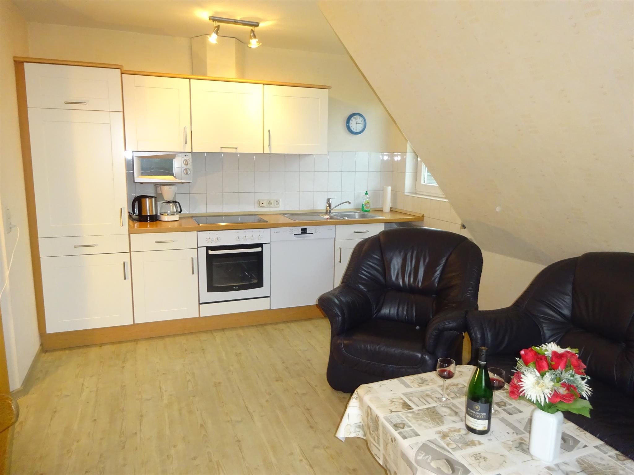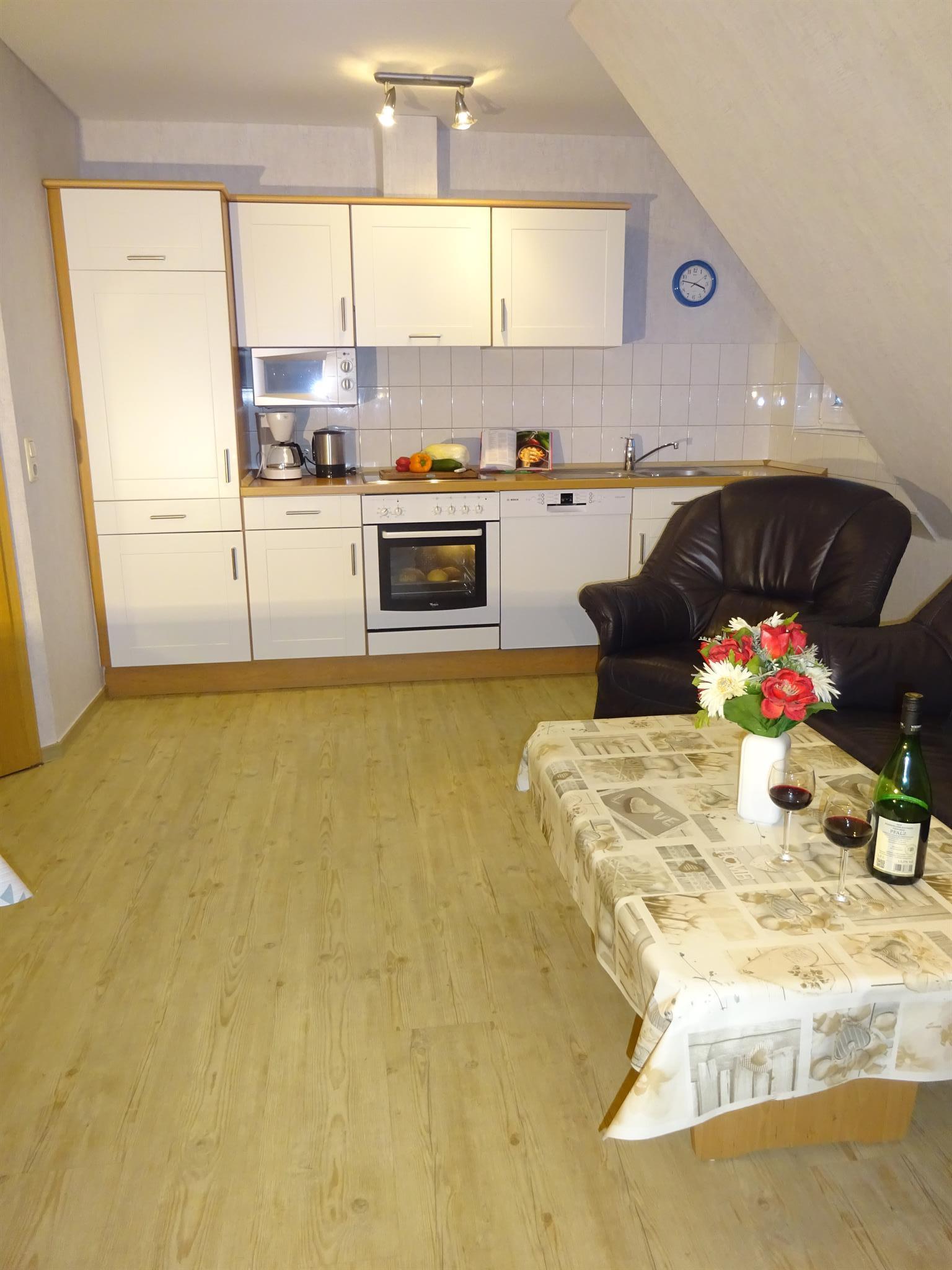 Die 55 qm große Dachgeschosswohnung hat einen separaten Eingang und besteht aus einer Wohnküche mit Sitz- und Essecke. Sie ist ausgestattet mit einem Sat-Farbfernseher und DVD-Player sowie einem Radio mit CD-Player.Die Küchenzeile im Wohnbereich ist komplett eingerichtet u.a. mit Geschirrspüler, Mikrowelle und Backofen. 1 Schlafzimmer mit Doppelbett und 1 Schlafzimmer mit 2 Einzelbetten sorgen für eine erholsame Nacht. Die Wohnung verfügt über ein Bad mit Dusche/WC und einen Flur. Zusätzlich steht auf der gleichen Etage ein Abstellraum zur Verfügung. Die Wohnung hat keinen Teppichboden. Auf Wunsch können Kinderbett u. -hochstuhl sowie Allergikerbettwäsche kostenlos gestellt werden. Die Endreinigung ist inkl.