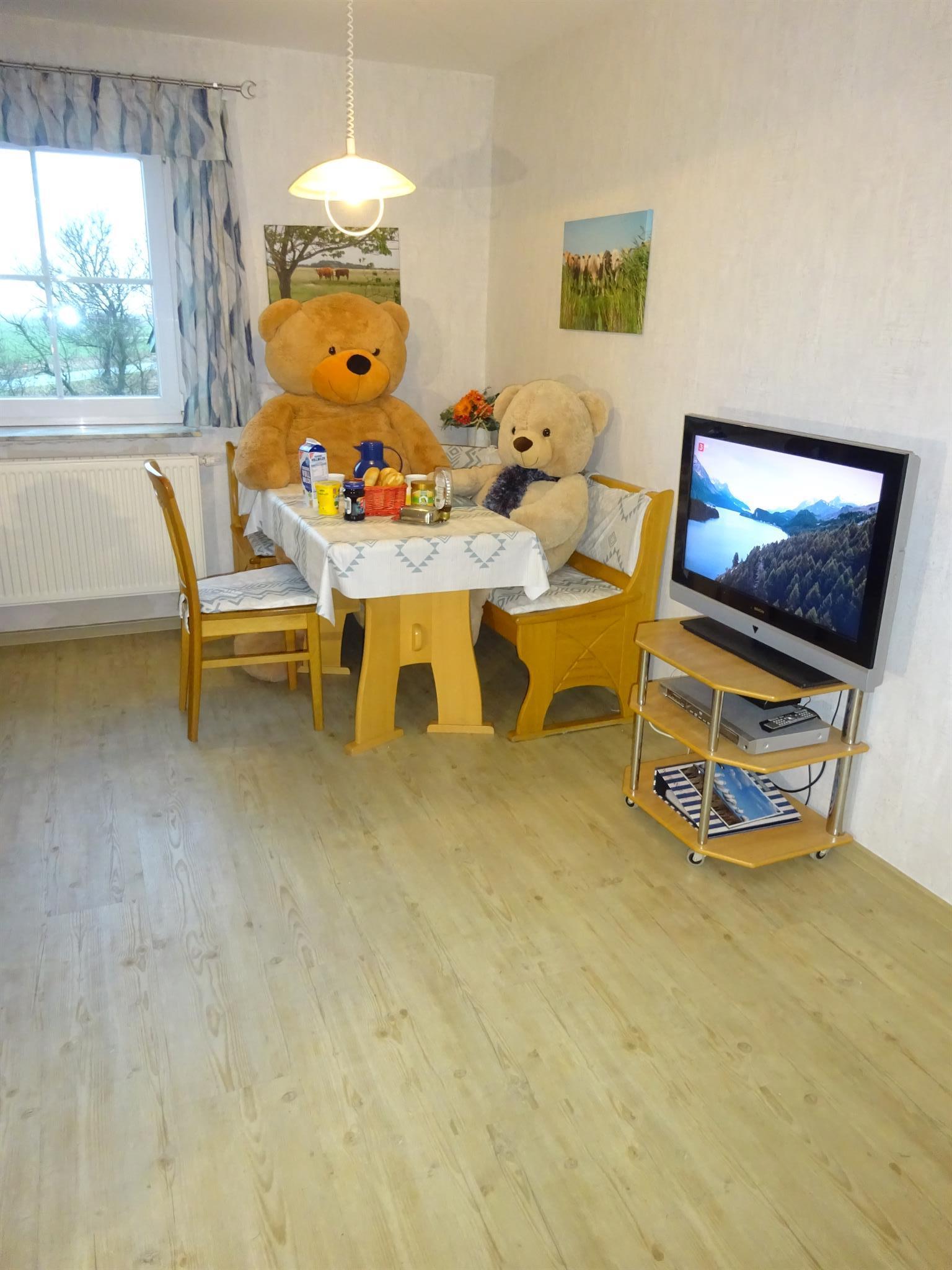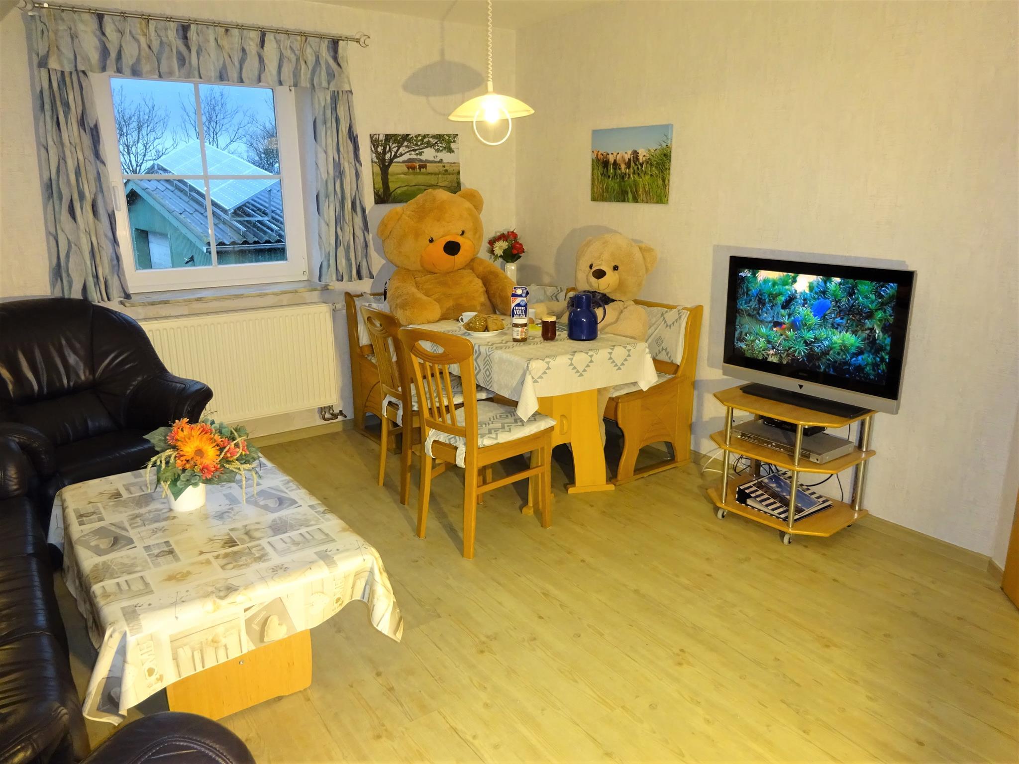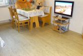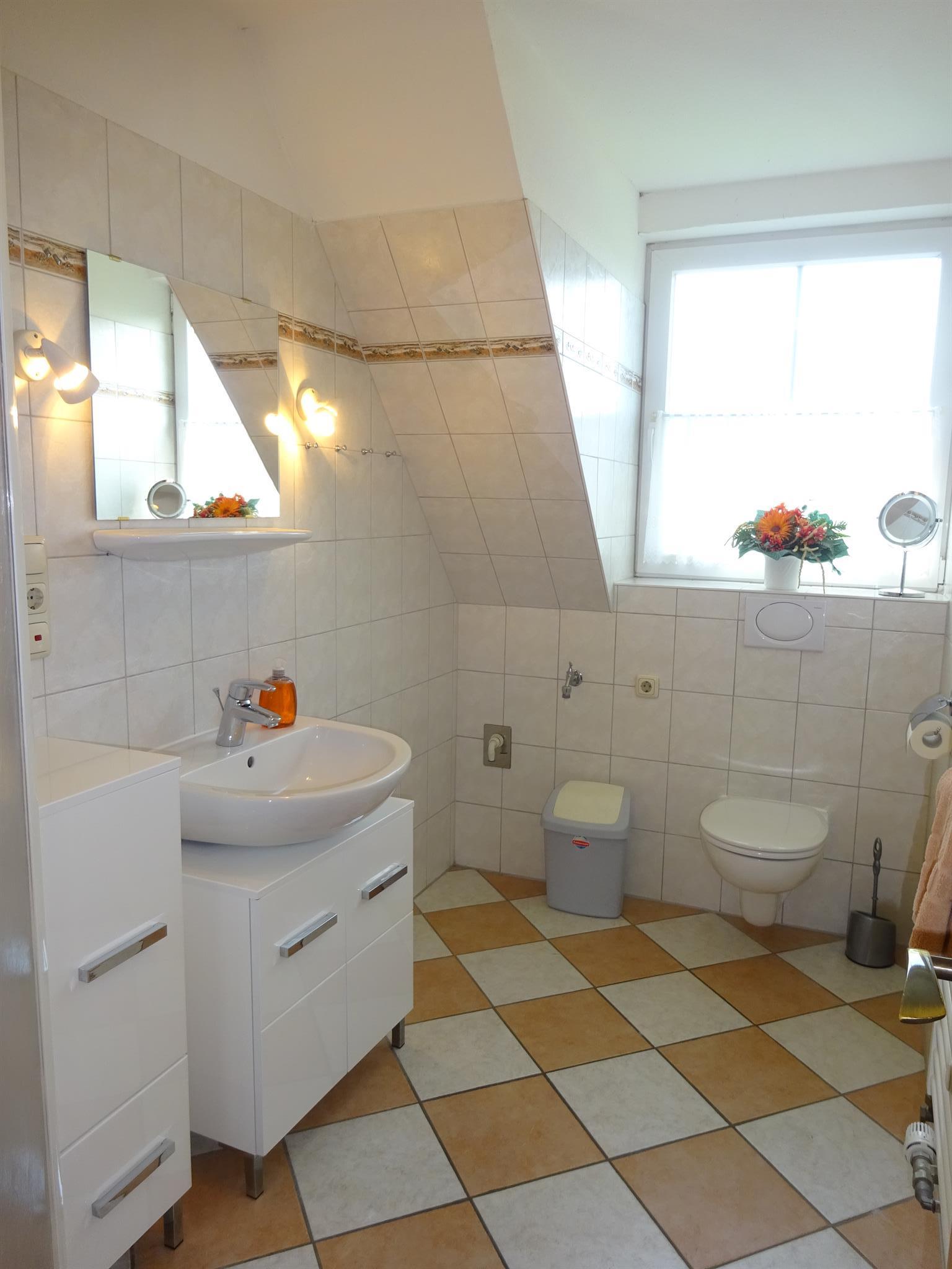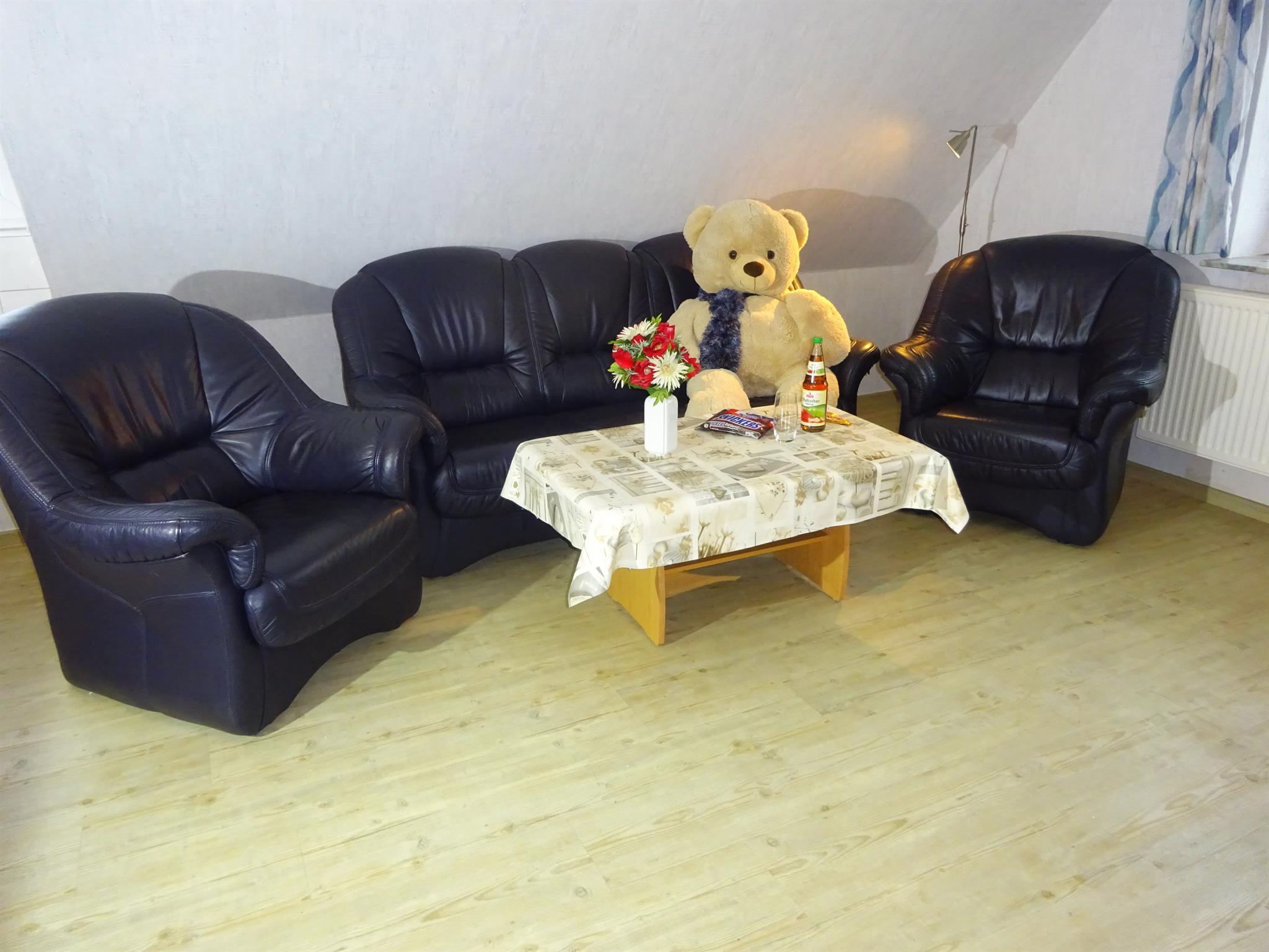 Die 55 qm große Dachgeschosswohnung hat einen separaten Eingang und besteht aus einer Wohnküche mit Sitz- und Essecke. Sie ist ausgestattet mit einem Sat-Farbfernseher und DVD-Player sowie einem Radio mit CD-Player.Die Küchenzeile im Wohnbereich ist komplett eingerichtet u.a. mit Geschirrspüler, Mikrowelle und Backofen. 1 Schlafzimmer mit Doppelbett und 1 Schlafzimmer mit 2 Einzelbetten sorgen für eine erholsame Nacht. Die Wohnung verfügt über ein Bad mit Dusche/WC und einen Flur. Zusätzlich steht auf der gleichen Etage ein Abstellraum zur Verfügung. Die Wohnung hat keinen Teppichboden. Auf Wunsch können Kinderbett u. -hochstuhl sowie Allergikerbettwäsche kostenlos gestellt werden. Die Endreinigung ist inkl.