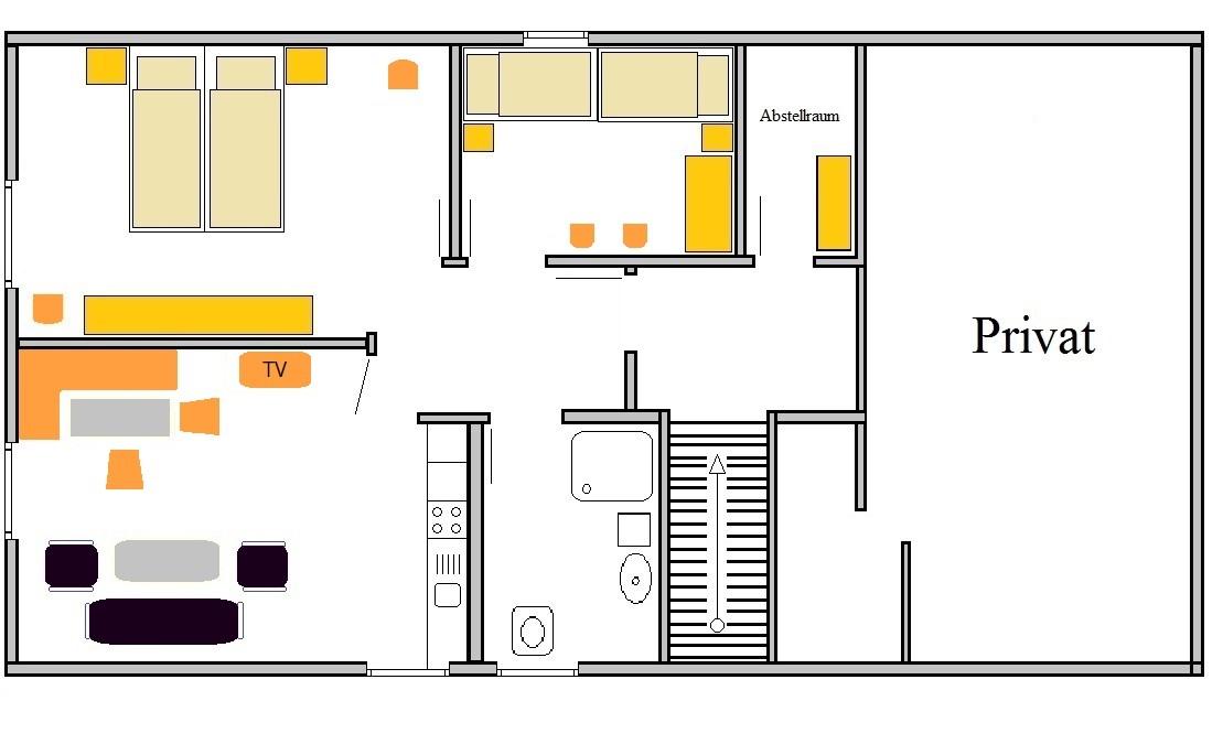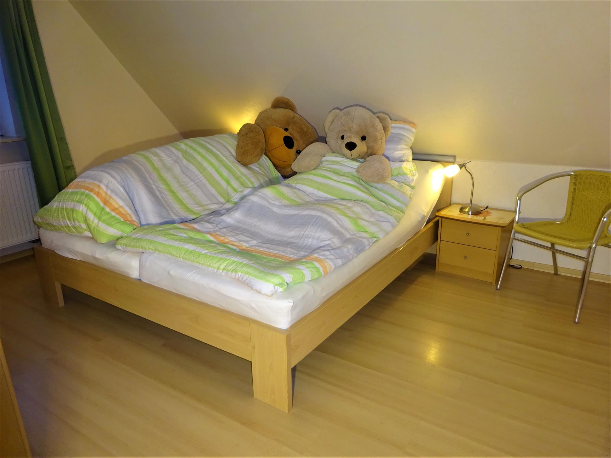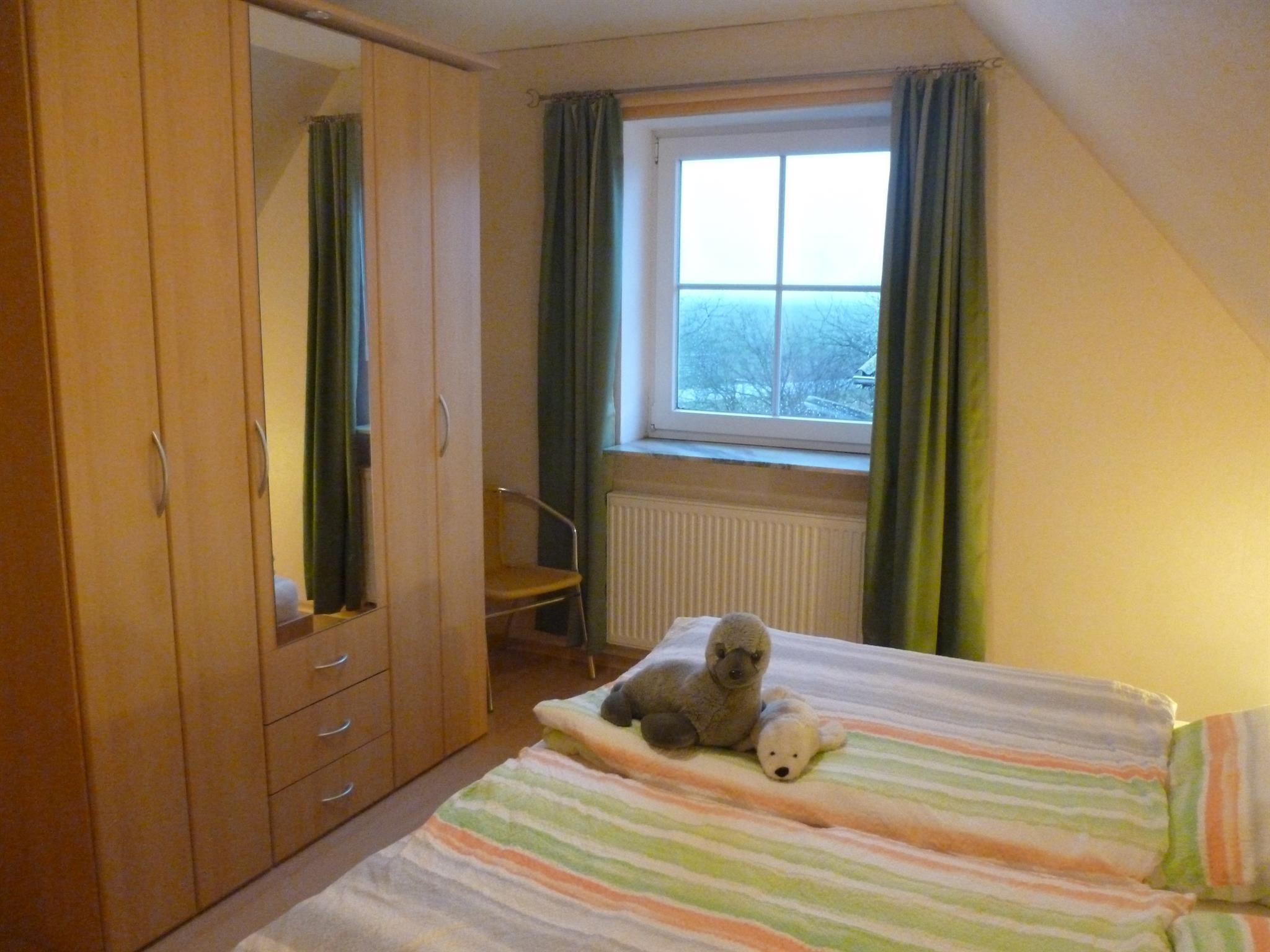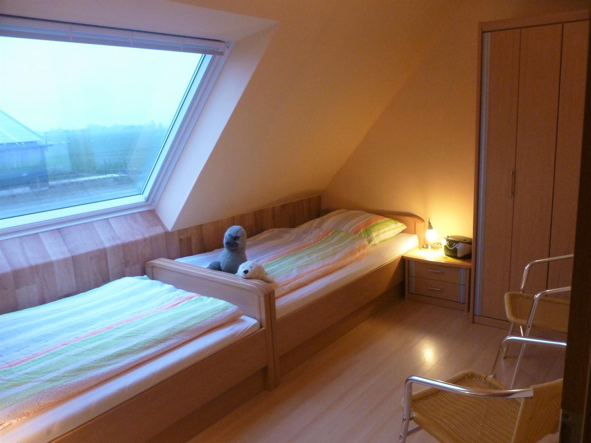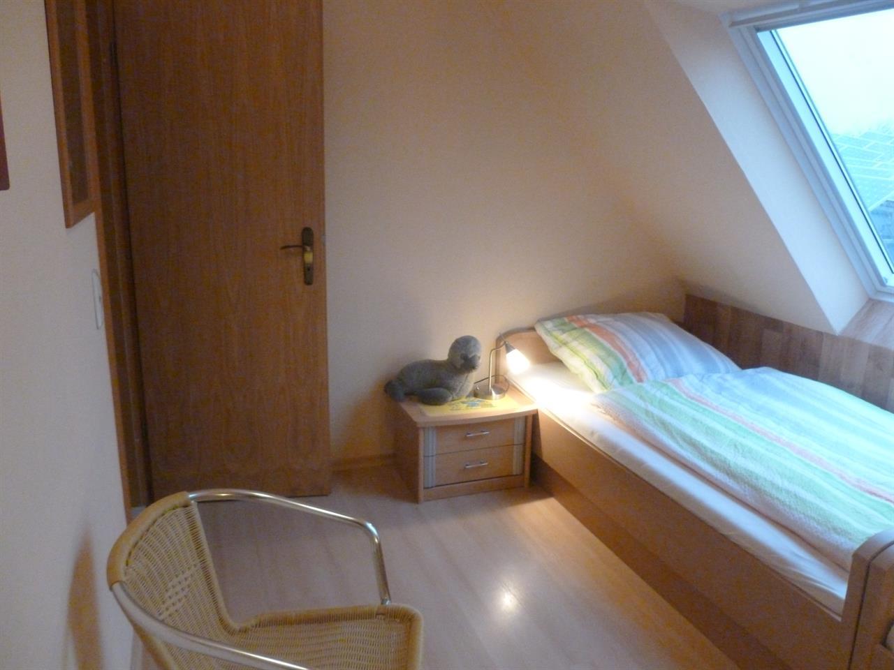 Im Dachgeschoss wohnen Sie in einer 55 qm großen Ferienwohnung mit 2 Schlafräumen mit Verdunklungsrollos, einer Wohnküche, Dusche/WC, Flur und Abstellraum.