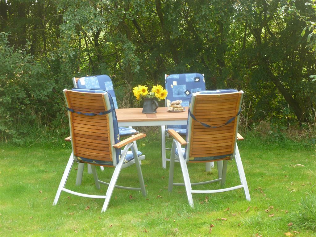 Der große Garten mit Liegewiese kann zum Sonnen, Grillen und Spielen genutzt werden. Gartenmöbel stehen dort bereit. Im Gartenhaus können Sie Fahrräder, Surfbretter etc. abstellen