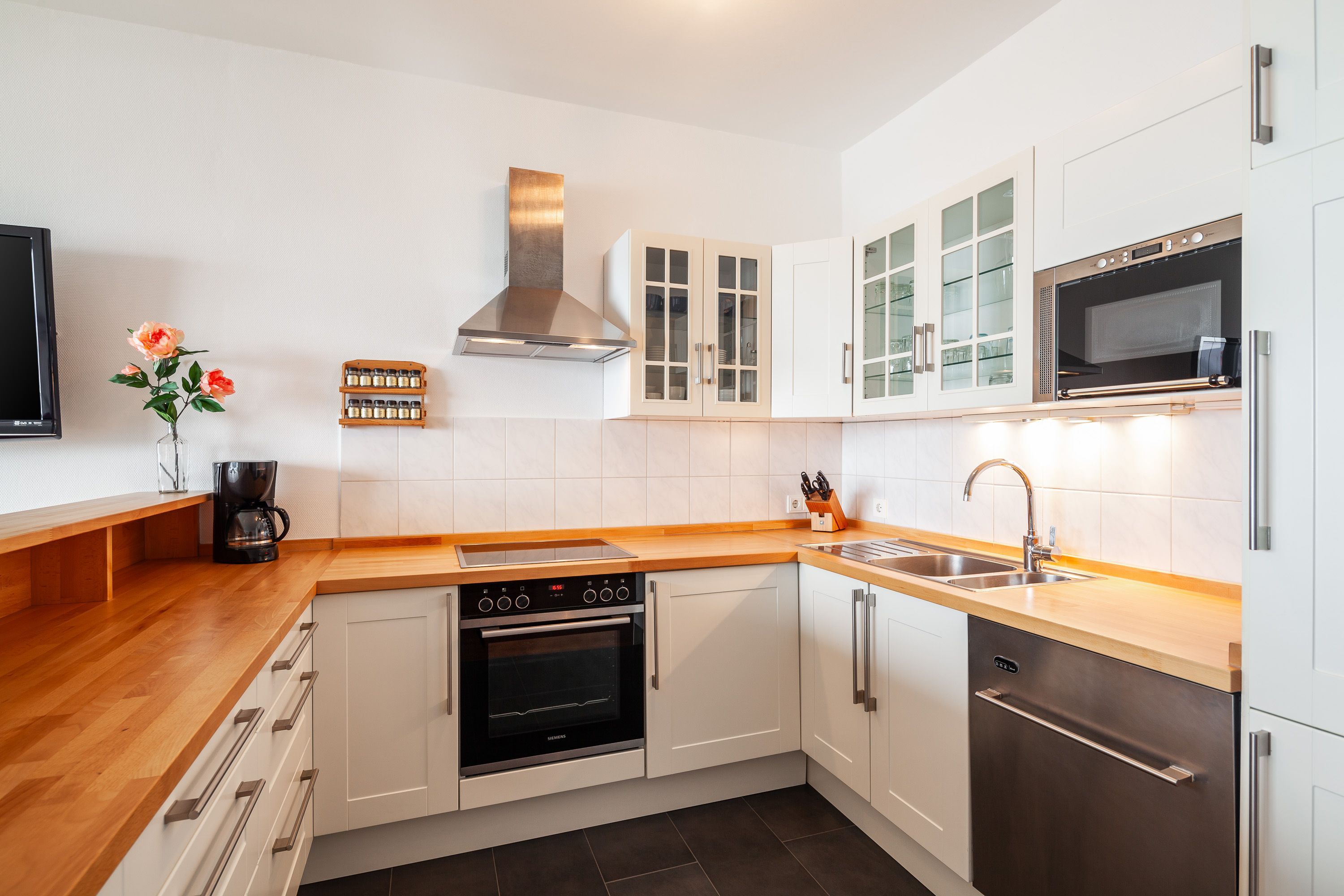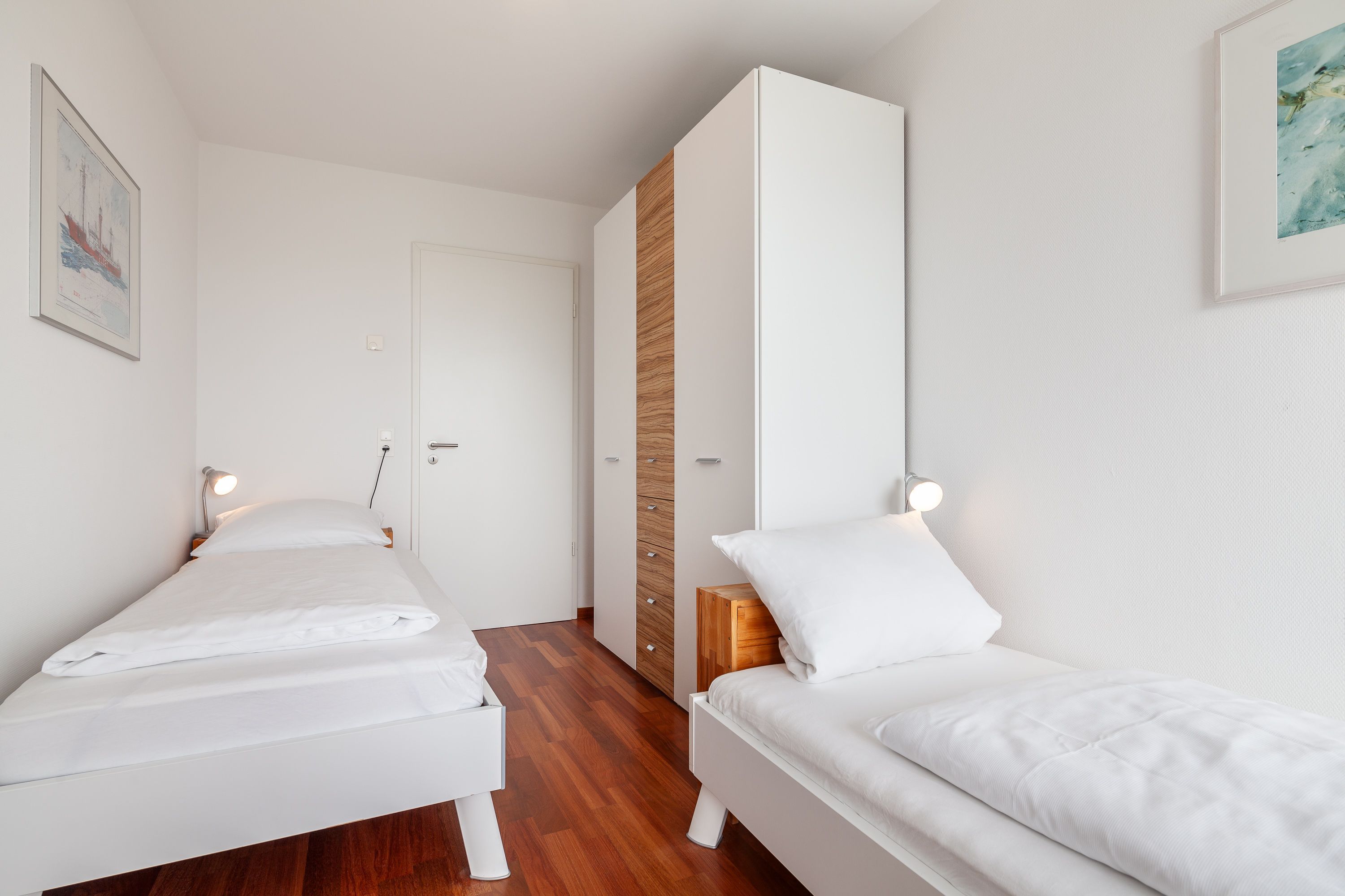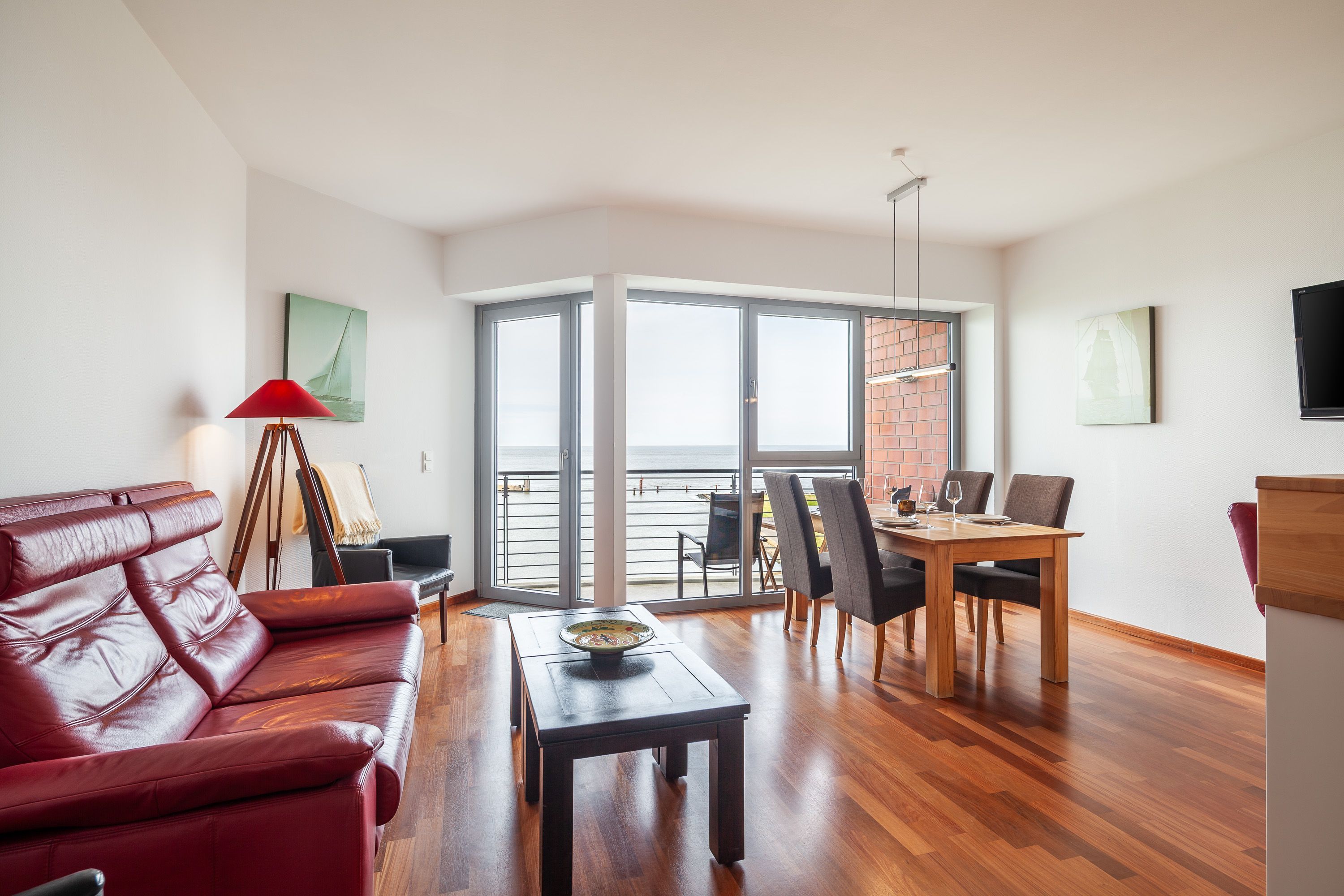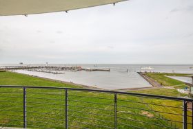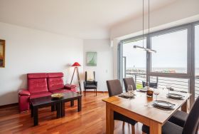 Sehr geschmackvolle 3-Raum-Wohnung in der 4. Etage mit dem atemberaubenden Blick auf die Elbmündung. Großes Wohnzimmer mit offener, voll ausgestatteter Küche, Esstisch, Balkon zur Seeseite, 1 Schlafzimmer mit Doppelbett, 1 Schlafzimmer mit zwei Einzelbetten, beide Schlafzimmer haben Zugang zum sonnigen Südbalkon mit Strandkorb. 1 Bad/Du/Wc, 1 Du/Wc, reservierter Pkw-Stellplatz auf dem Außengelände, Nichtraucher, keine Haustiere.