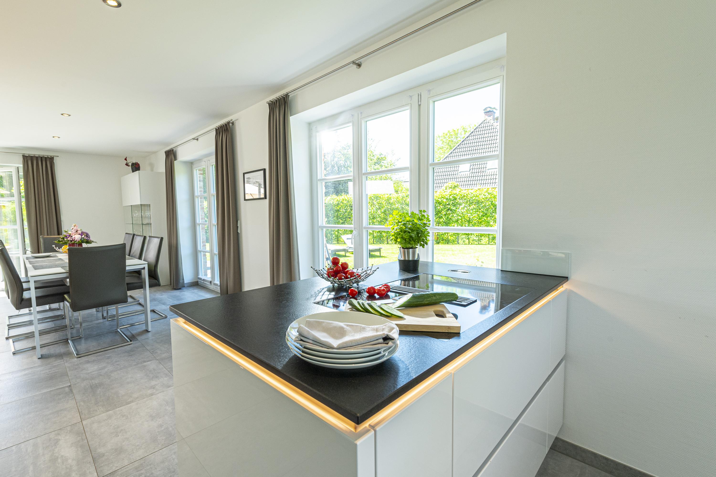 Angrenzend finden sich die luxuriös ausgestattete offene Küchenzeile mit modernen Geräten - hier wird gemeinsames Kochen im Urlaub zu einem besonderen Erlebnis! Neben einem Induktions-Kochfeld mit Dunstabzug, bietet die Küche sowohl Backofen als auch Dampfgarofen, Spülmaschine, Kaffeemaschine uvm. Vom Wohnbereich aus gelangt man auf die große Südterasse mit Strandkorb. Hier lässt sich der Urlaub zu jeder Tageszeit genießen. Egal ob in der gemütlichen Sitzecke oder im Strandkorb kann man seinen Blick über den großen Garten streifen lassen und sich vom Alltag erholen.