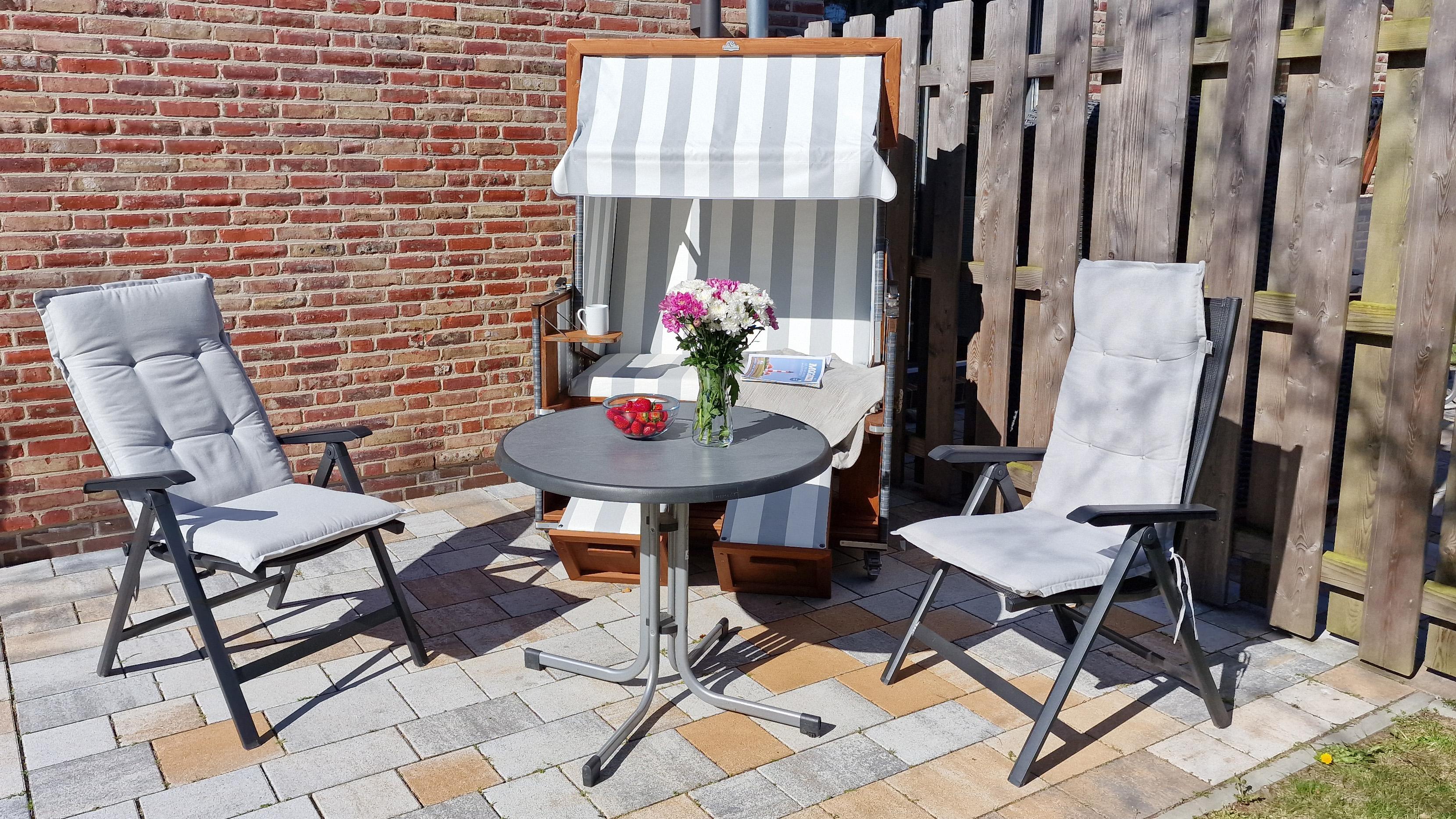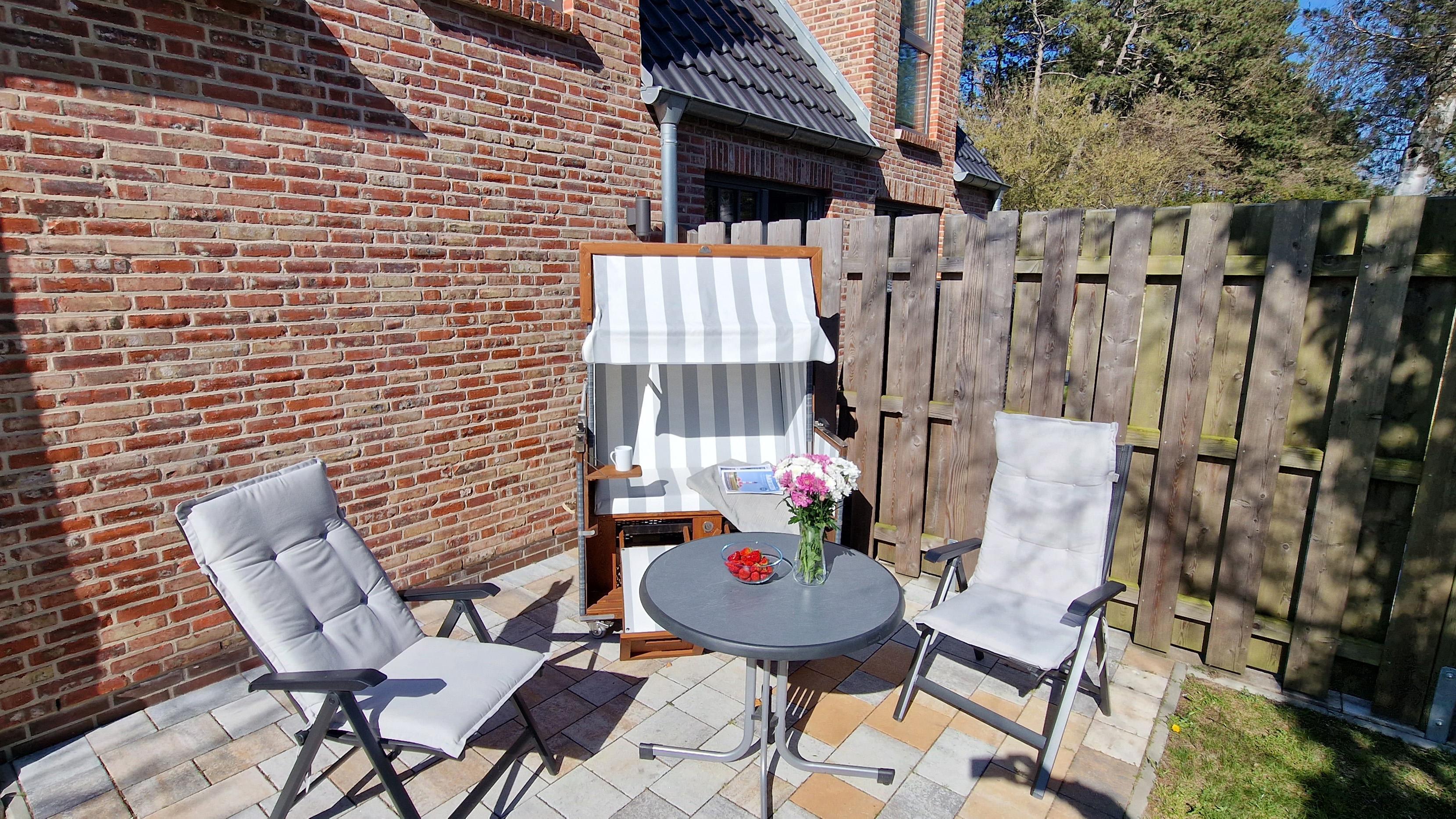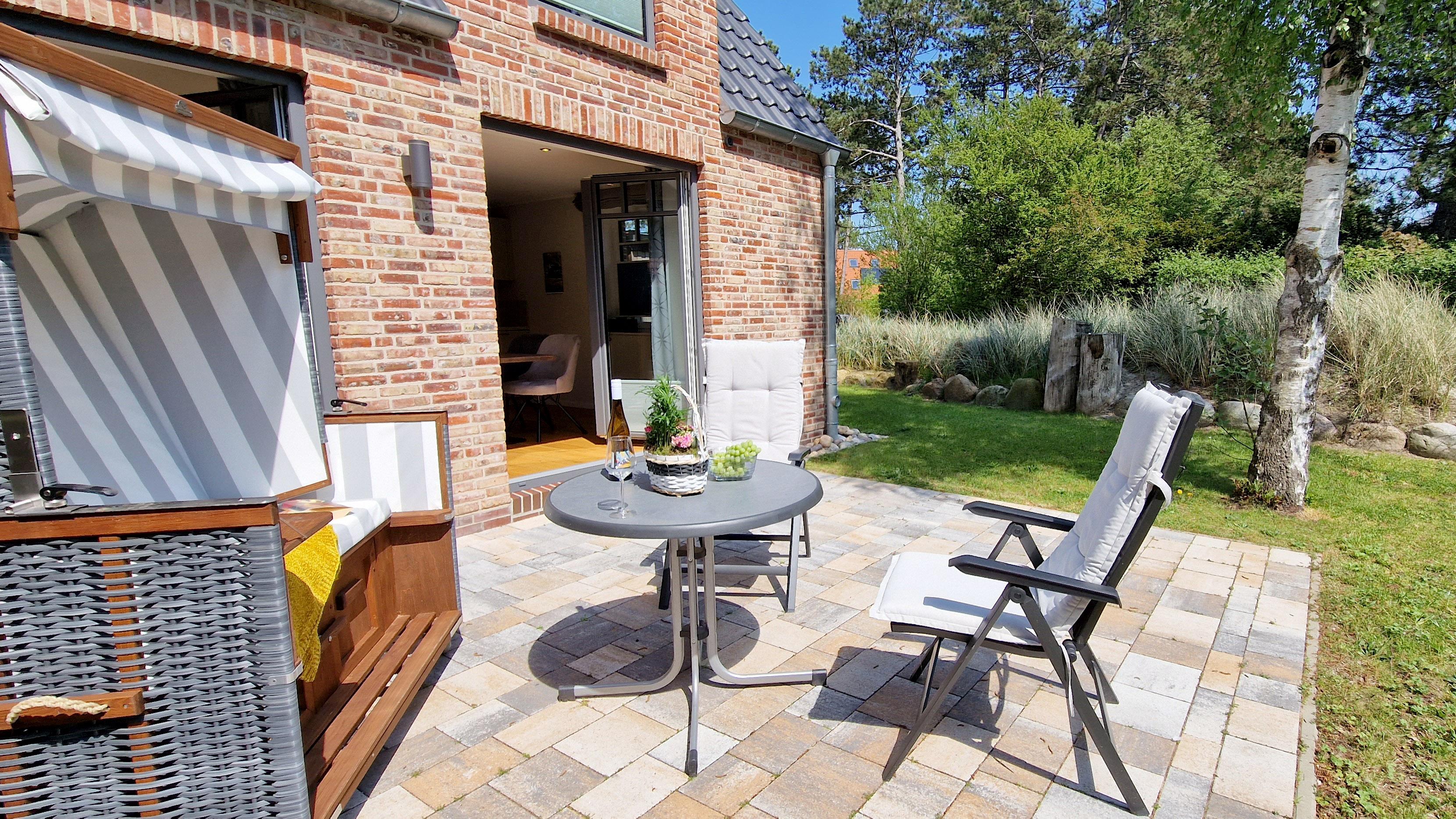 Terrasse: Terrasse mit Gartenmöbeln und Zugang zum Garten