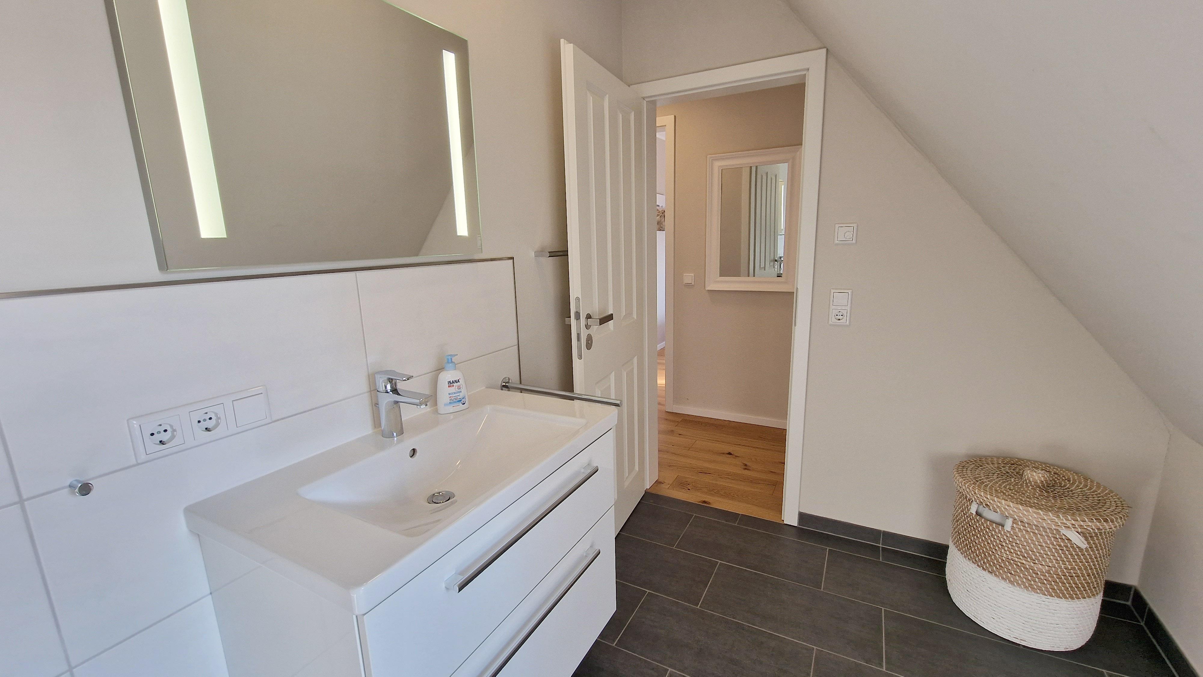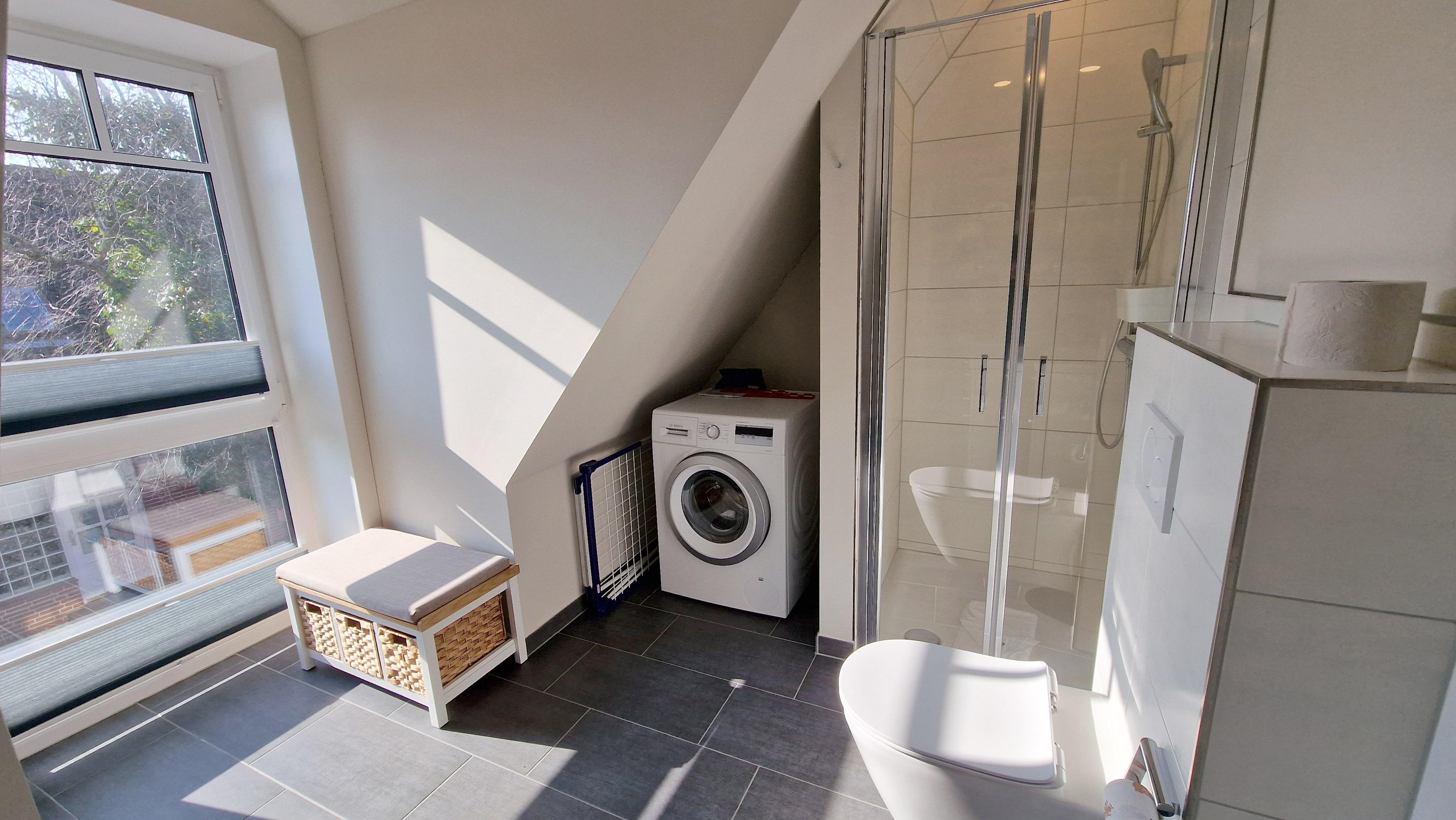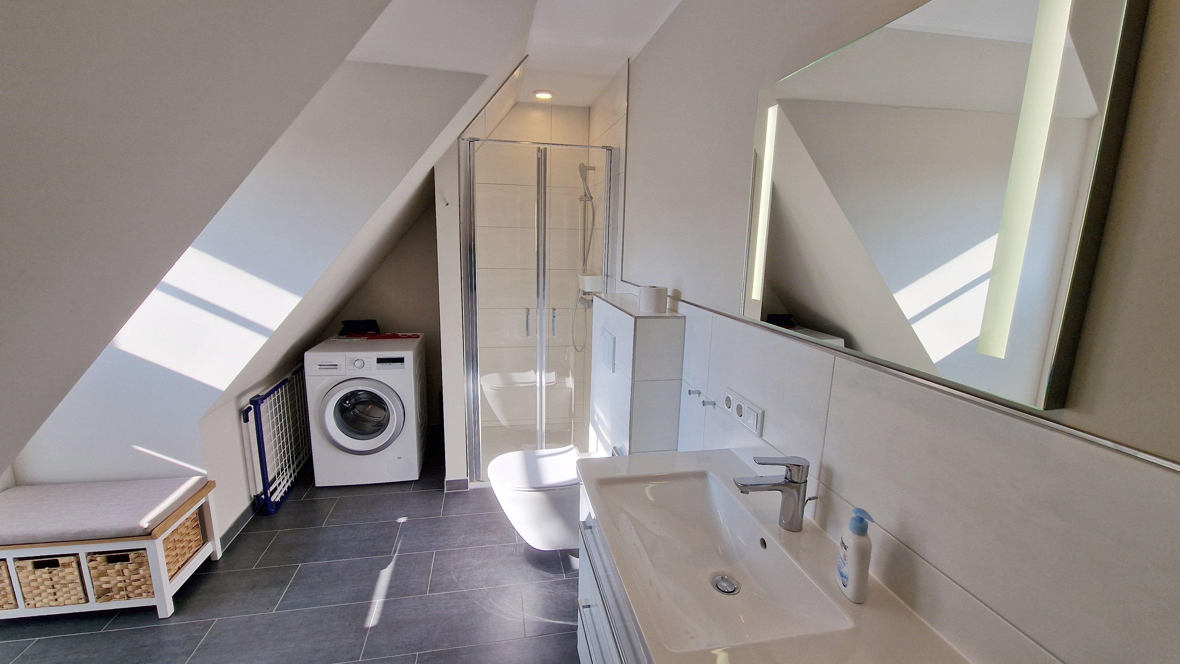 Bad: begehbare Dusche, WC, Wachbecken, Spiegel, Ablage, Waschmaschine,Wäscheständer.