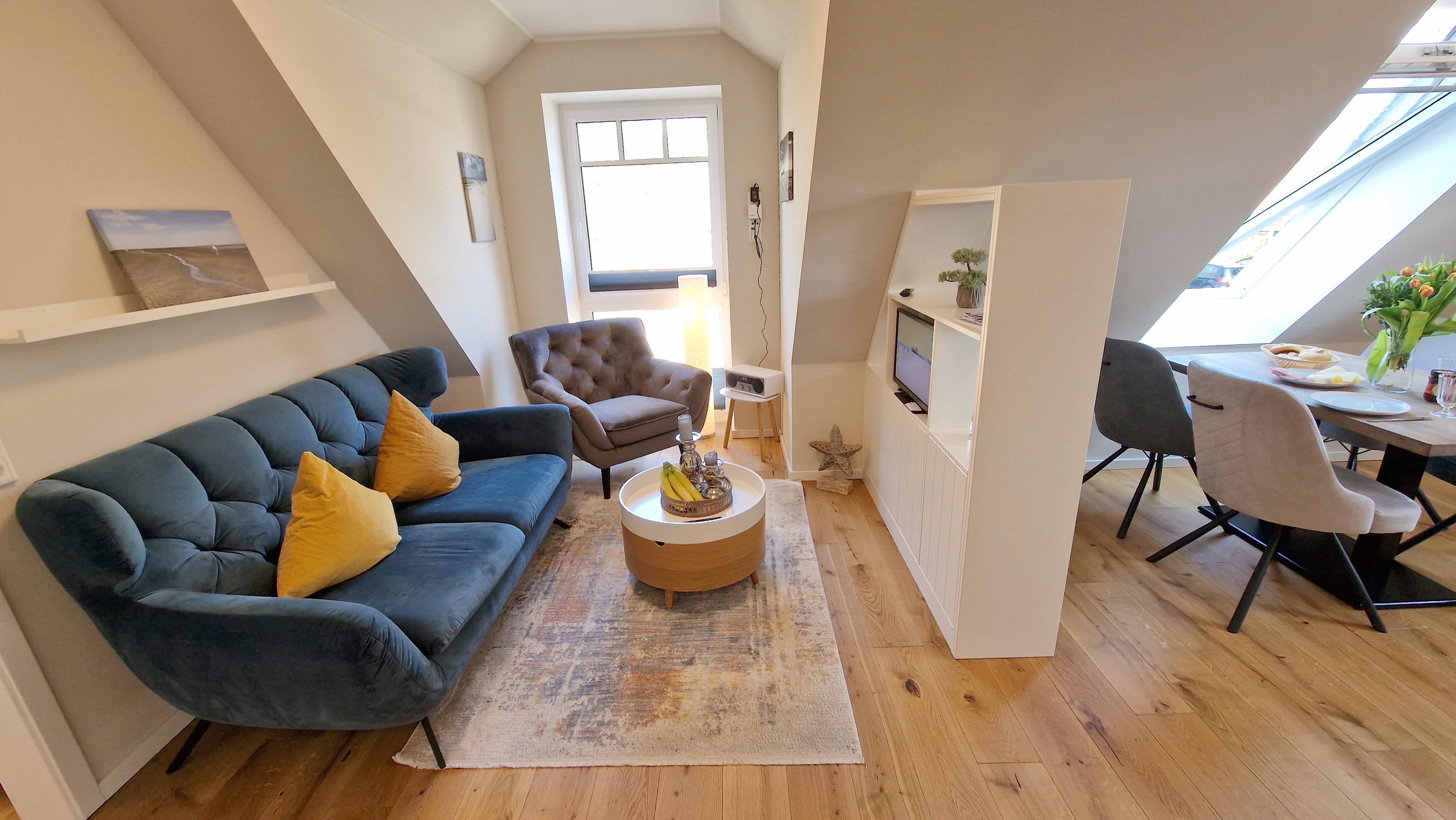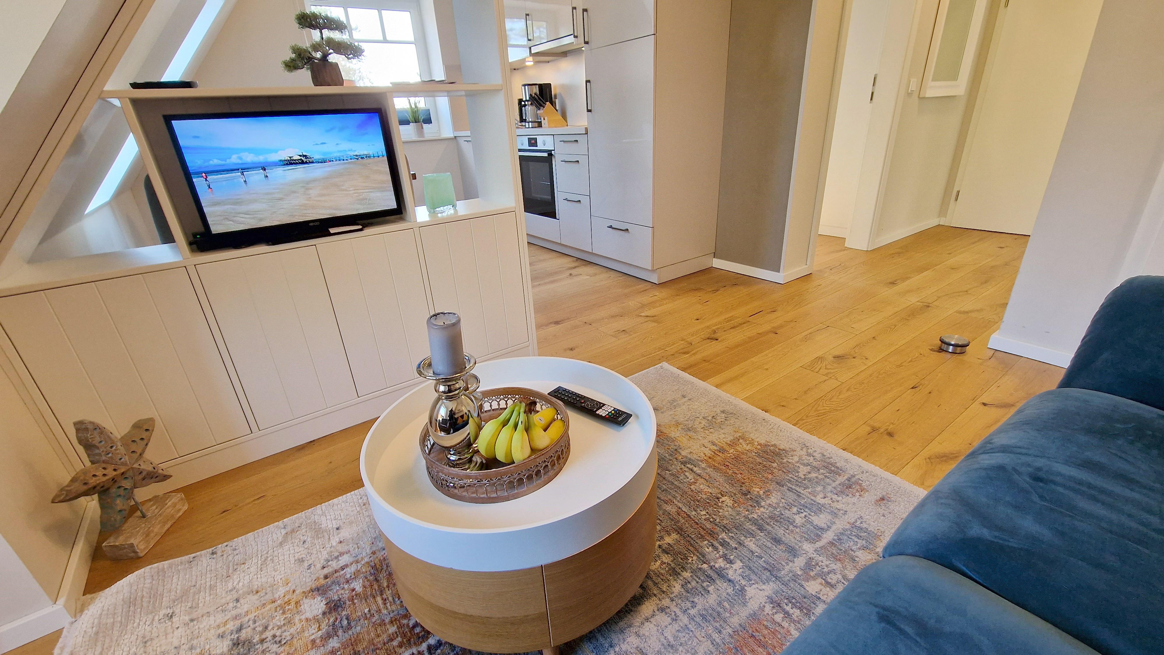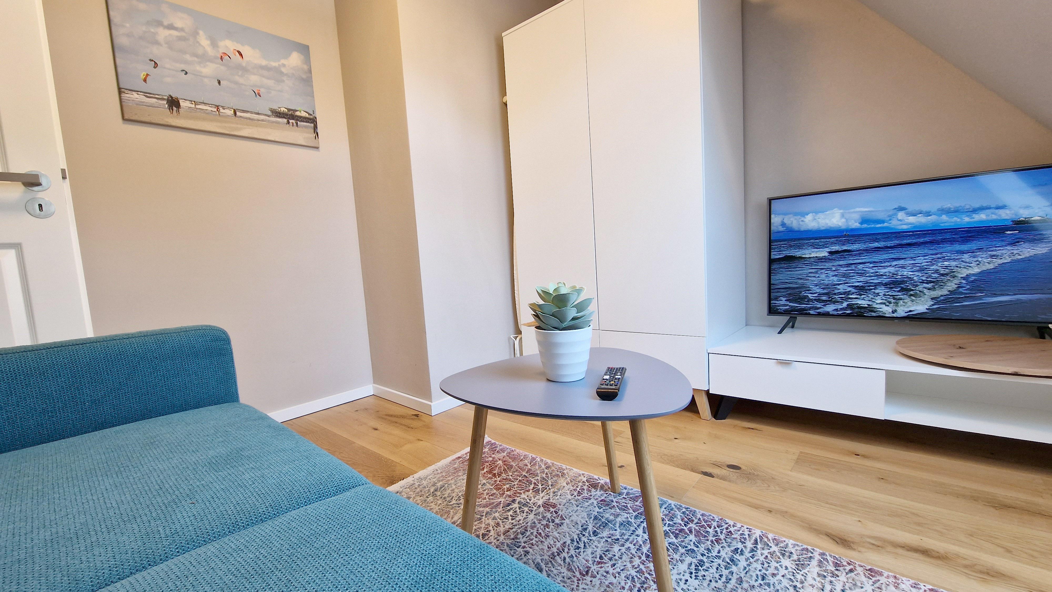 Wohnzimmer: Couch, Couchtisch, Flachbild-TV, Stehlampe, Essplatz mit 4 Stühlen.