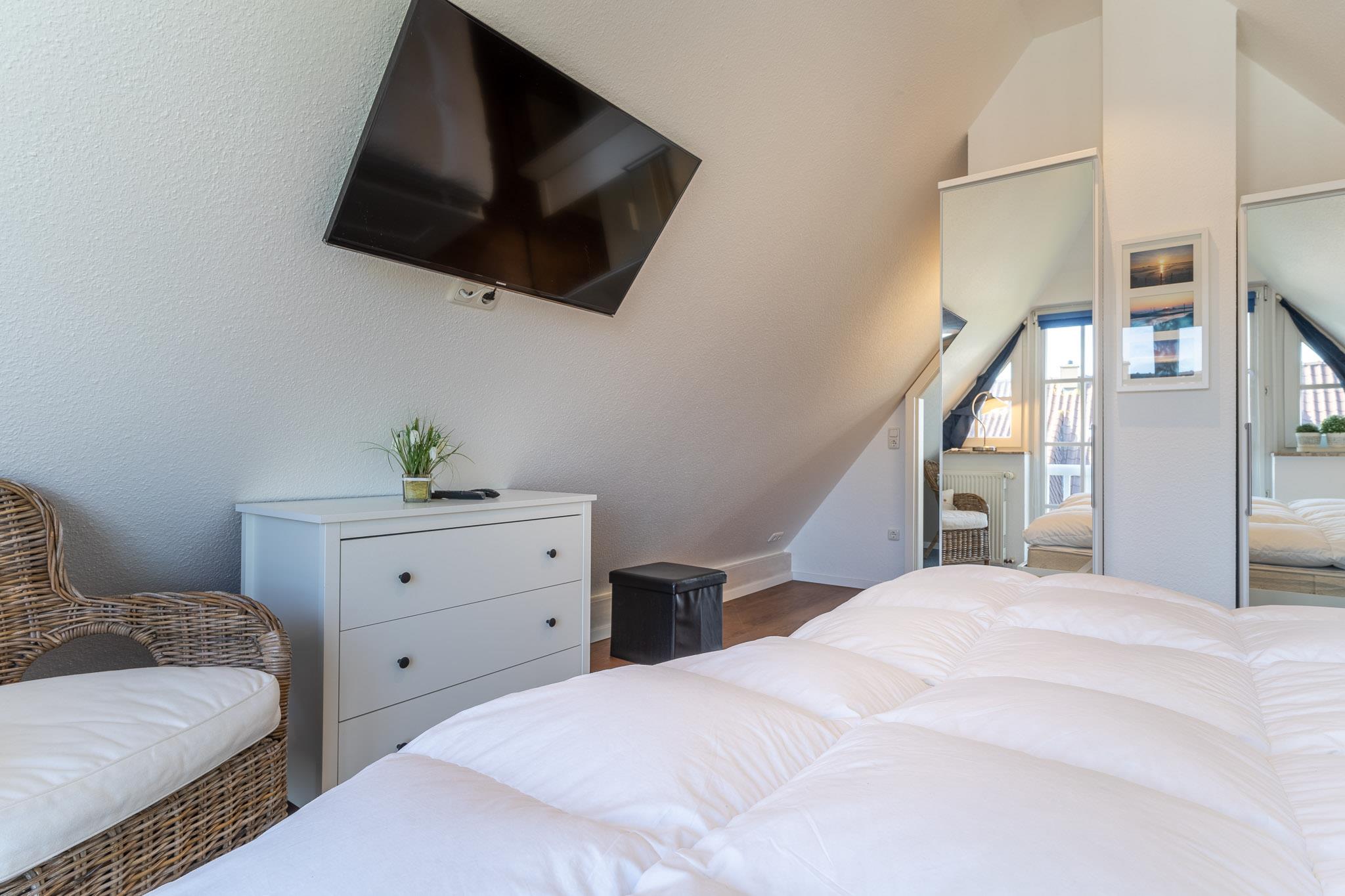 Beide Schlafzimmer der Wohnung sind mit Doppelbetten ausgestattet, selbstverständlich auch mit Bandscheibenmatratzen und waschbaren Einziehdecken. Ein neuer Design-Boden wurde in beiden Schlafzimmern verlegt. Das eine Schlafzimmer befindet sich auf der Wohnebene, das zweite erreichen Sie über die Galerie in der oberen Wohnetage. Ein bodentiefes großes Fenster nach Osten lässt den ersten Sonnenstrahl rein. Besonders eindrucksvoll aber ist der Ausblick weit über die Marschwiesen. In den Wintermonaten können Sie von hier aus die tausende Gänse bestaunen, die auf den Wiesen zur Futtersuche niedergehen. Ein echtes Naturerlebnis! Und wenn Sie auf Natur einmal keine Lust haben, ein zusätzlicher großer Flachbildschirm im oberen Schlafzimmer, WLAN-fähig und über Ihr Handy bedienbar lässt keine Langeweile aufkommen. Auch an die Kleinsten wurde hier oben gedacht: In einer Kuschel- und Spielecke sind sie bestens aufgehoben und haben Spaß.