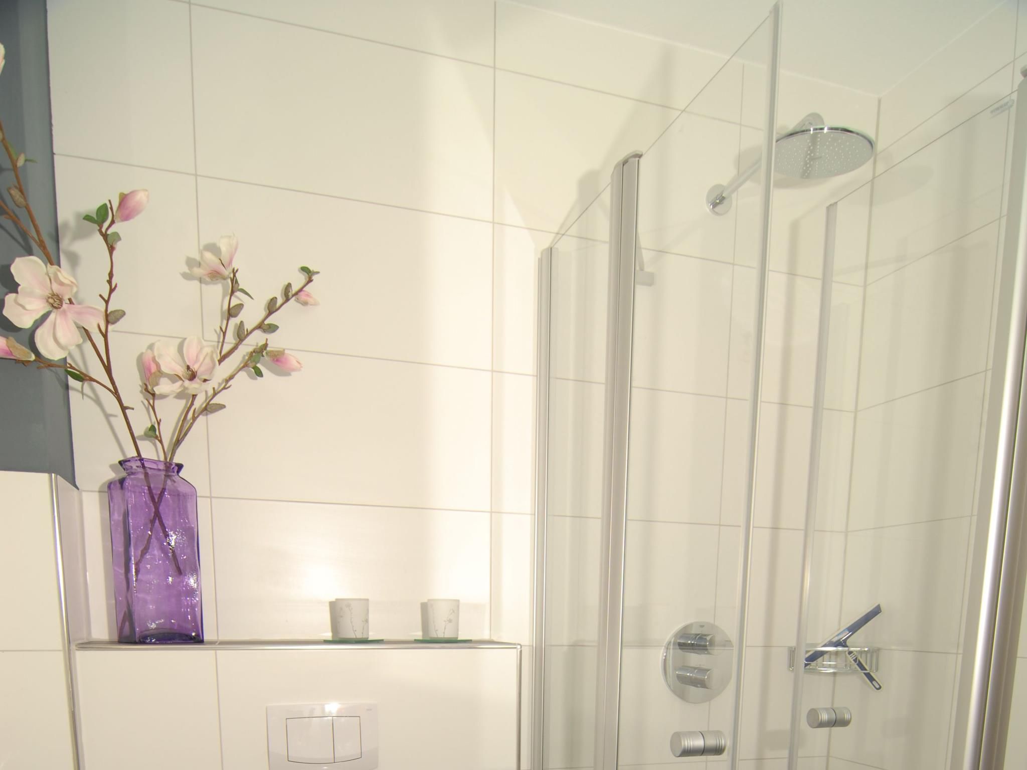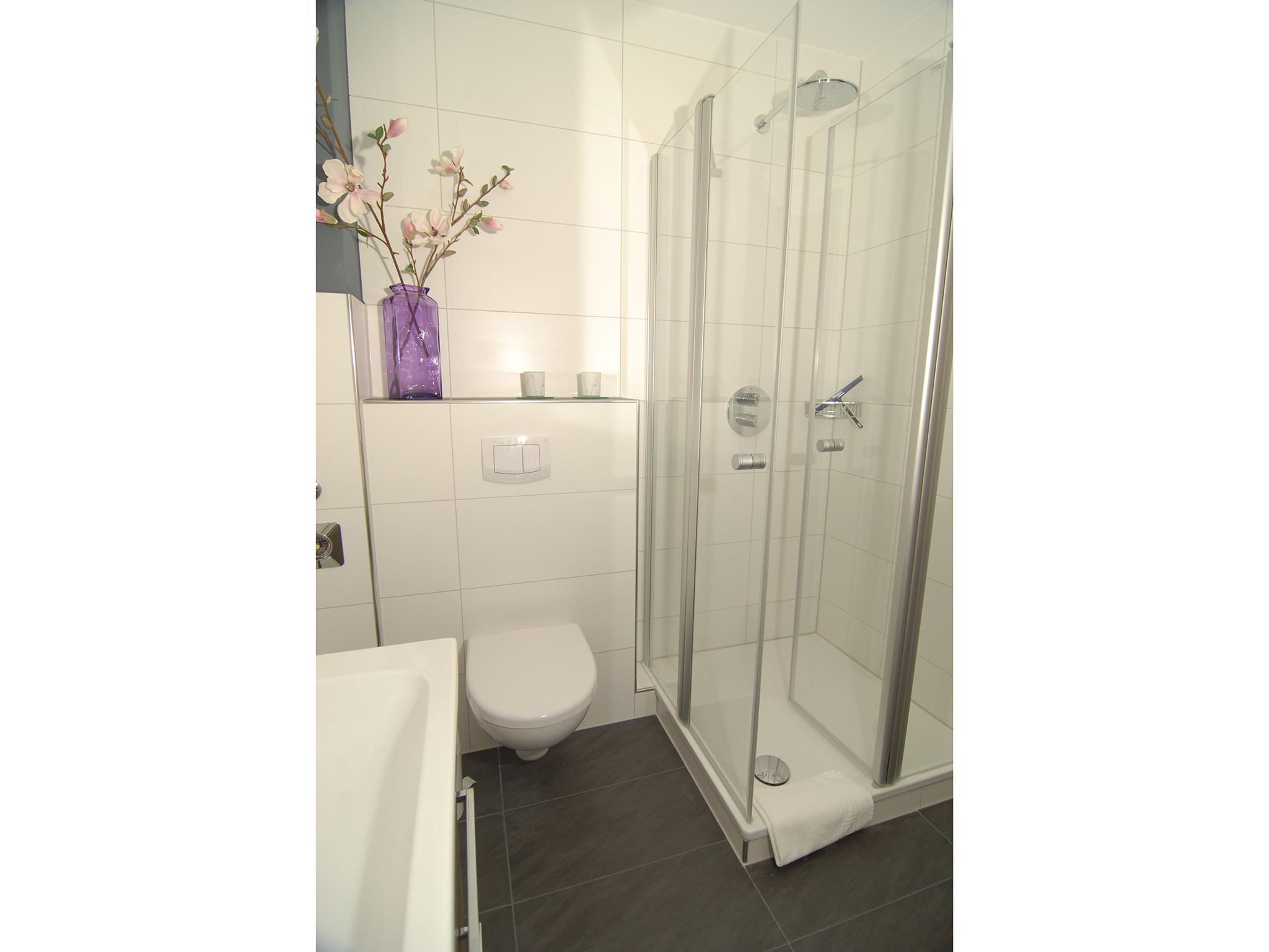 Bad: Dusche, Waschbecken, WC, Schrank, Schränkchen, Duschkabine, Wäscheständer, Staubsauger