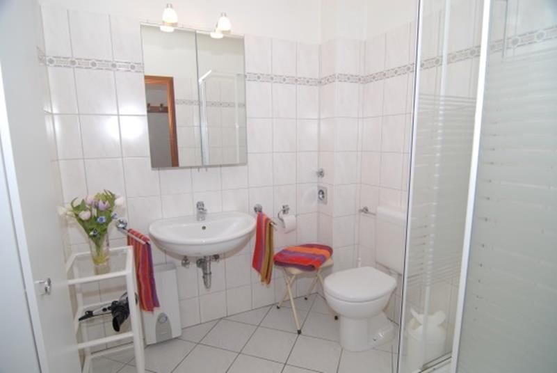 Bad: Dusche, Waschbecken, WC, Regal, Hocker, Schrank, Spiegelschrank, Fön, Duschkabine