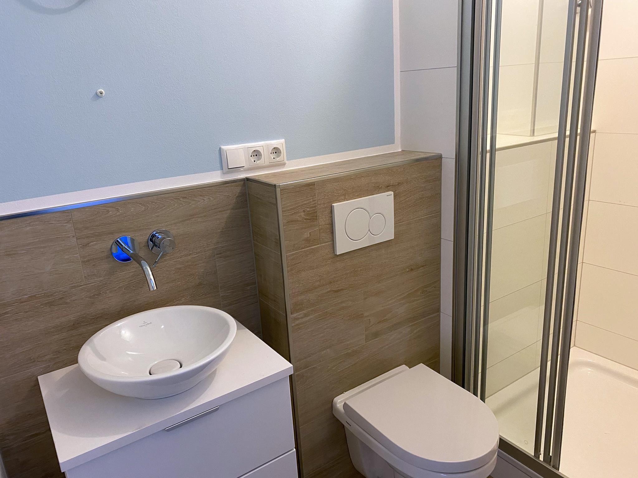 Bad: Dusche, Waschbecken, WC, Duschkabine