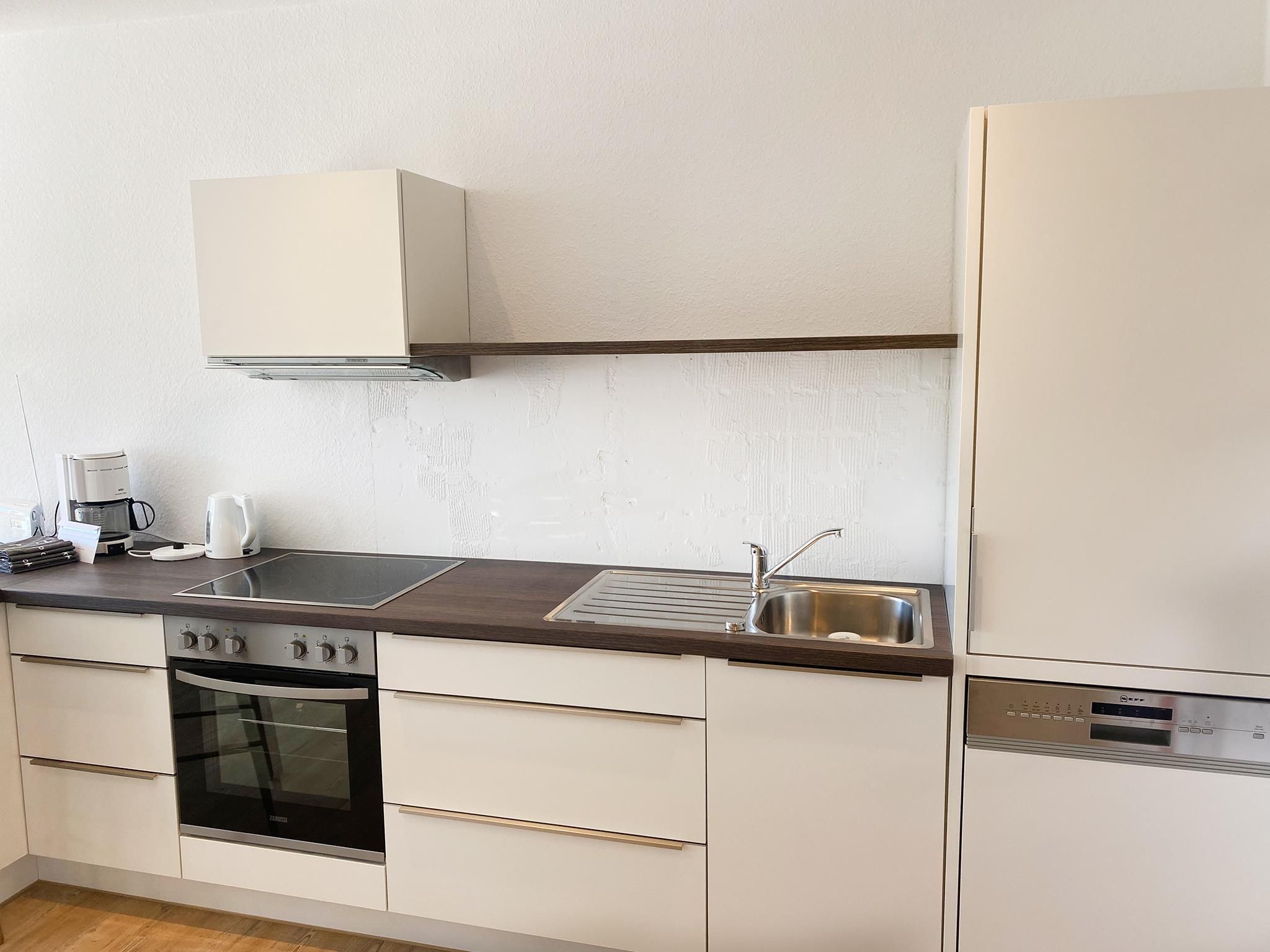 Wohnzimmer: Couch, Couchtisch, 2 Sessel, TV-Tisch, Kabel-TV, Eckschrank, 2 Schränke, Doppelschrankbett, Radio, Telefon, Esstisch, 4 Stühle, Küchenzeile, 4 Plattenherd, Dunstabzugshaube, Kühlschrank mit Gefrierfach Kaffeemaschine, Wasserkocher, Toaster, Geschirr, Kochtöpfe