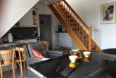 Des weiteren gibt es eine gut ausgestattete Kochnische mit Mikrowellenherd, Esstresen sowie einer Wendeltreppe hoch in die Schlafräume.