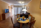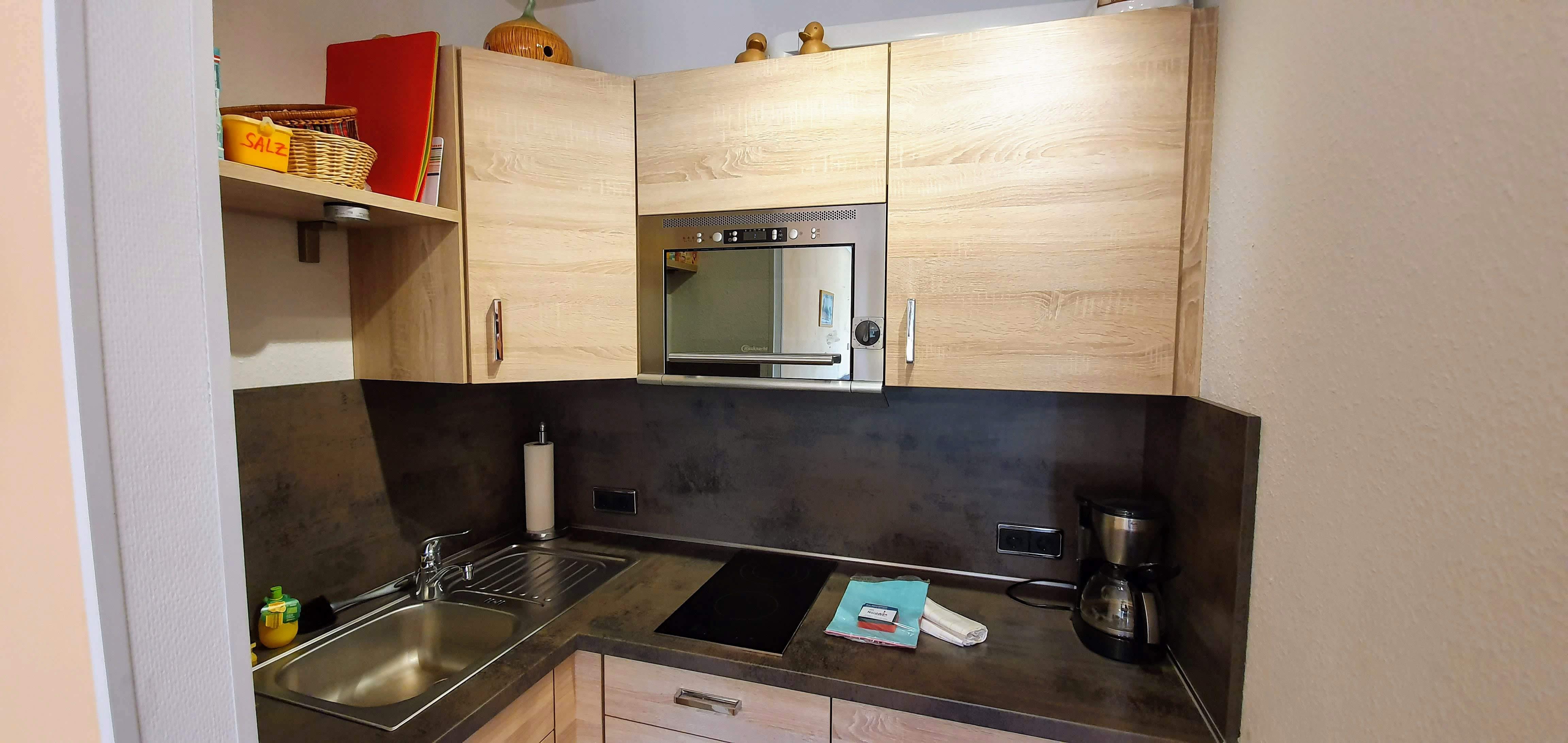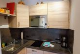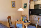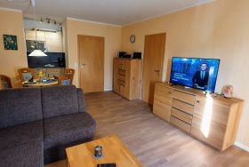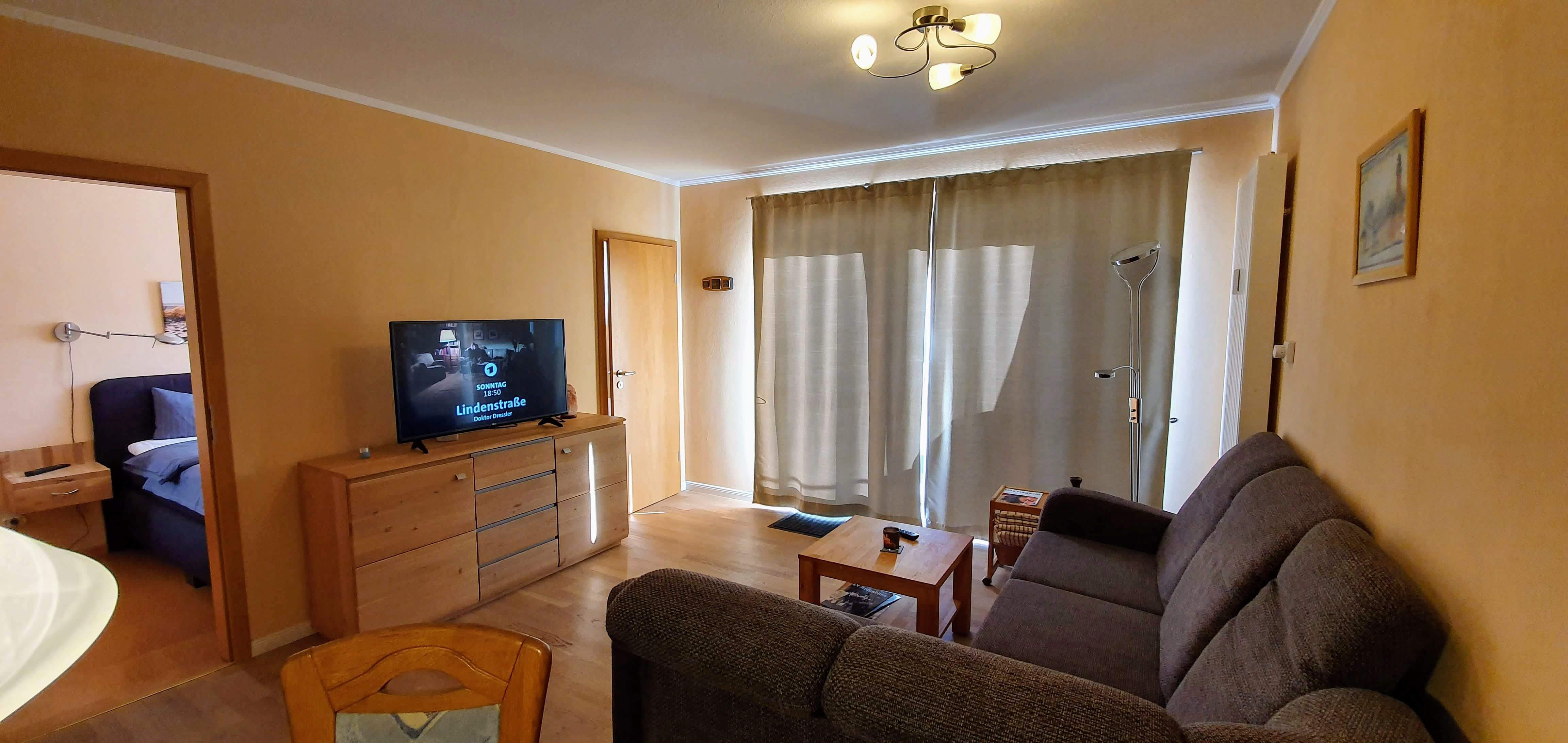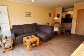 • Sehr schönes Wohnzimmer mit gemütlicher Sitzecke, Flachbildschirm-TV, Esstisch und einer kleinen Einbauküche mit Mikrowelle, Kühlschrank mit Eisfach, Balkon