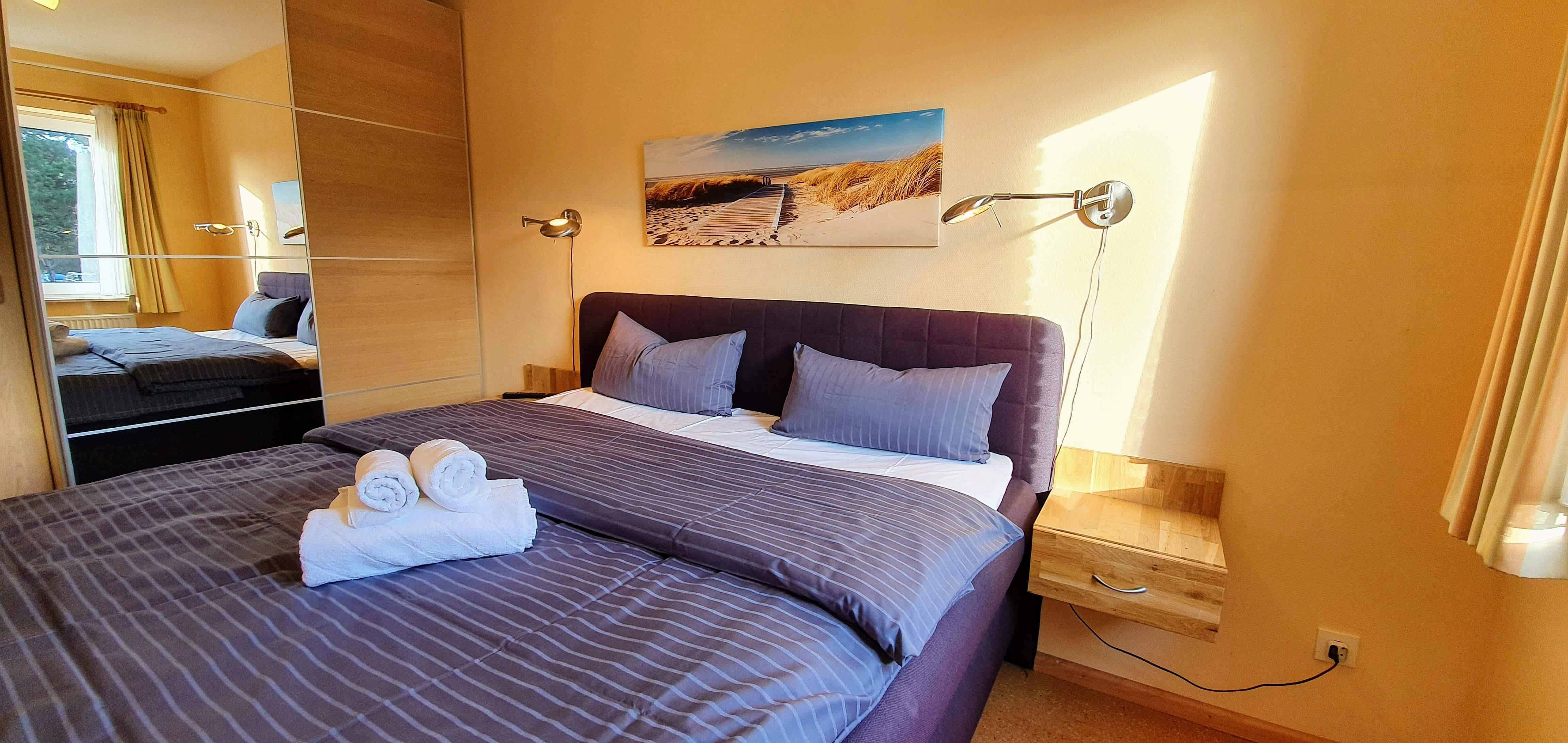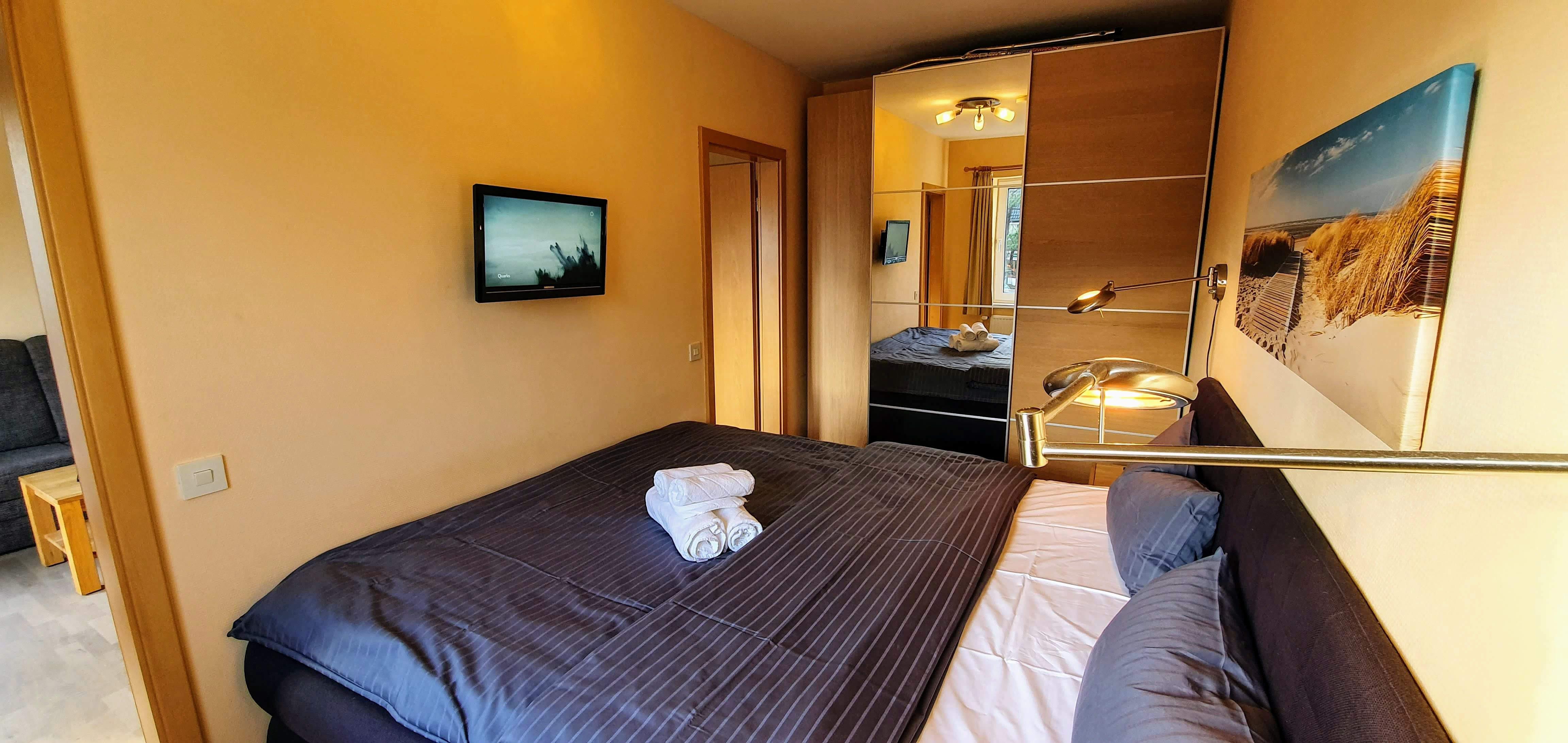 • Schlafzimmer mit 1 Doppelbett 180cmx200cm und Flachbildschirm-TV, Kleiderschrank