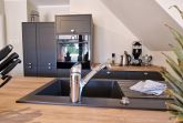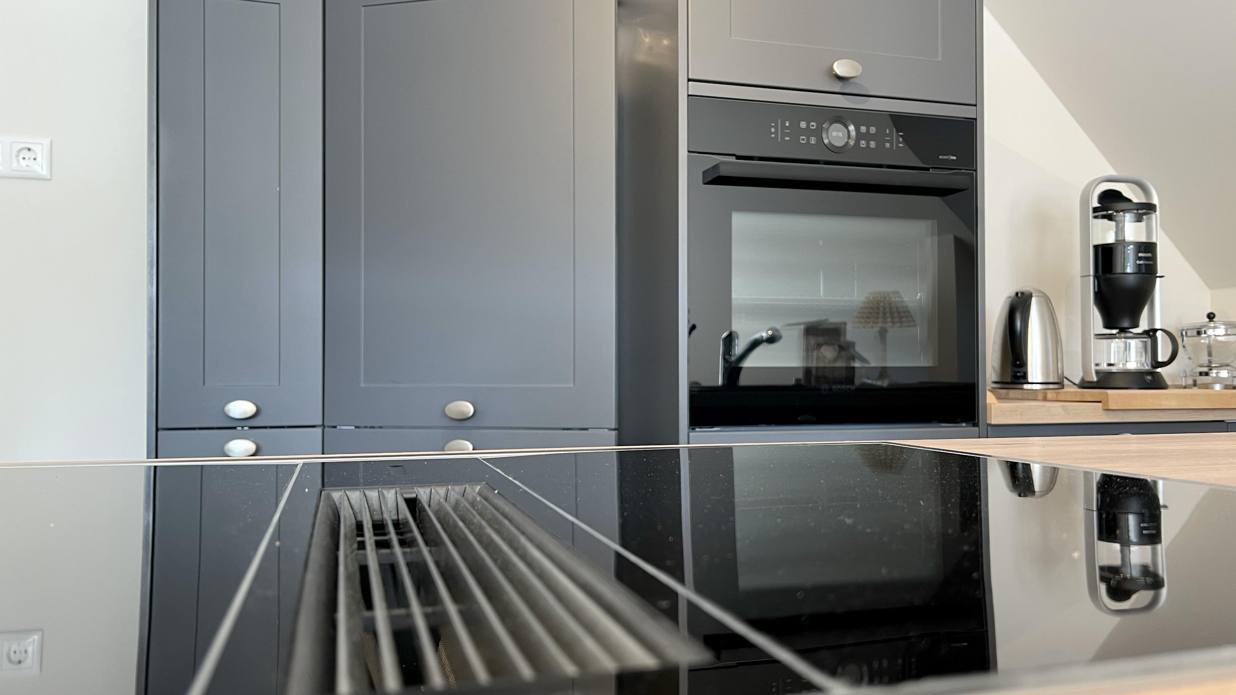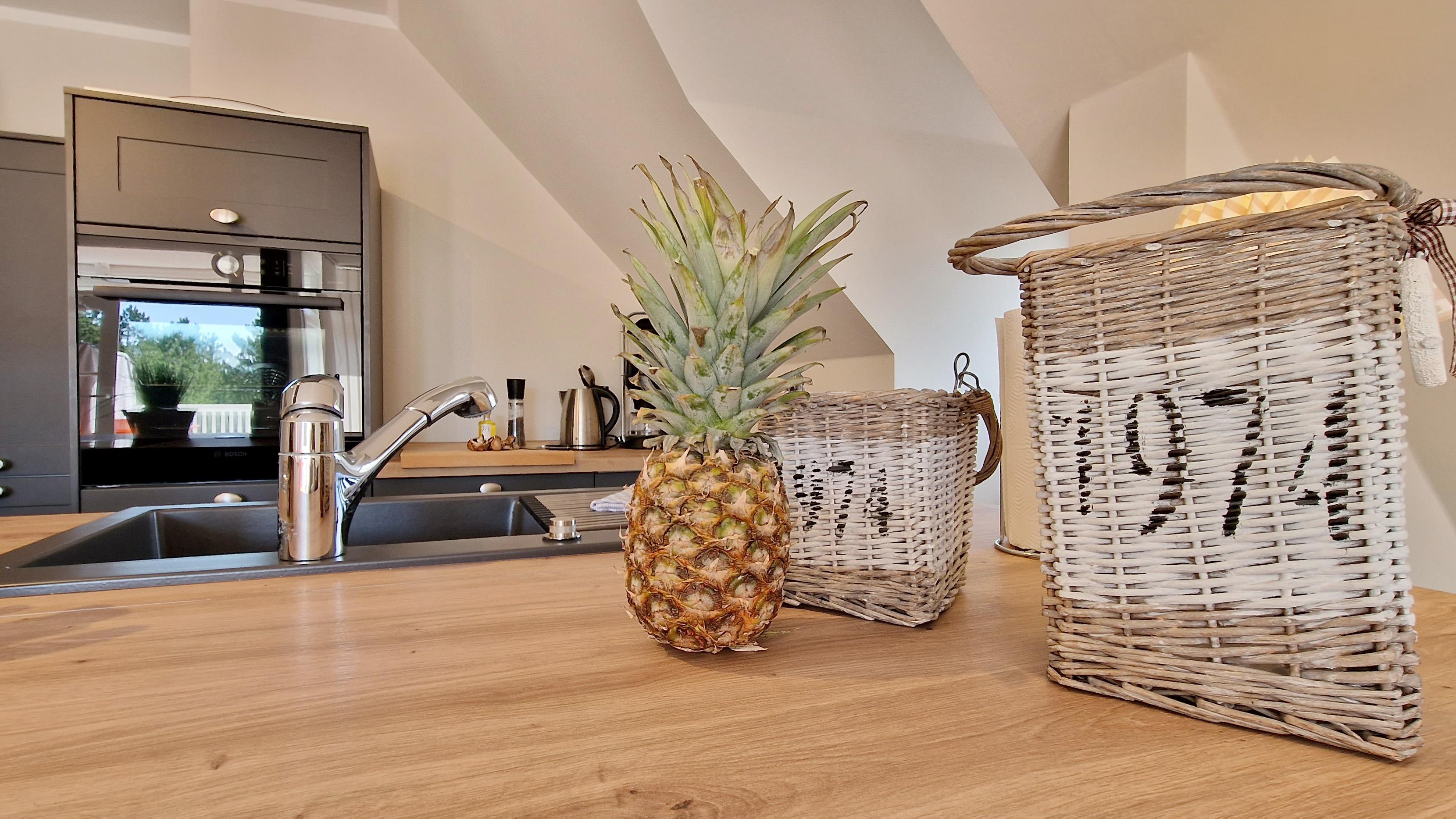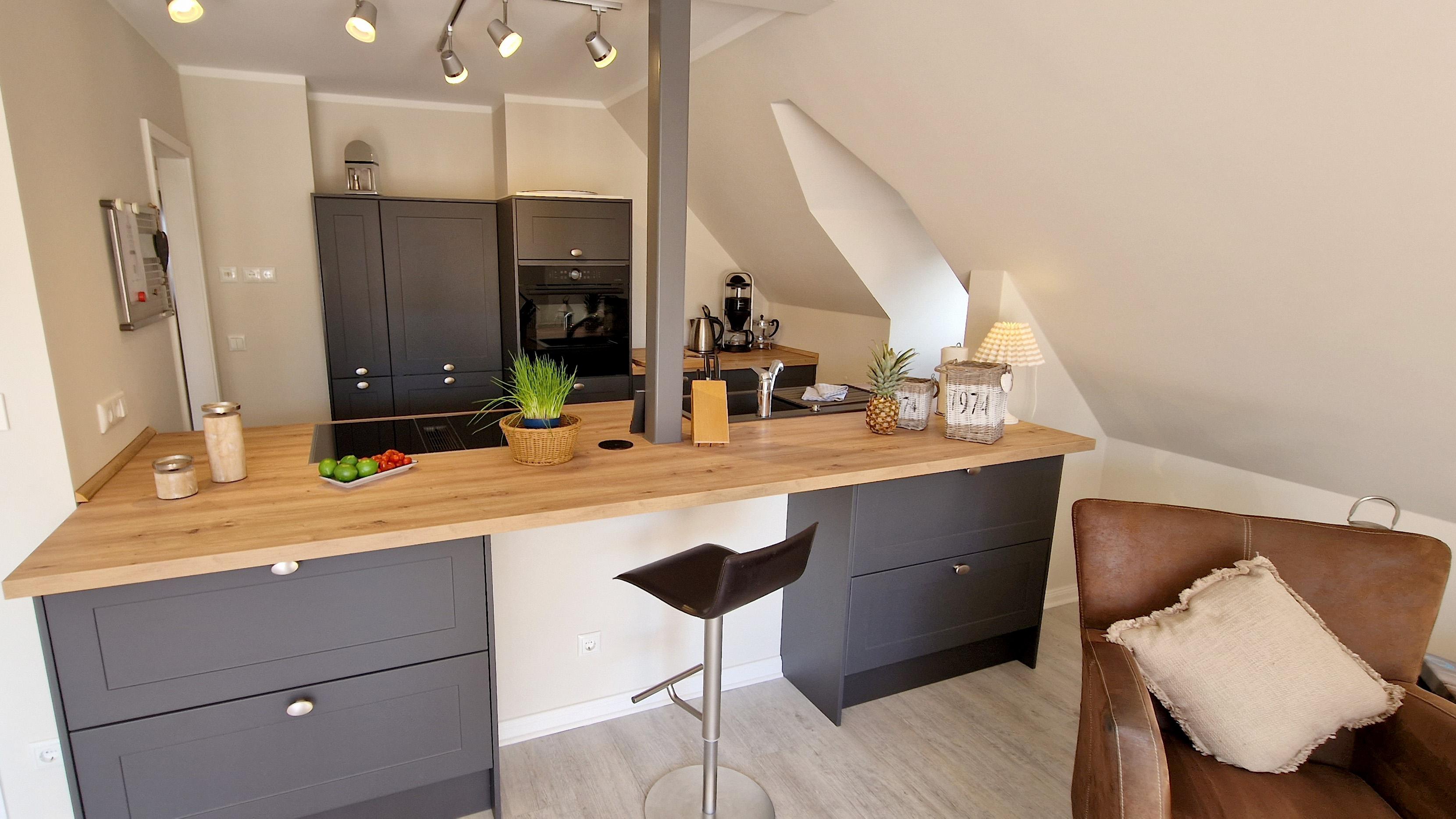 Küche: Einbauküche, 4 Plattenherd mit Backofen, Kühlschrank, Spülmaschine, Mikrowelle, Kaffeemaschine, Wasserkocher, Toaster, Handmixer, Geschirr, Kochtöpfe, Durchreiche zum Wohnzimmer, Nachtspeicherofen