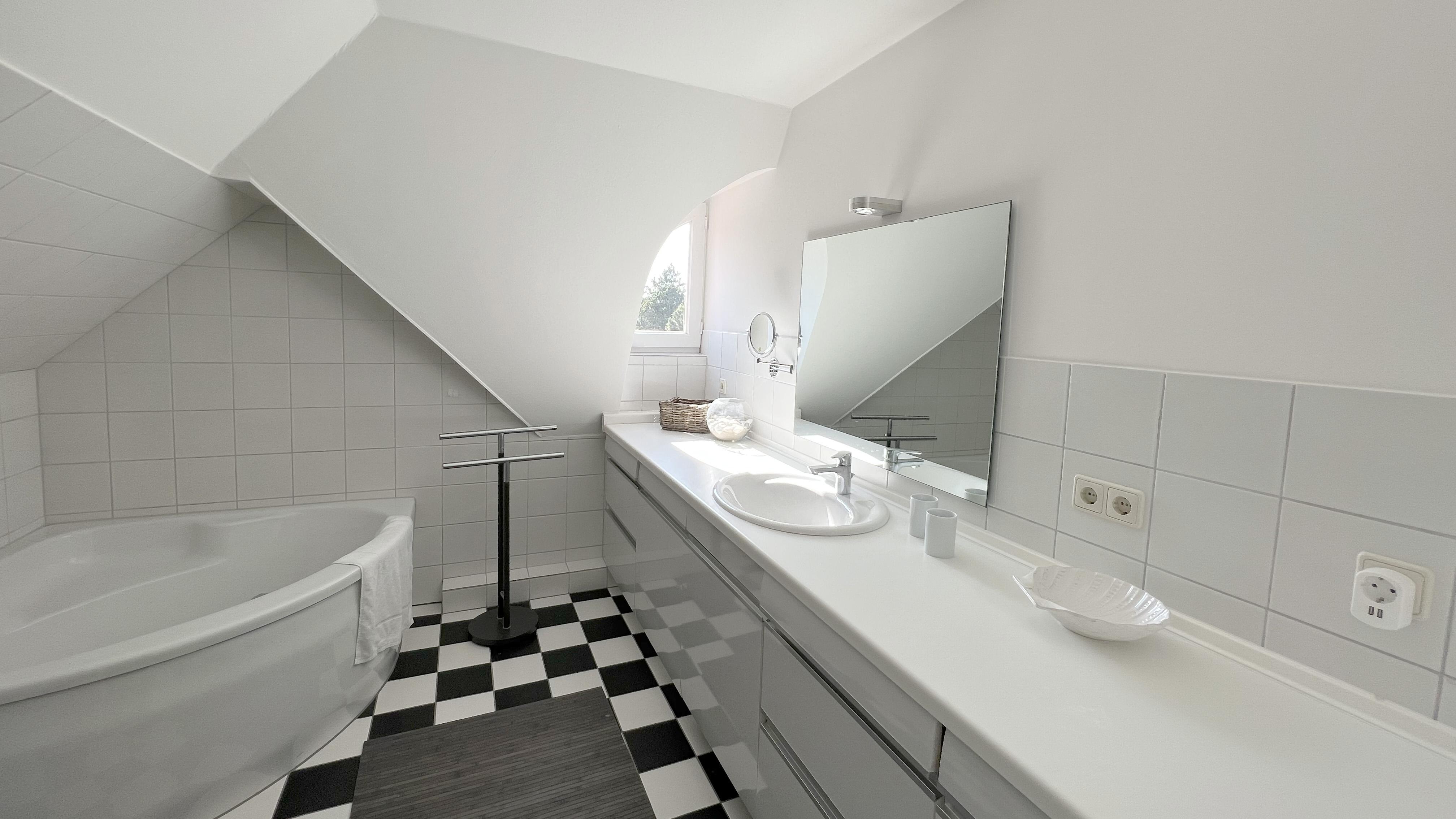 Bad 2: Eckbadewanne, Waschtisch, WC, Hocker, Nachtspeicherofen, Radio, Fön