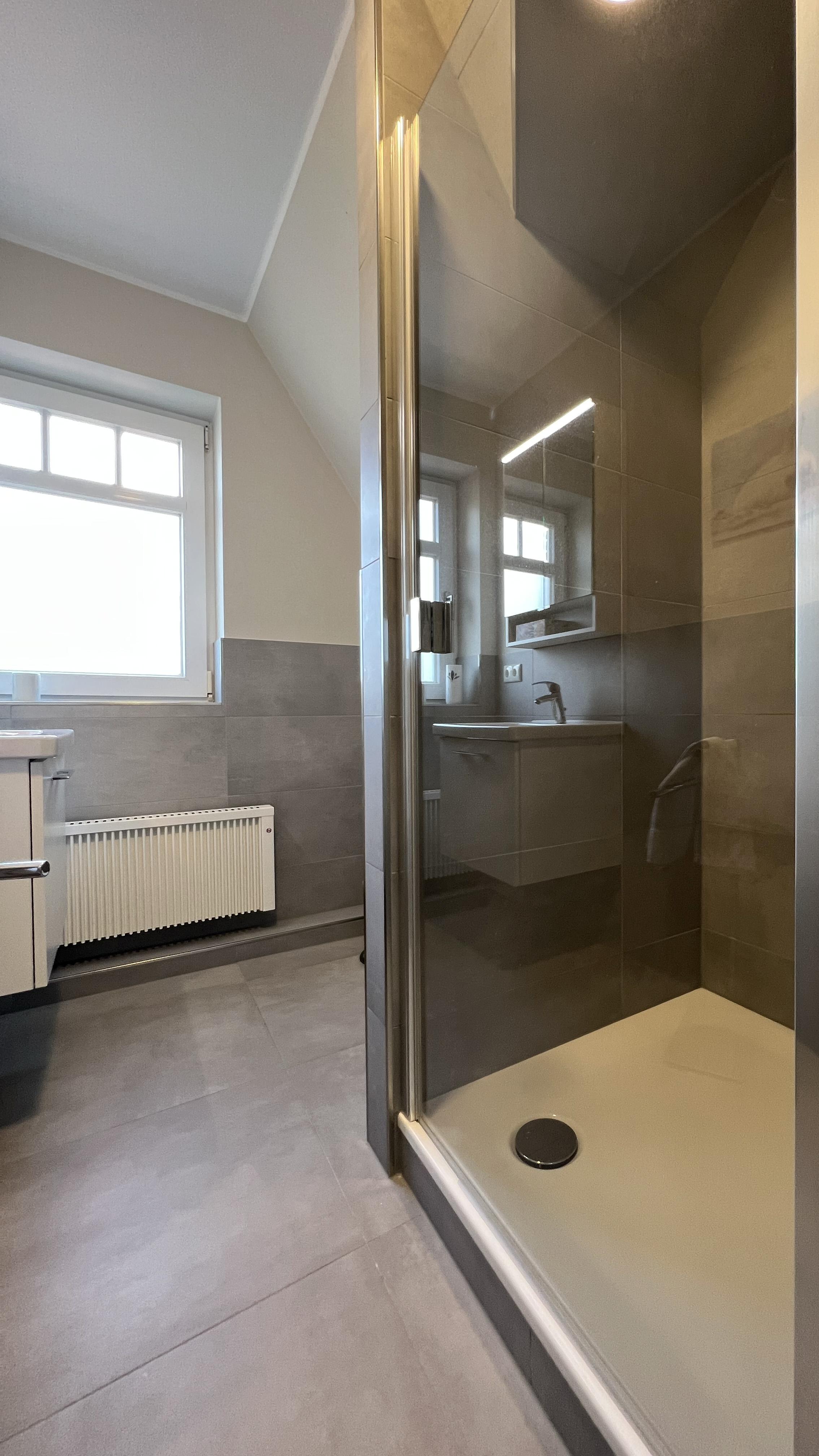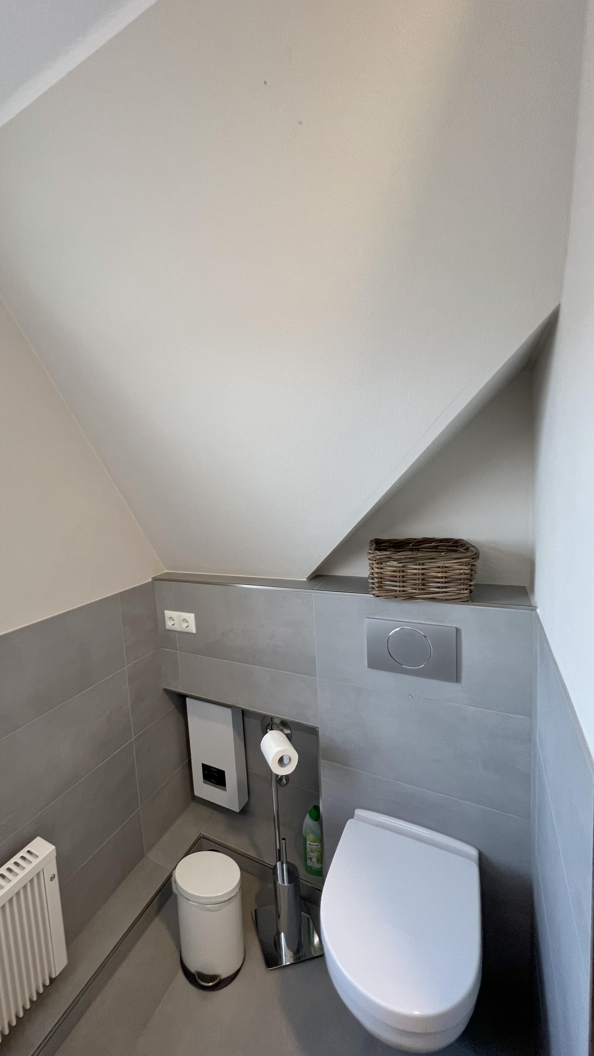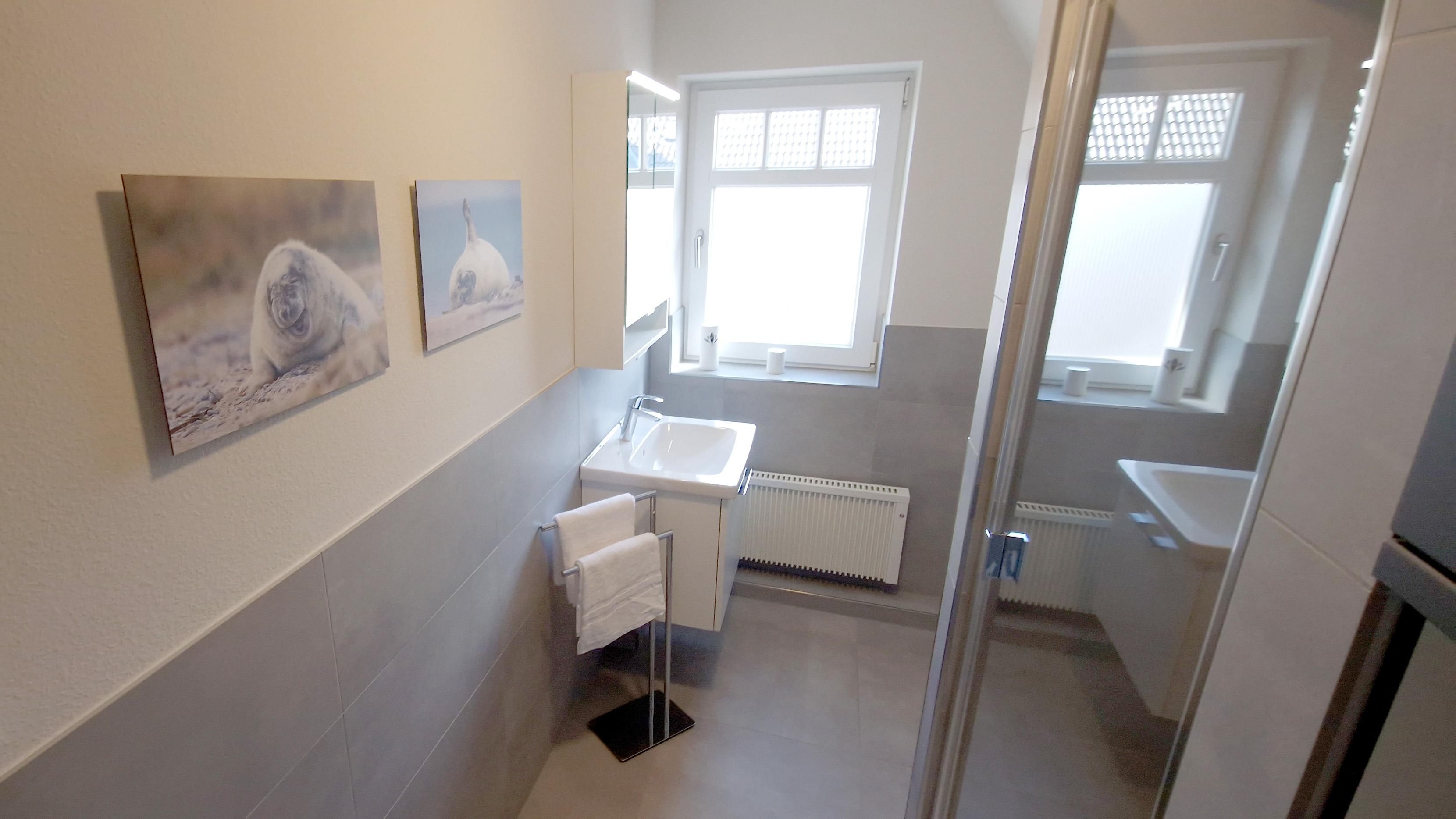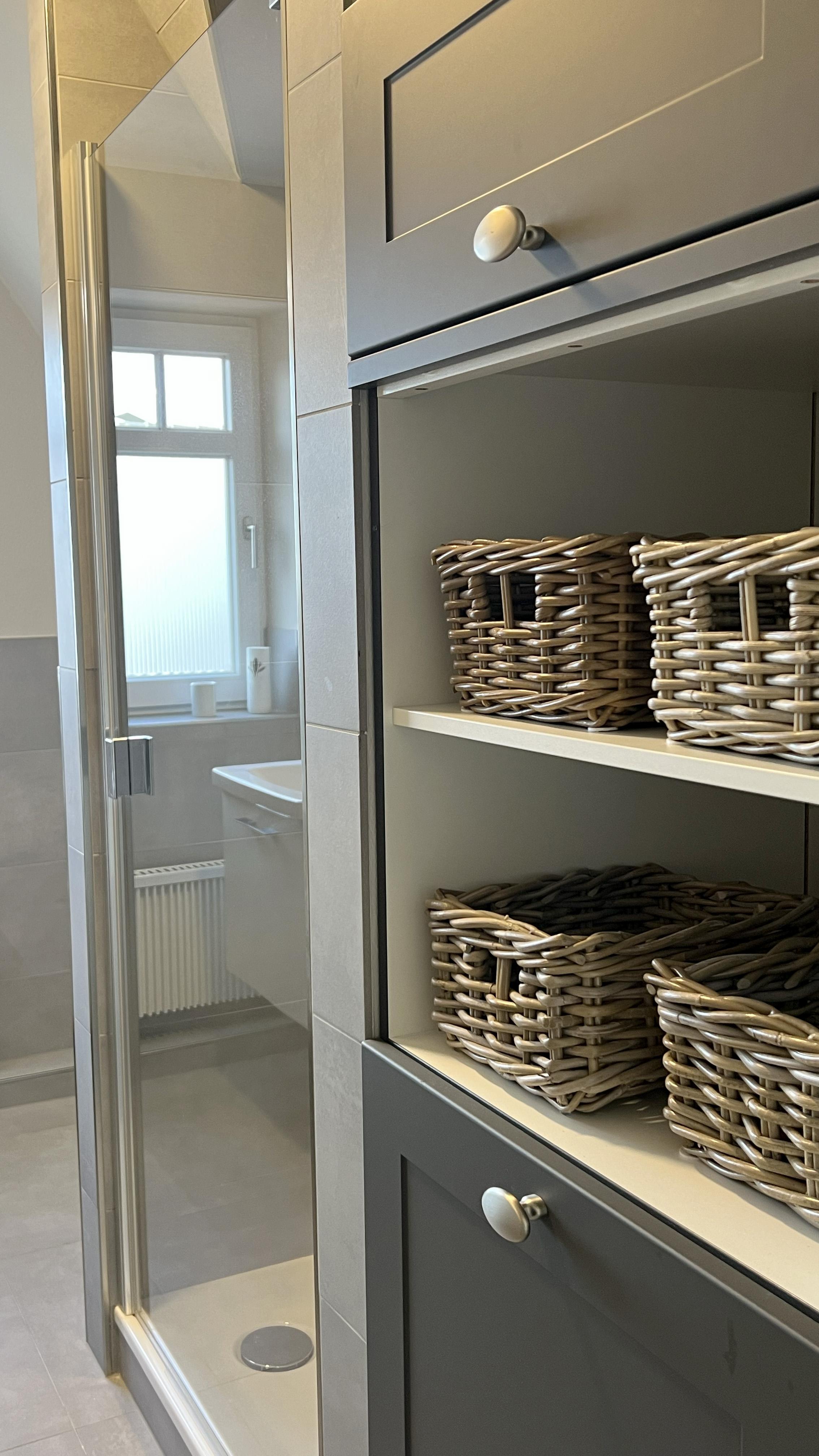 Bad: Dusche, Waschbecken, WC, Rollwagen, Regal, Staubsauger, Duschkabine, Hocker, Kosmetikspiegel