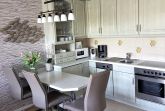 Wohnzimmer: 2 Couch, Couchtisch, Sessel, Ecktisch, Tischlampe, Nachtspeicherofen, Schrankwand, Schrank, TV-Schrank, Schrankdoppelbett, Kabel-TV, Flachbildschirm, Stereoanlage mit CD-Player, Esstisch, 4 Stühle, Küchenzeile, 4 Plattenherd mit Ceranfeld und Backofen, Dunstabzugshaube, Kühlschrank, Spülmaschine, Mikrowelle, Kaffeemaschine, Wasserkocher, Toaster, Eierkocher, Geschirr, Kochtöpfe