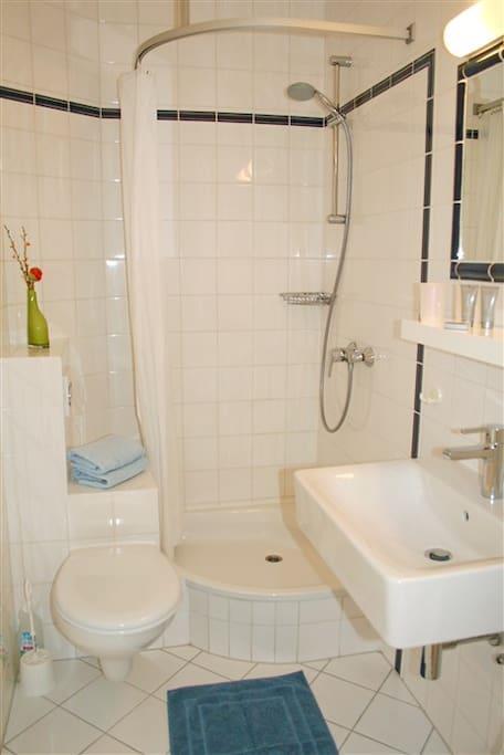 • komplett eingerichtete Küche, Mikrowelle, Geschirrspüler, Kühlschrank mit Gefrierfach, Wasserkocher, Kaffeemaschine (Filter), Toaster.