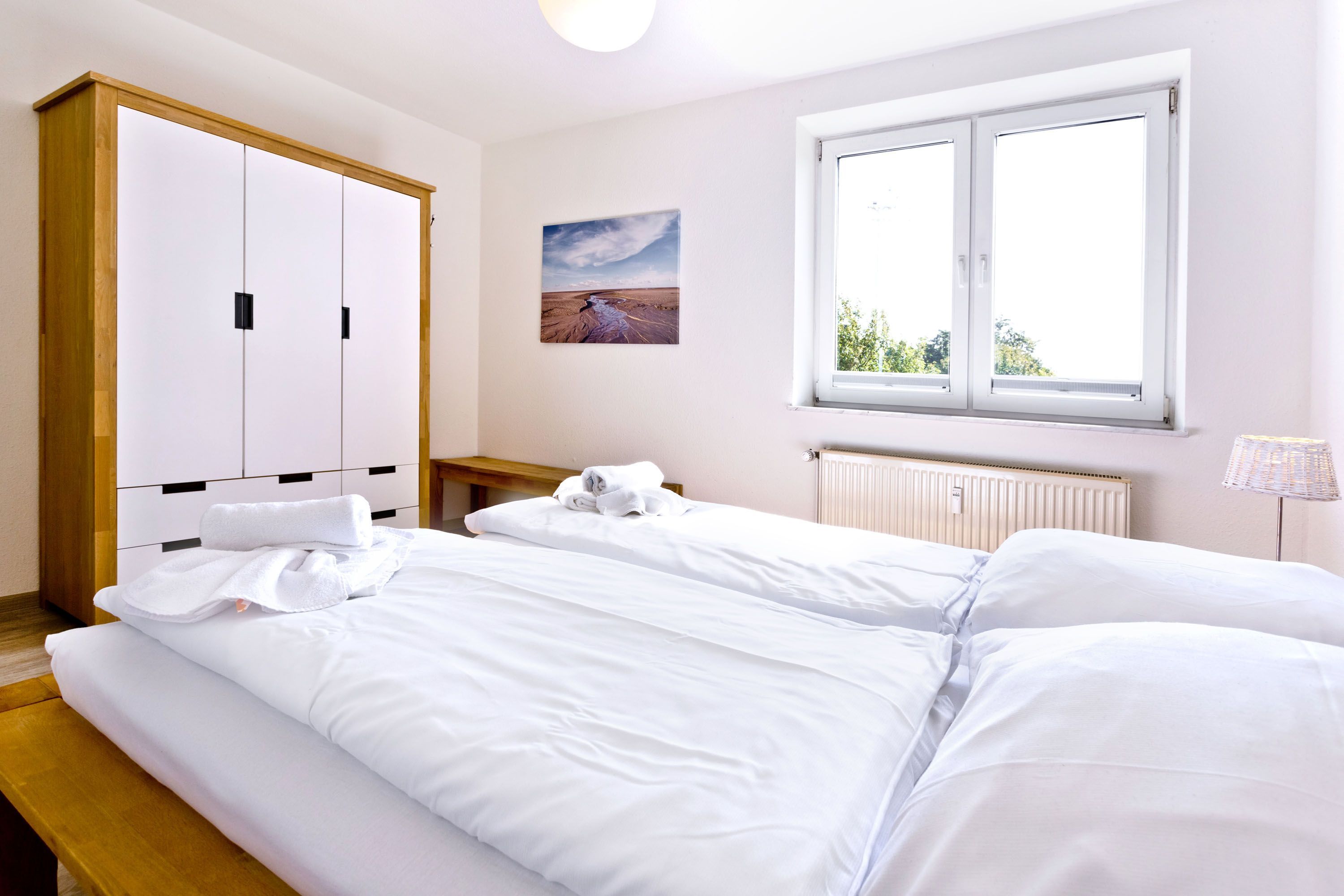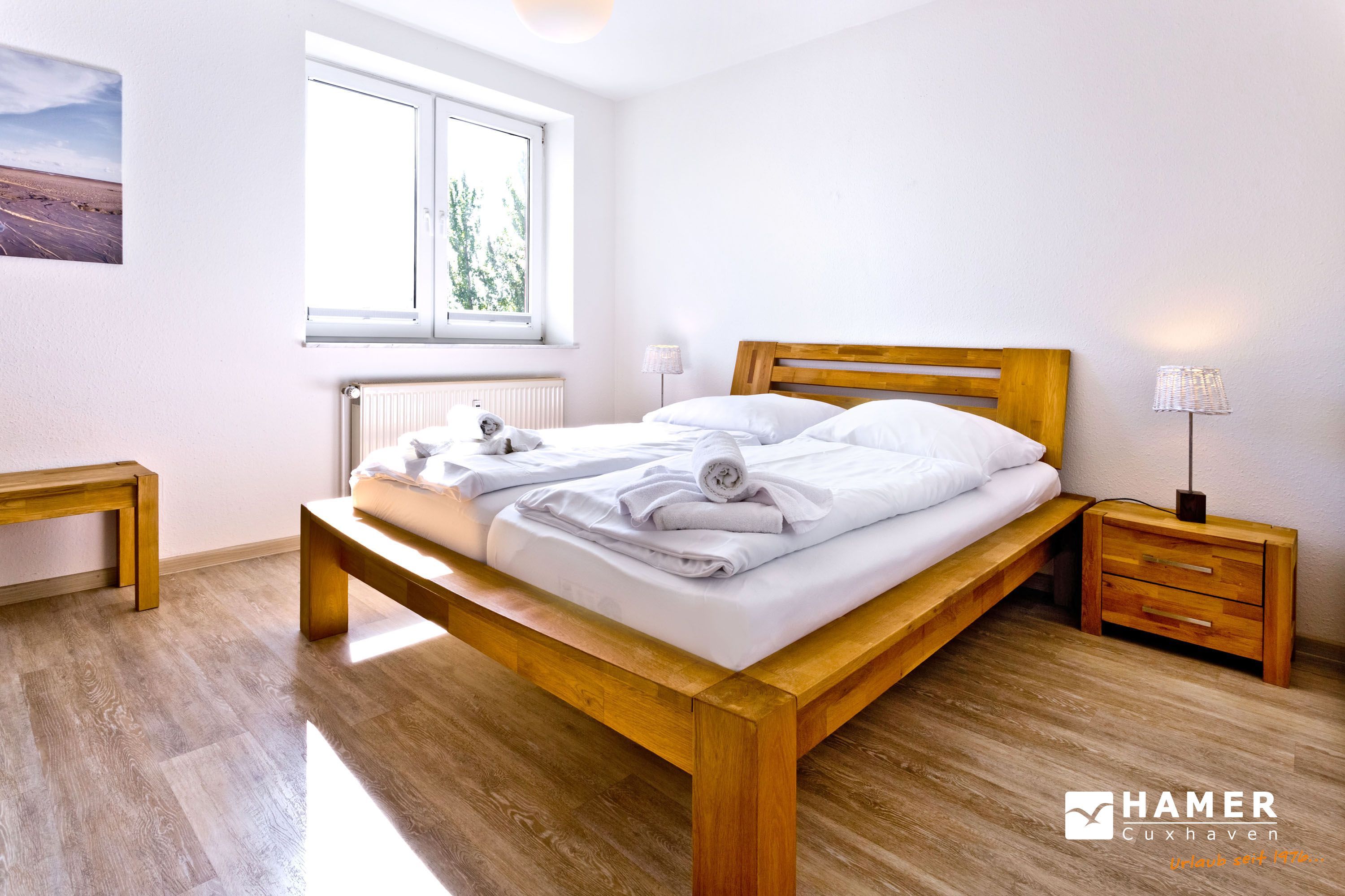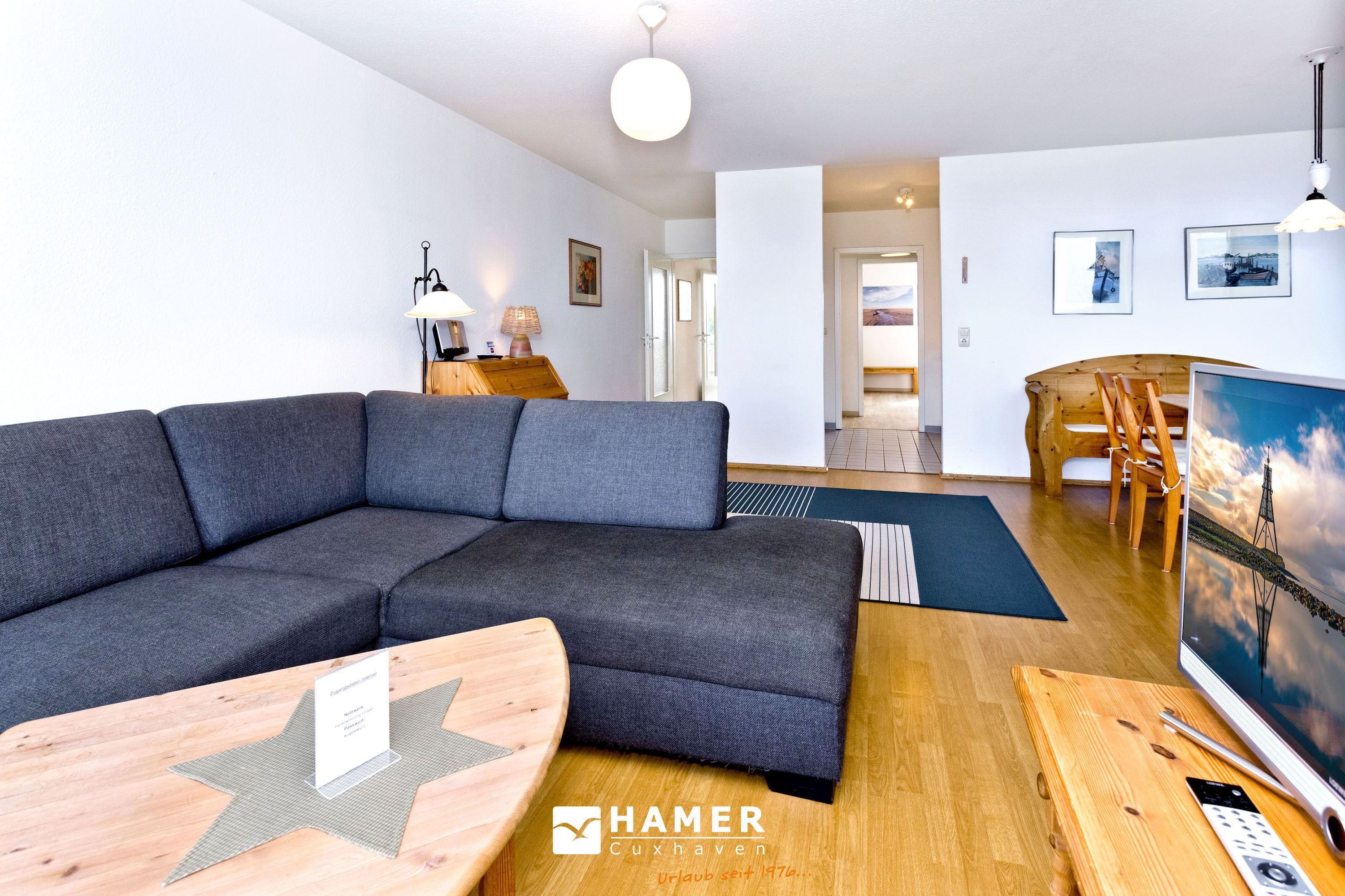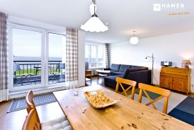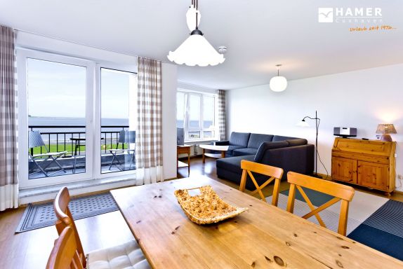 Großzügige 2-Raum-Wohnung für 2 Personen auf der 1. Etage (mit Aufzug) mit voller Seesicht bis hin zur Kugelbake. Wohnzimmer mit großzügigem Sofa, Kabel-TV, Radio, und Essplatz. Separate Küche inkl. Geschirrspüler, kleiner überdachter Balkon zur See (Nordseite), großes Schlafzimmer, Bad/Dusche/WC, kostenfreies W-lan, Stellplatz #13 auf dem Außengelände. Nichtraucher und keine Haustiere.