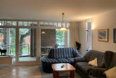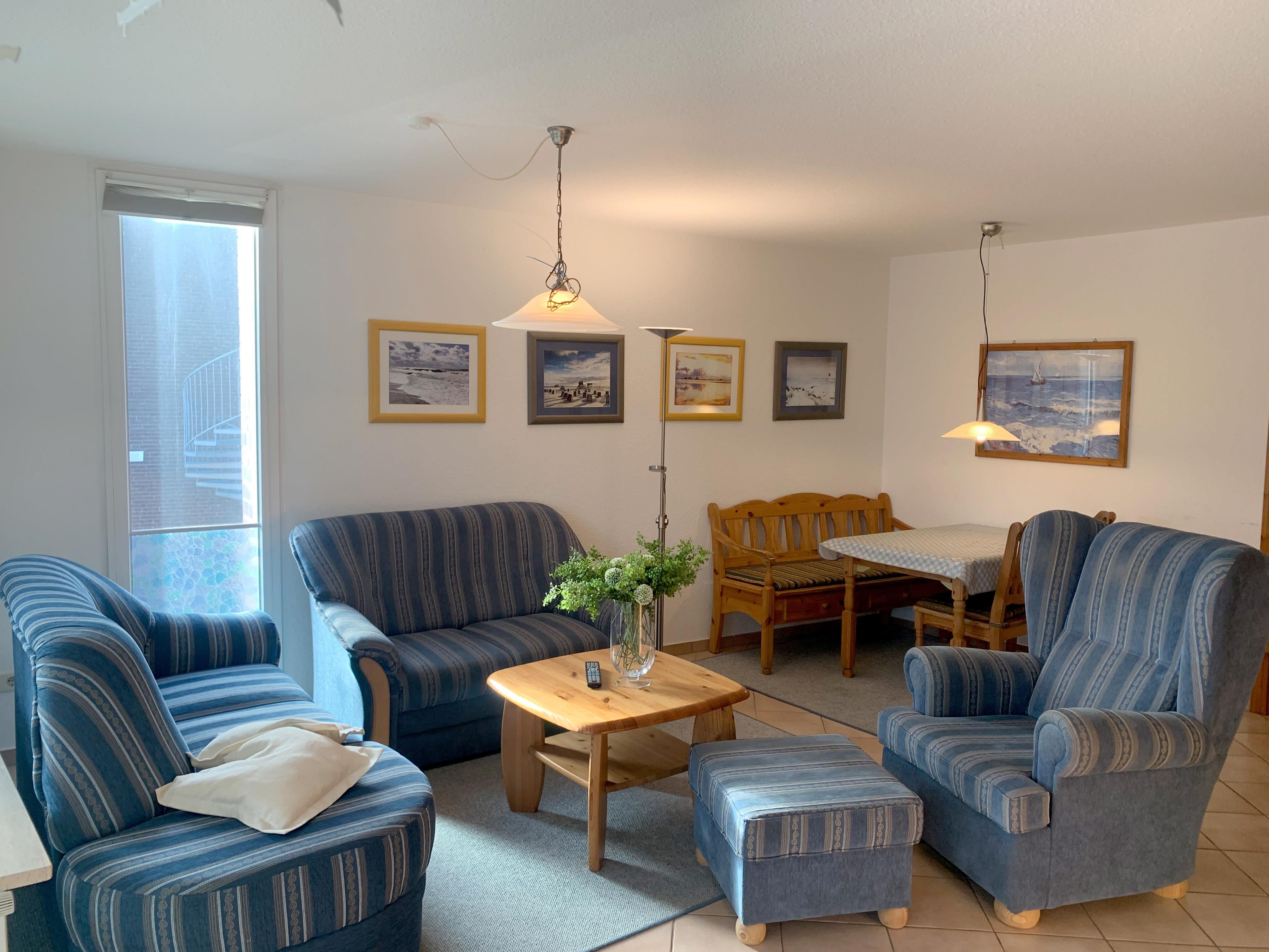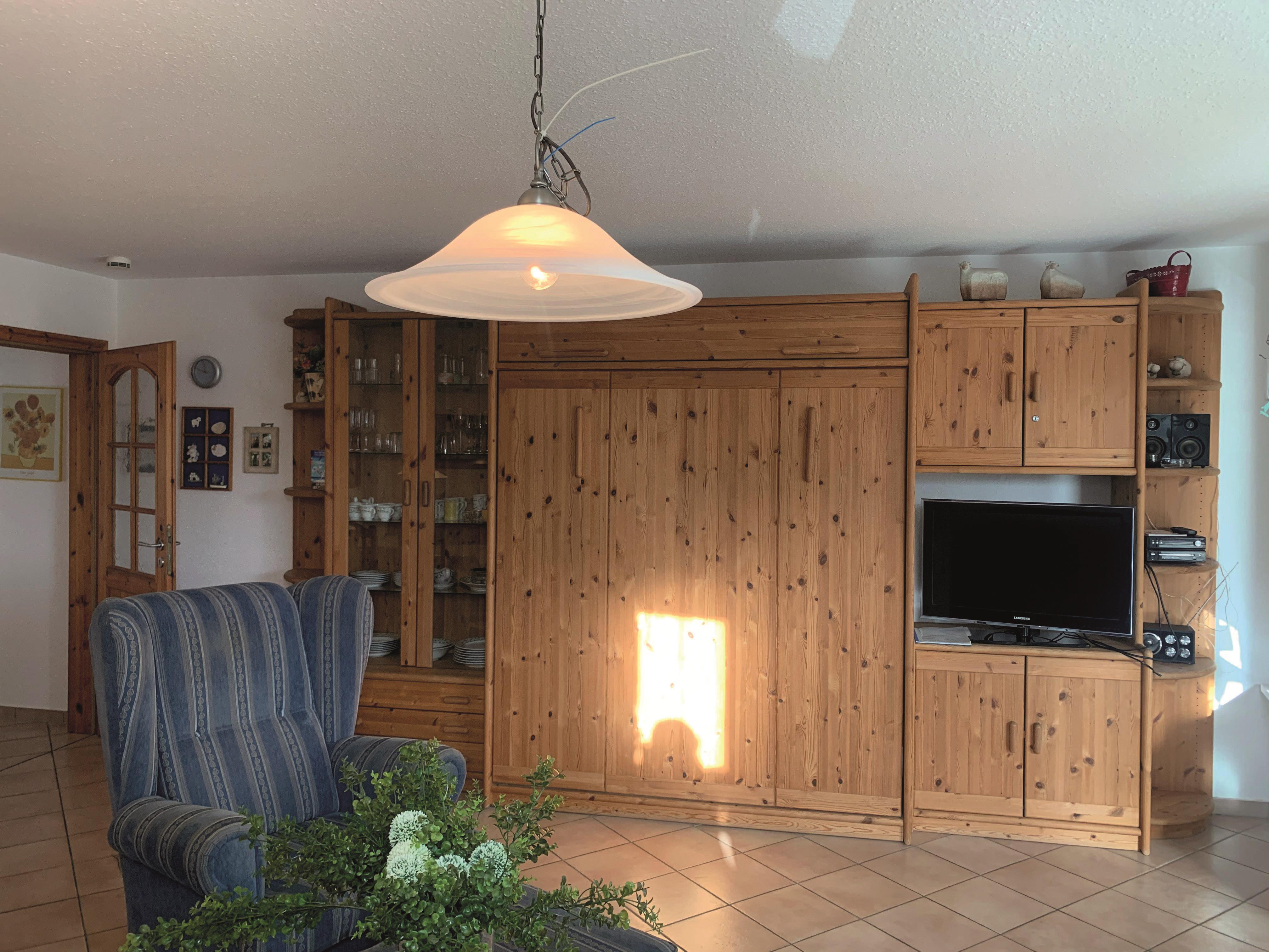 Wohnzimmer: 2 Couch, Couchtisch, Hocker, Sessel, Stehlampe, Vitrine, TV-Schrank, Schrankdoppelbett, Kabel-TV, Flachbildschirm, Stereoanlage mit CD-Player, Sitzbank, Esstisch, 2 Stühle